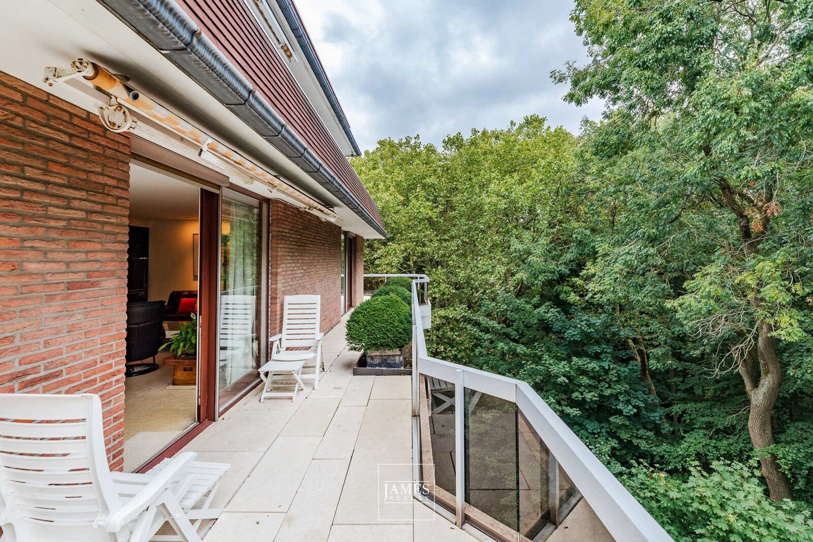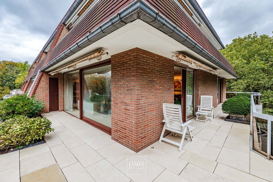 De terrassen (totaal ±110 m²) omringen het appartement aan drie gevels en bieden prachtige, vrije zichten op het park en de omgeving.