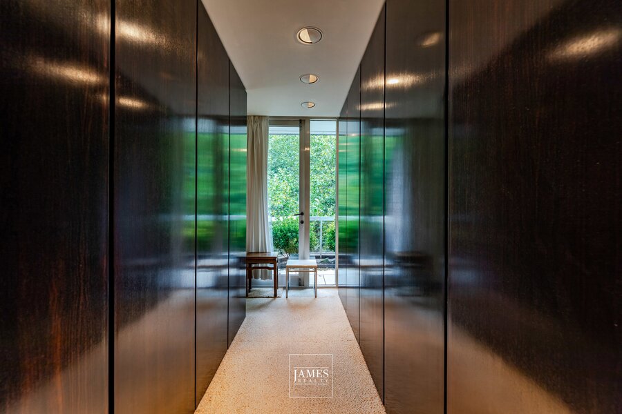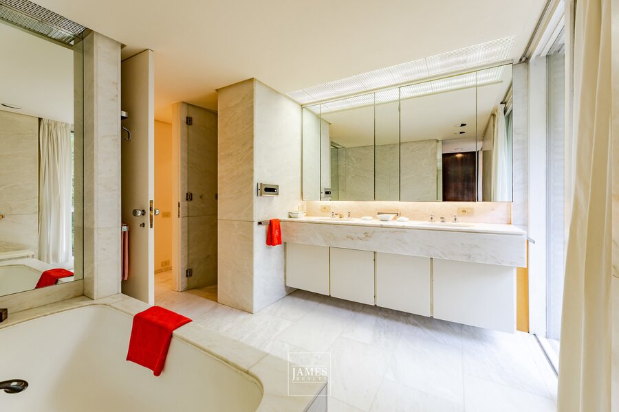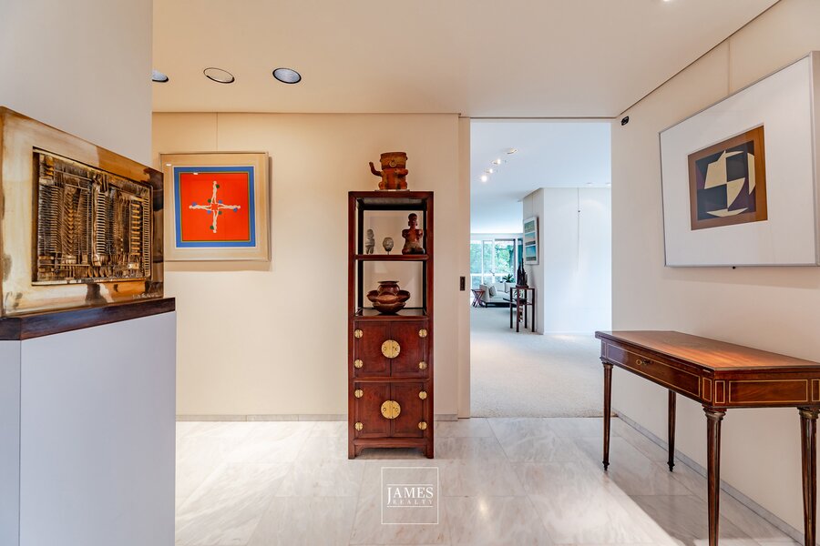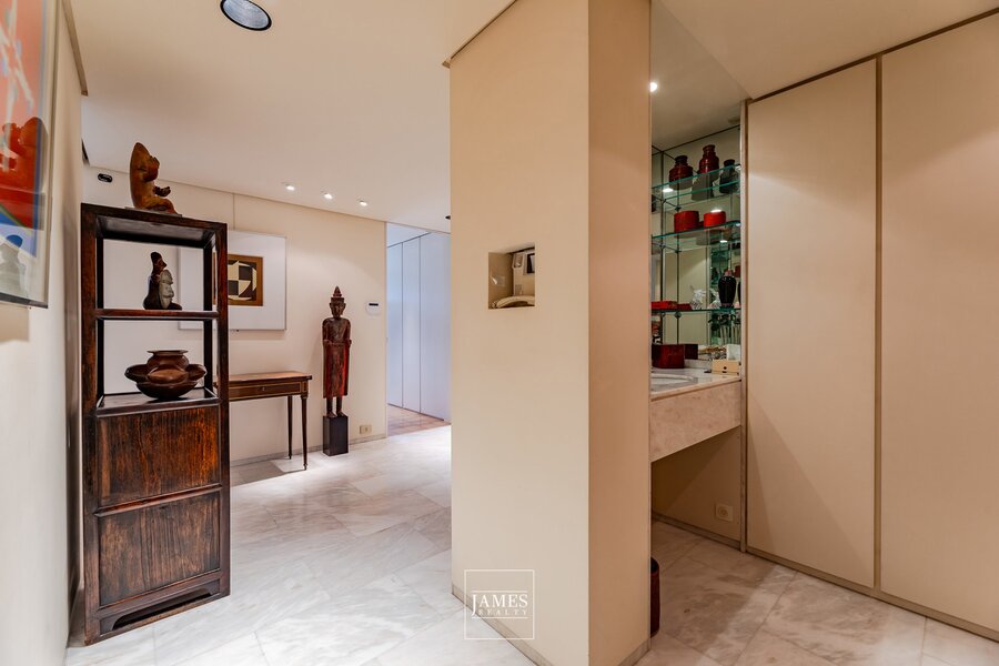 Een tweede onafhankelijke ingang geeft toegang tot een grote studio (keuken, slaapkamer, badkamer), intern verbonden met het hoofdappartement — ideaal voor professioneel gebruik, personeel of een privégastenkamer.