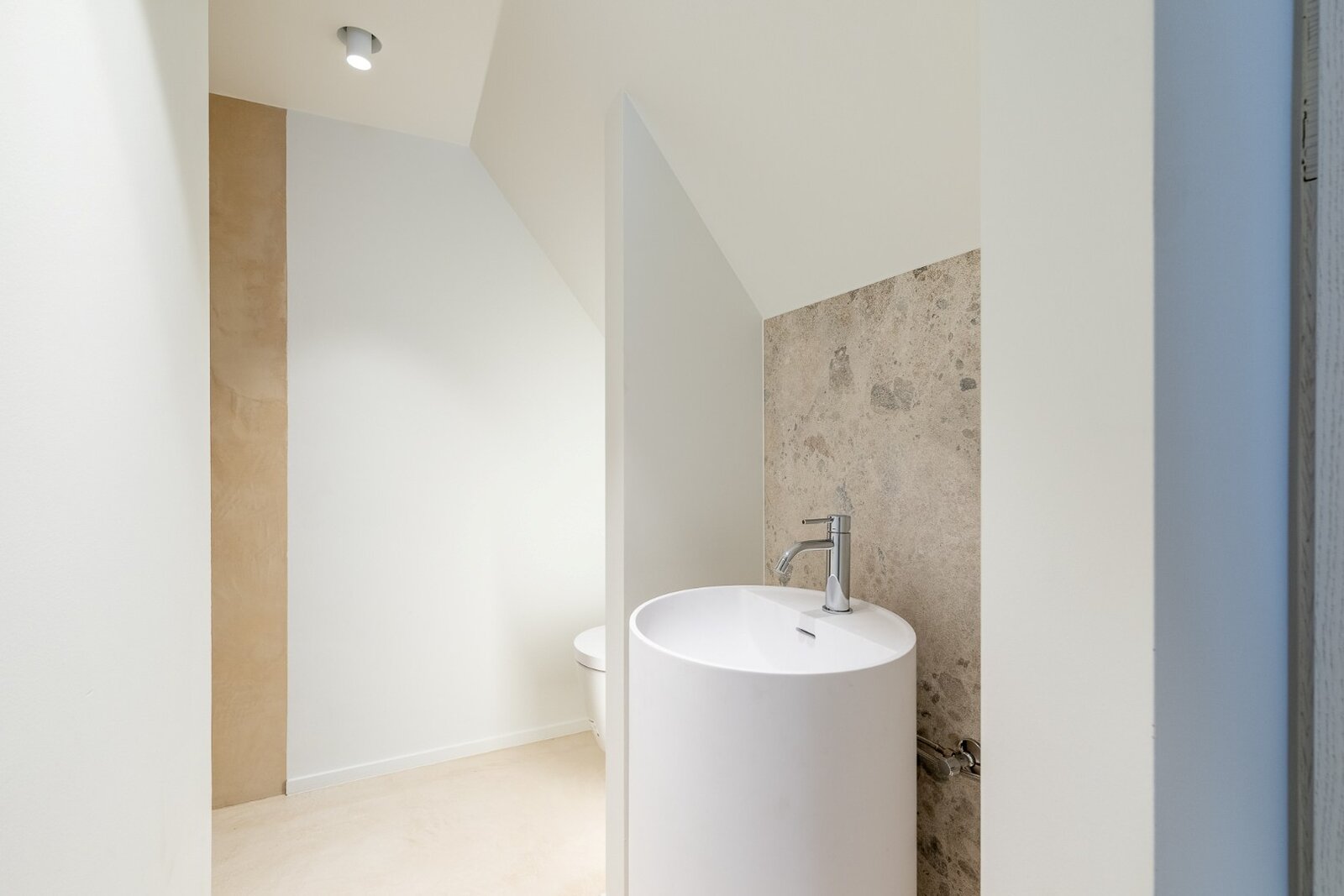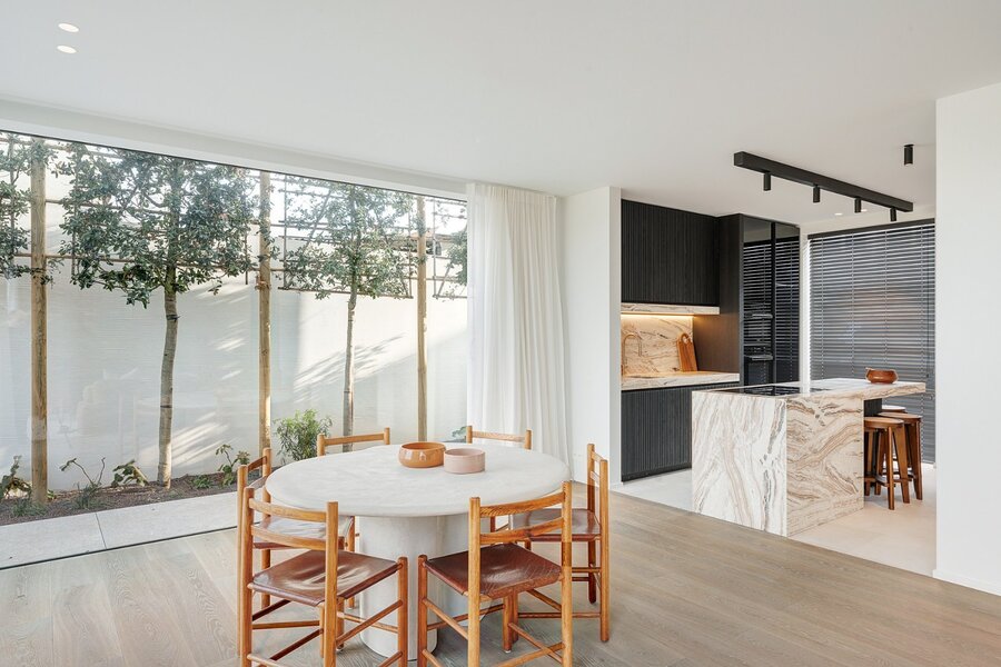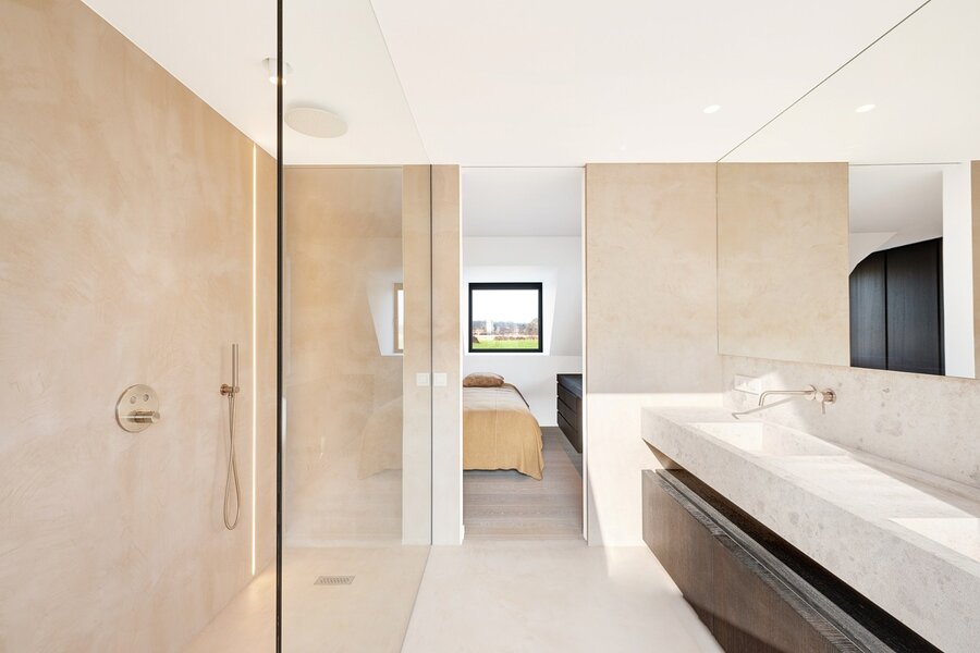 Het gelijkvloers, met een oppervlakte van ongeveer 100m², omvat een ruime inkomhal met vestiaire en gastentoilet. De lichtrijke leefruimte met zit- en eethoek geniet van minimal windows en een mooie plafondhoogte met unieke zichten op de polders. Aansluitend bevindt zich de luxueuze open keuken met aangename ontbijthoek.