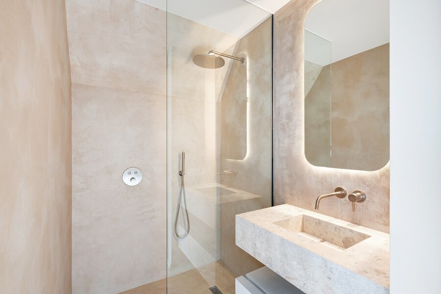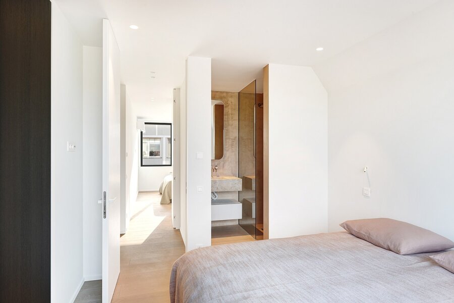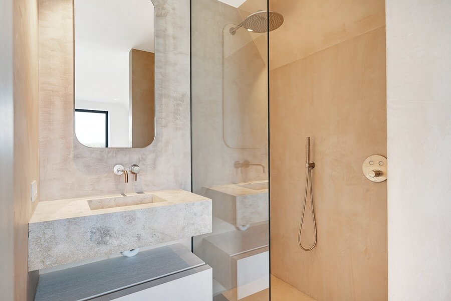 De eerste verdieping, van circa 97m², beschikt over drie volwaardige slaapkamers, elk voorzien van eigen bad- of douchekamer en ingemaakte kasten. De masterbedroom heeft een ensuite badkamer met dubbele lavabo, ligbad, inloopdouche en aparte wc. De tweede en derde slaapkamer beschikken elk over een ensuite douchekamer en ingemaakte kasten. Aparte toilet op de nachthal.