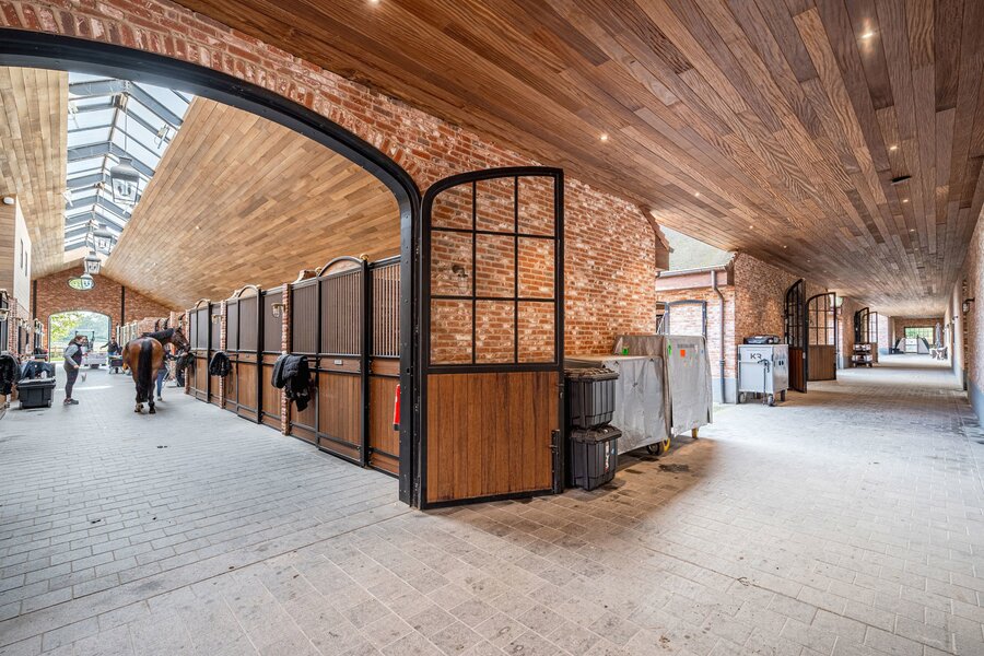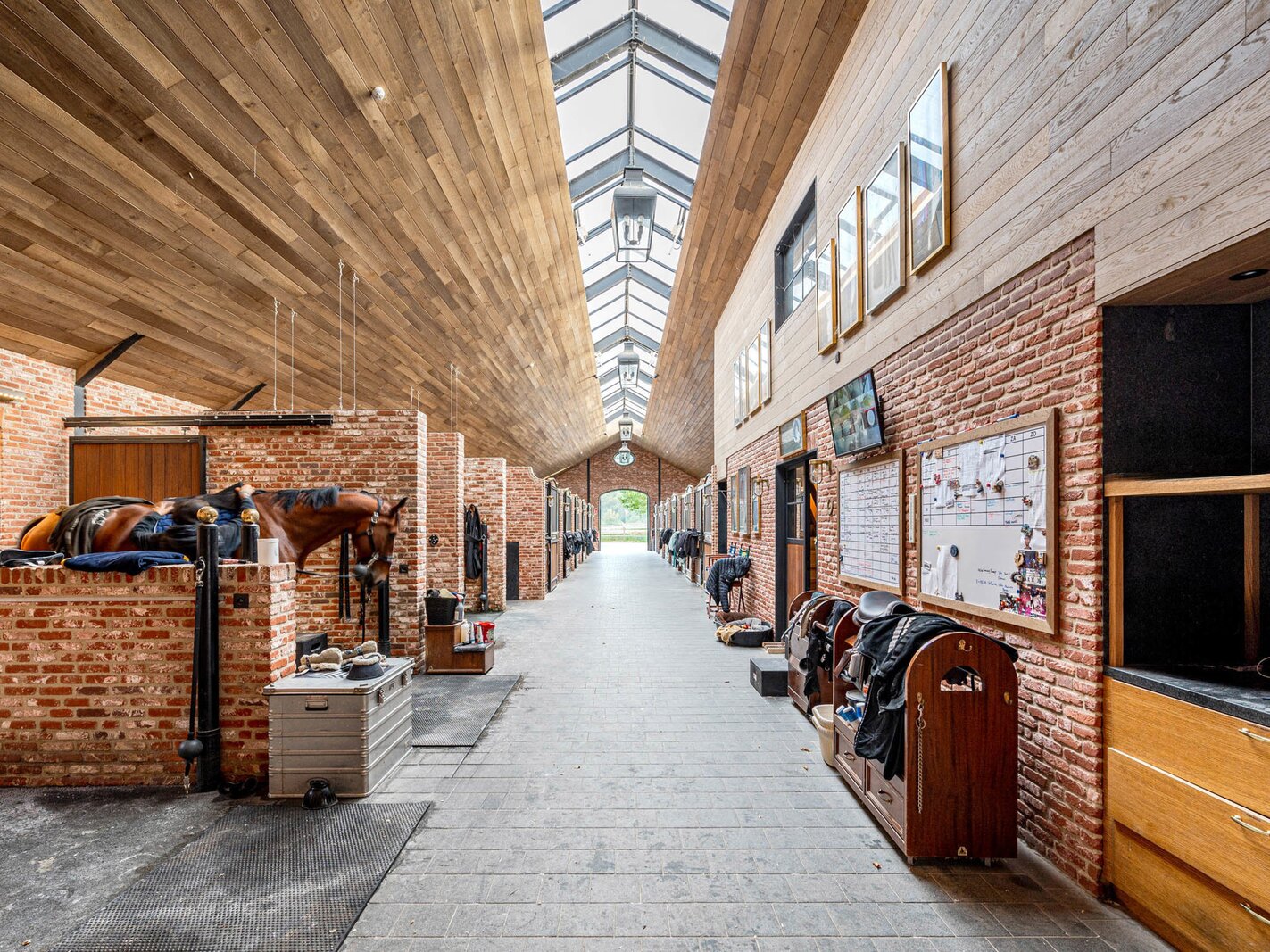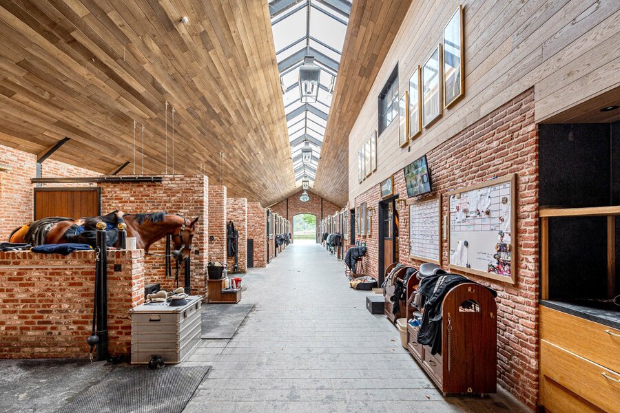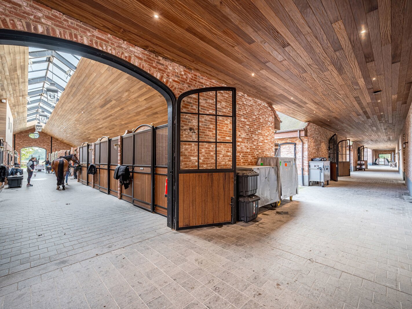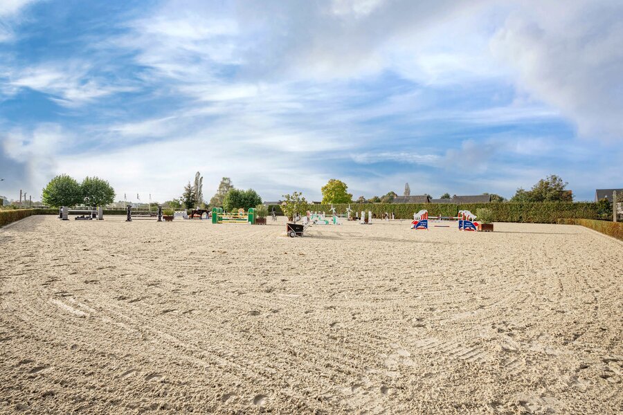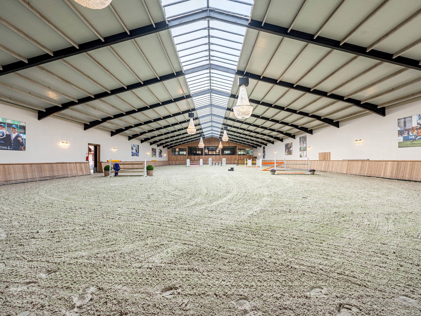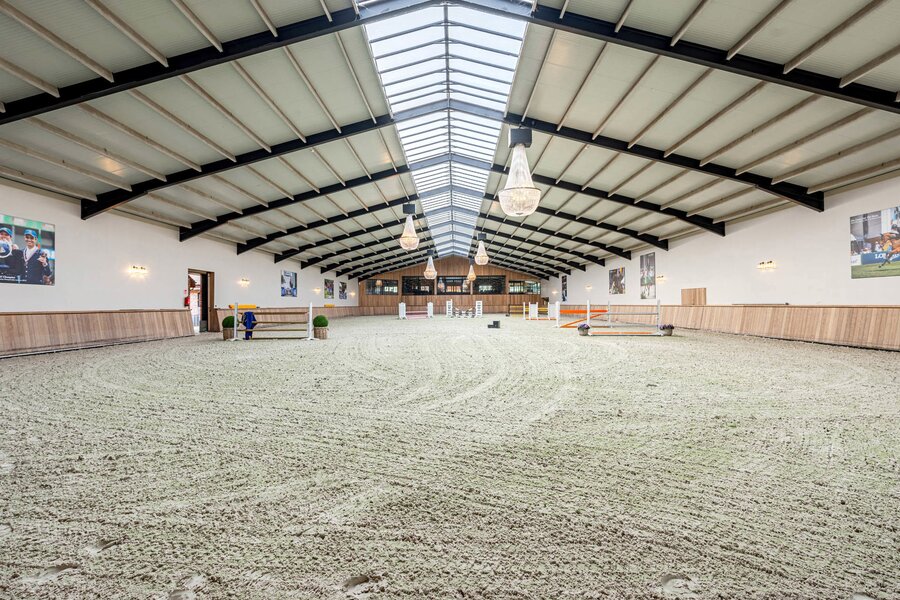 De elegante stalgebouwen herbergen luxueuze boxen met privé-poetsplaatsen en zadelkamers. Het domein beschikt over twee stijlvolle binnenpistes en royale buitenpistes, perfect onderhouden voor optimale prestaties.