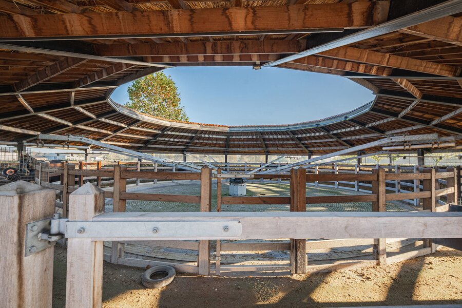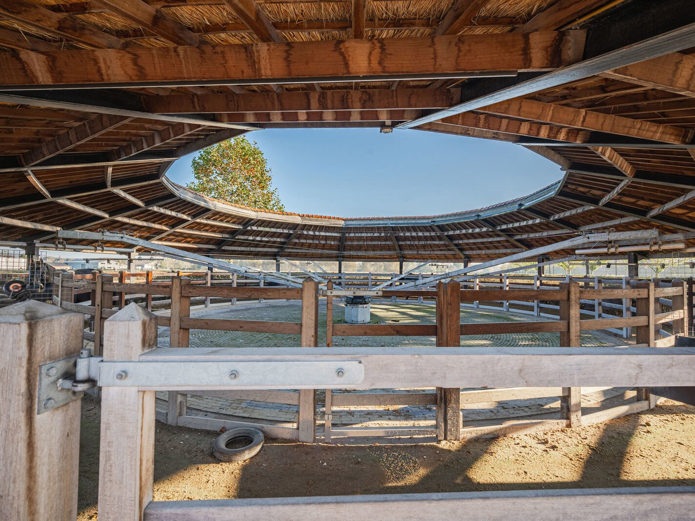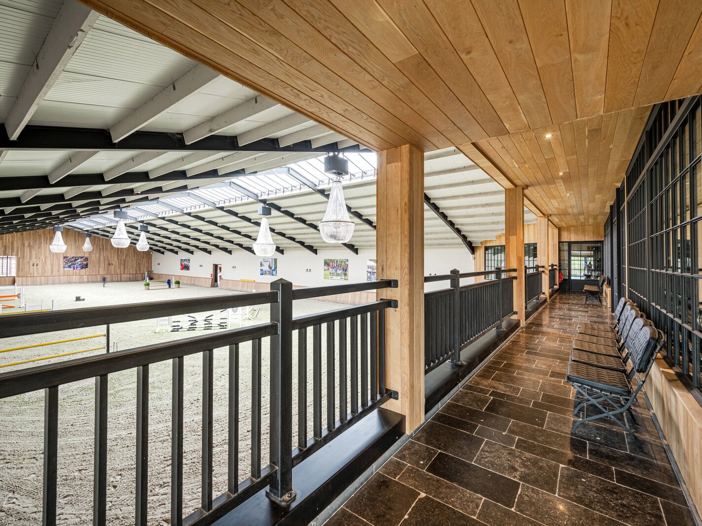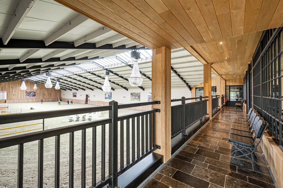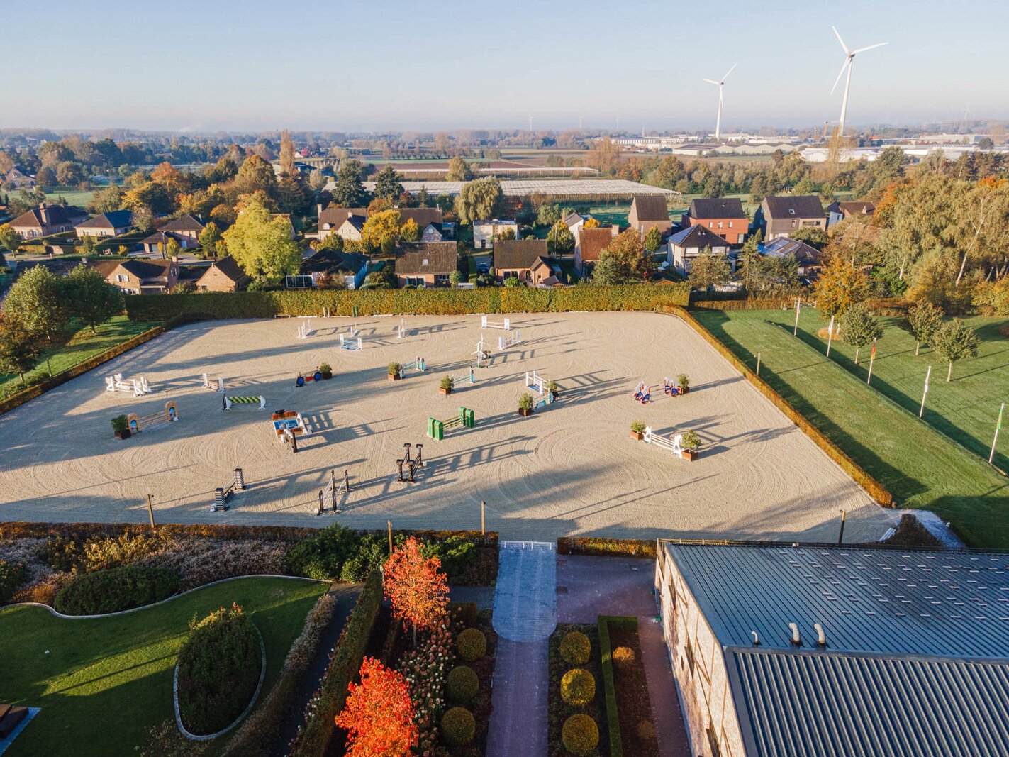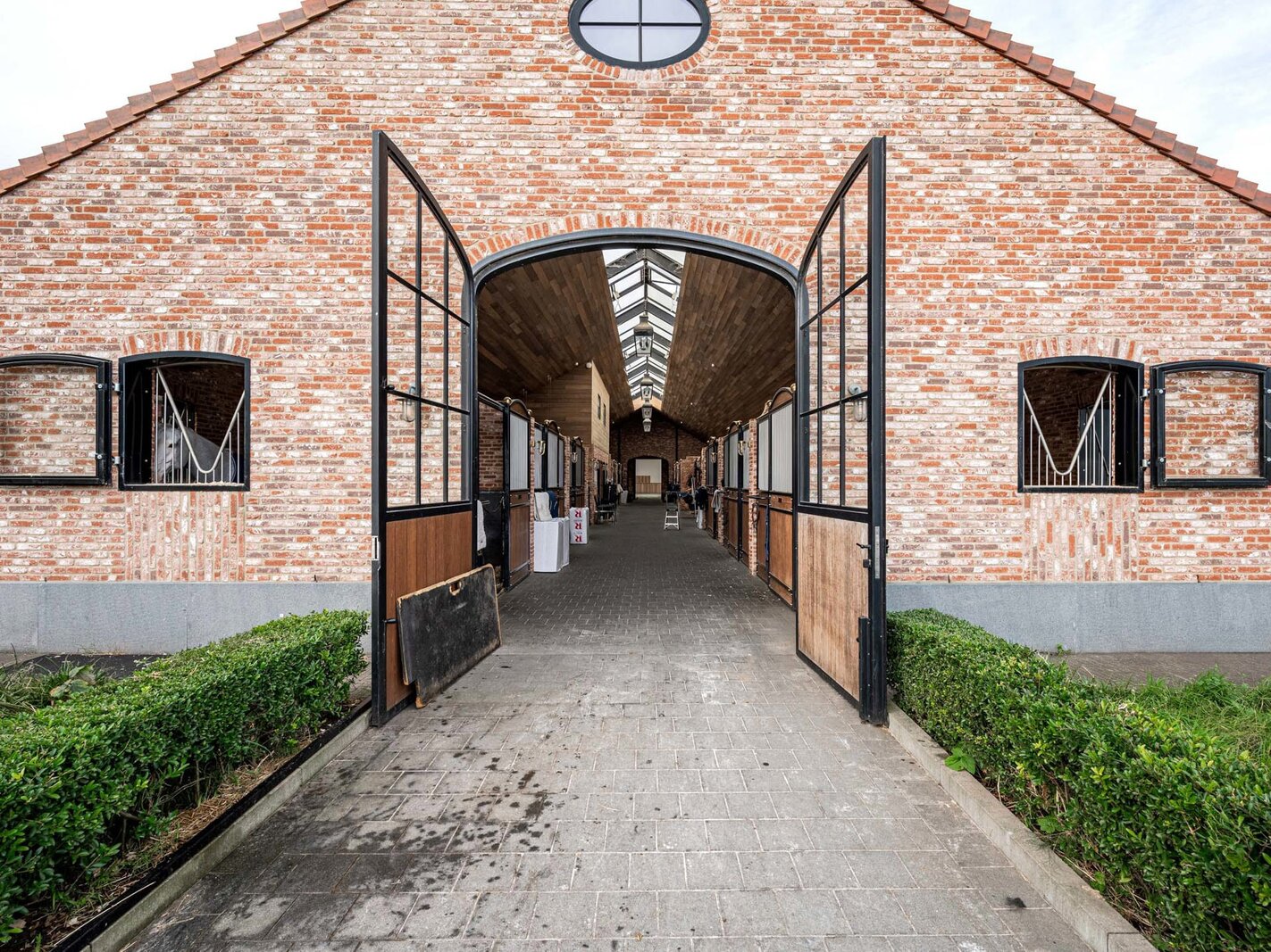 De elegante stalgebouwen herbergen luxueuze boxen met privé-poetsplaatsen en zadelkamers. Het domein beschikt over twee stijlvolle binnenpistes en royale buitenpistes, perfect onderhouden voor optimale prestaties.