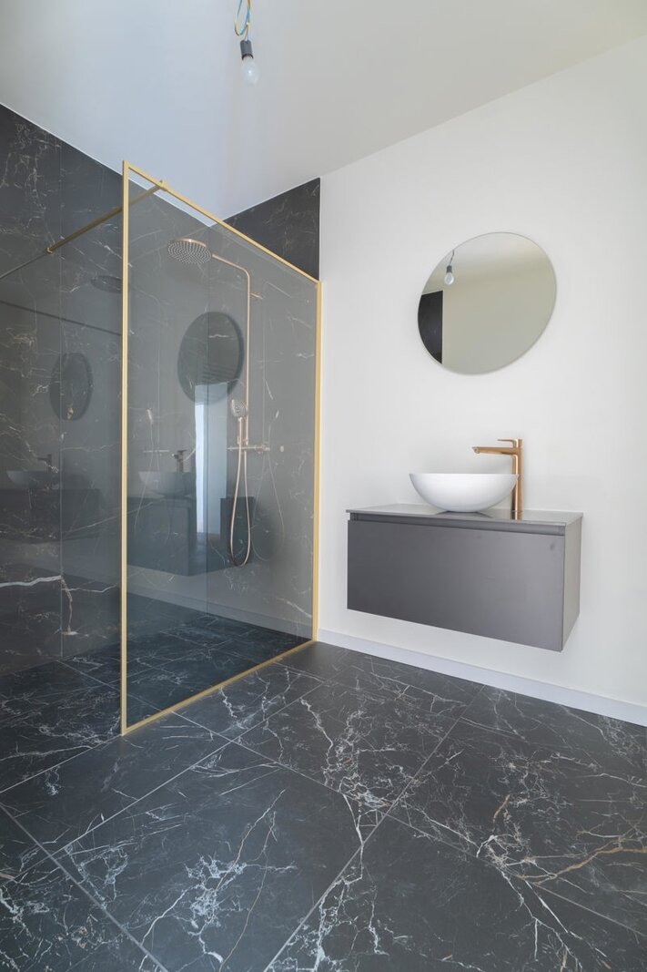 Op de eerste verdieping bevinden zich drie volwaardige kamers, waaronder een ruime master bedroom met een eigen dressing en badkamer. Verder is er nog een tweede badkamer beschikbaar, wat het comfort verhoogt voor grotere gezinnen of gasten.