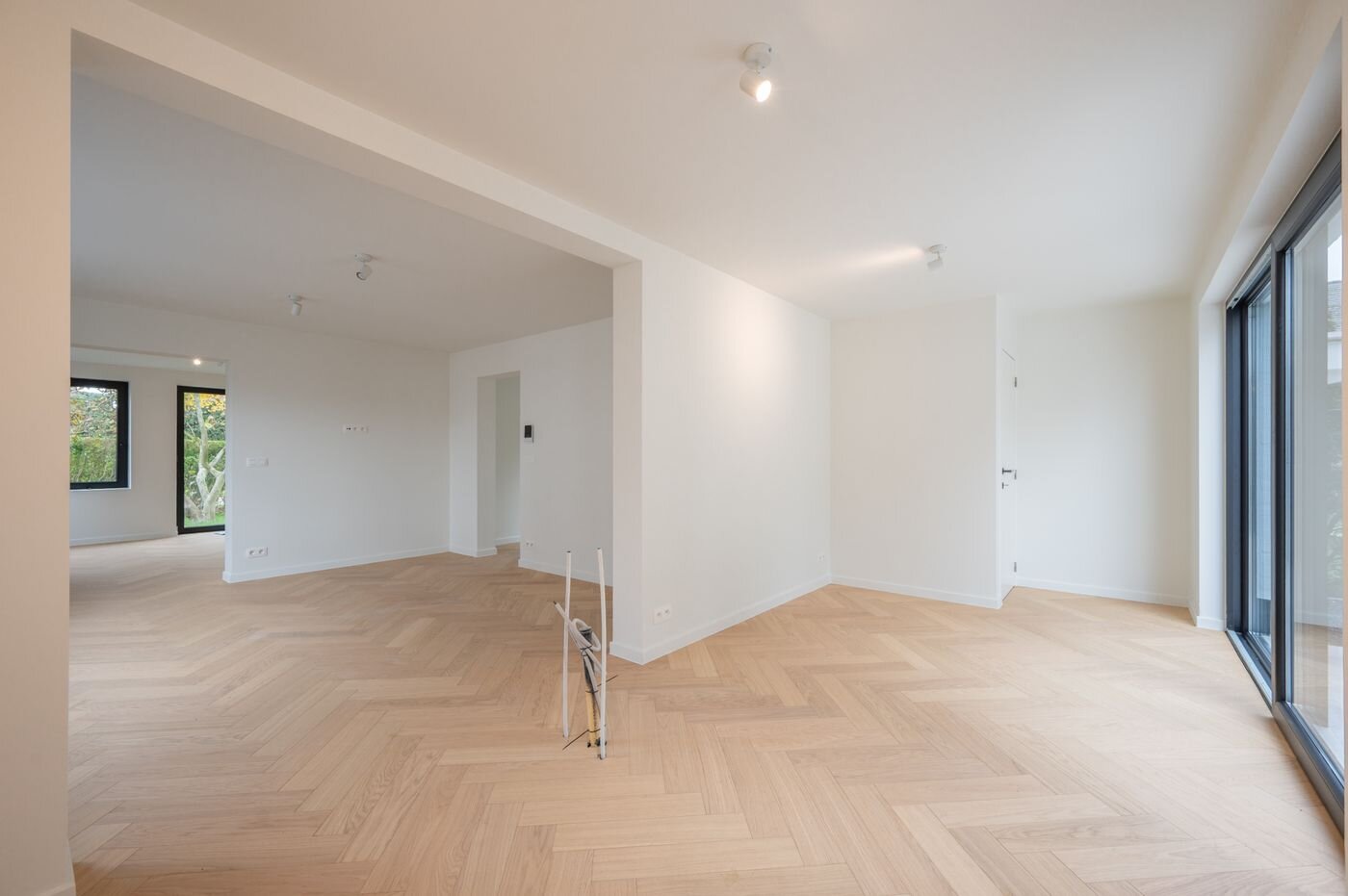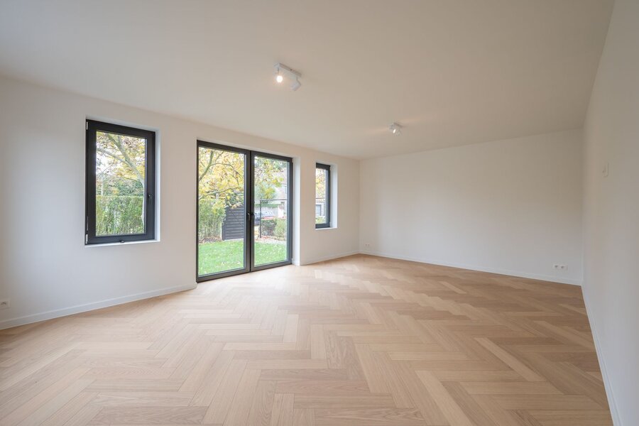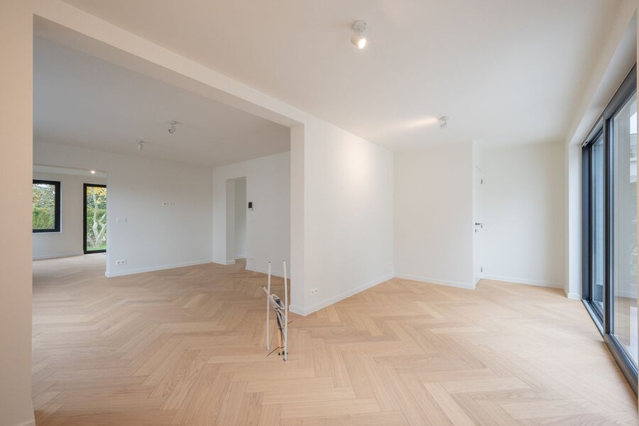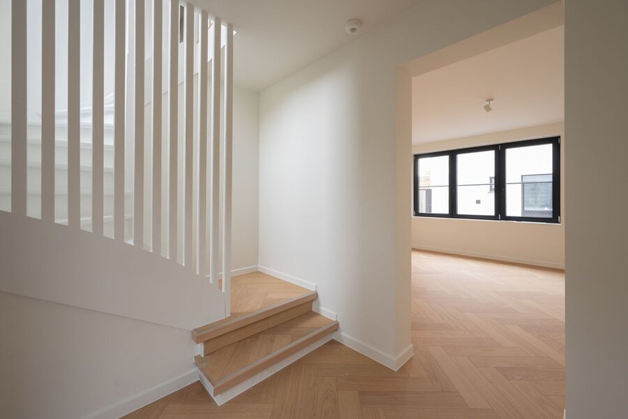Indeling als volgt: u betreedt de woning via de inkomhal, die toegang geeft tot de lichte en ruime leefruimte met zithoek en eetplaats, aansluitend de open keuken die in de prijs inbegrepen is en volledig naar eigen smaak kan worden ingericht. Verder is er op het gelijkvloers nog een afzonderlijk gastentoilet.