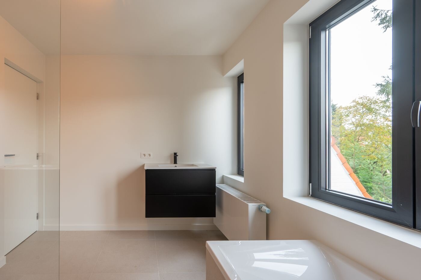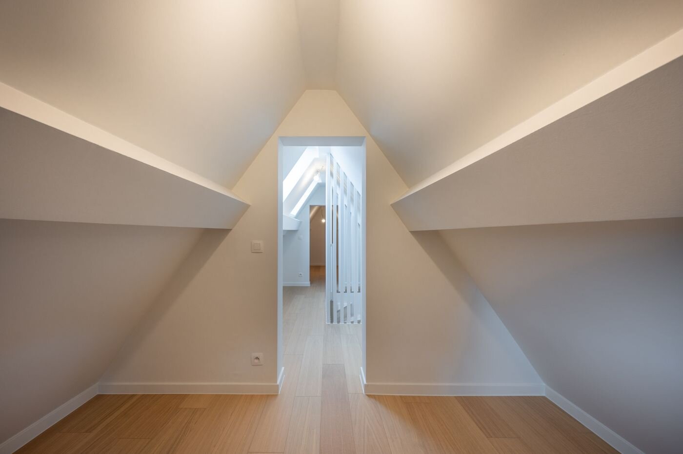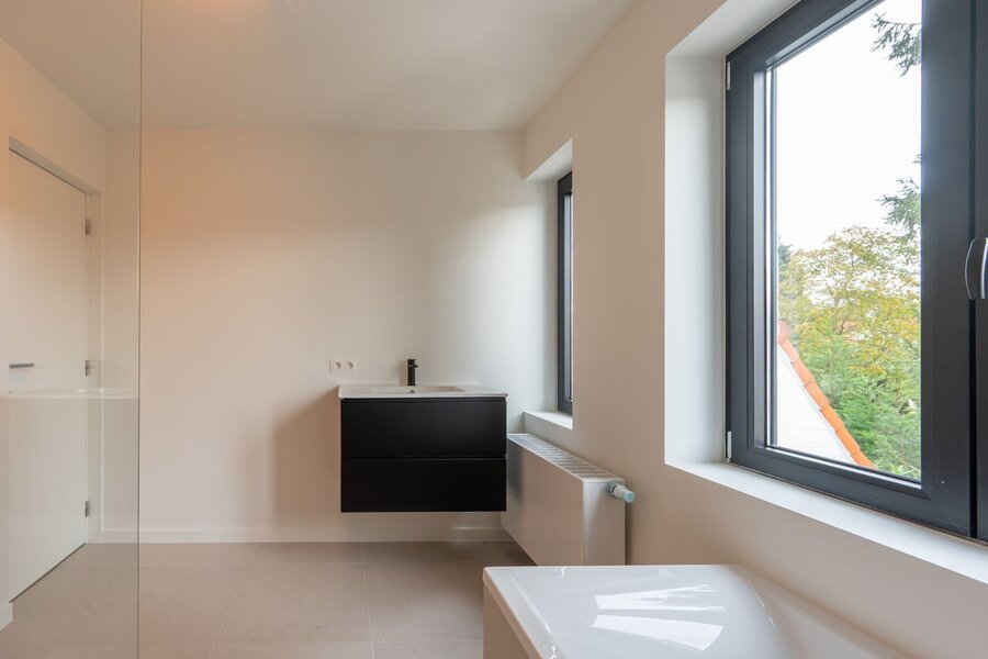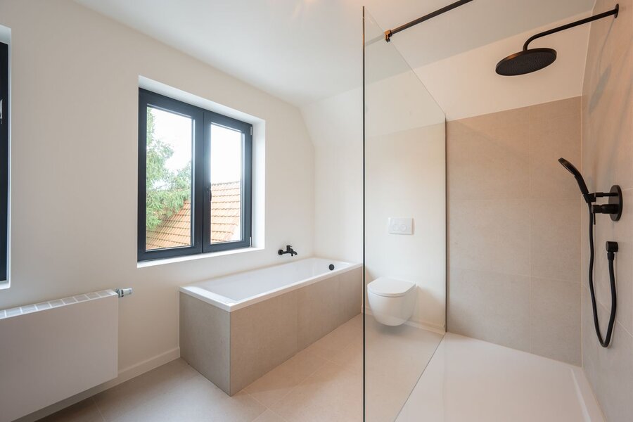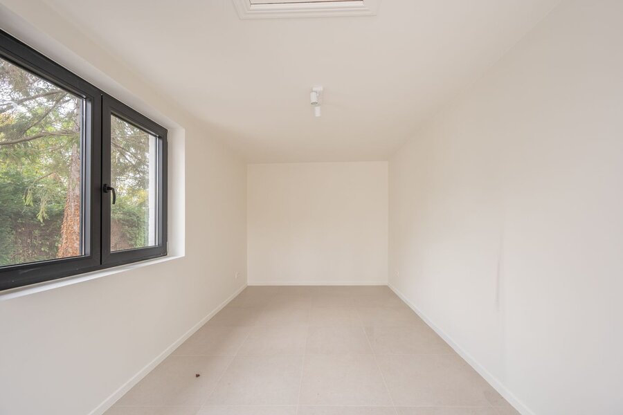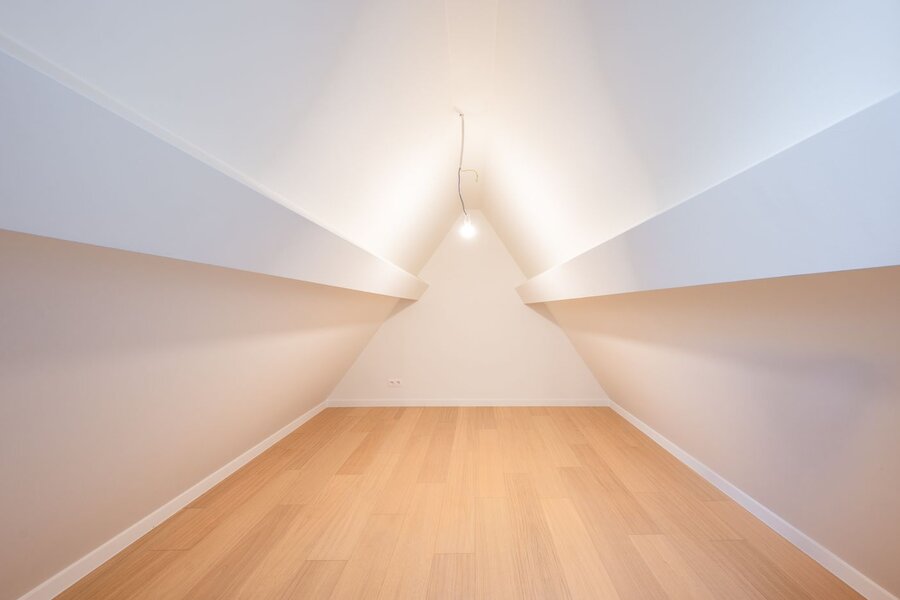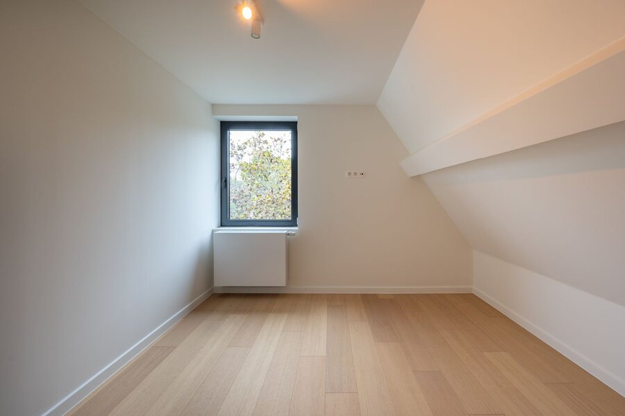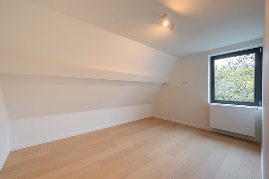 Op de eerste verdieping bevindt zich de nachthal, een handige berging met aansluiting voor wasmachine en droogkast, een moderne badkamer uitgerust met wastafel, toilet, ligbad en inloopdouche, en drie volwaardige slaapkamers. Via een vaste trap bereikt u de zolderverdieping met een vierde, compacte kamer met dressing – ideaal als extra slaapkamer, bureau of hobbyruimte.