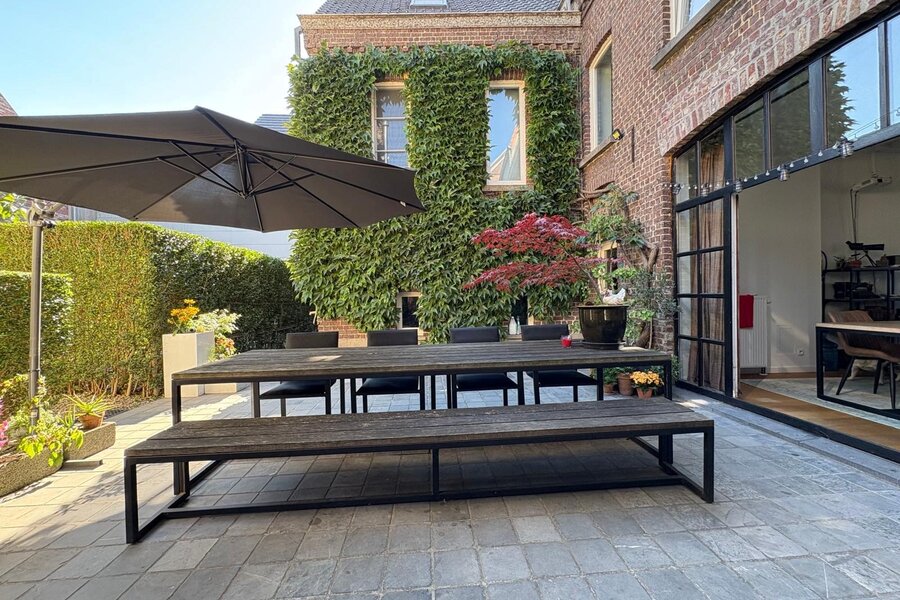 De 18de-eeuwse hoofdwoning is instapklaar en biedt een warme, huiselijke sfeer met royale volumes. Momenteel wordt deze gebruikt als kantoorruimte én woning. Tussen de herenwoning en de nieuwbouwwoning bevindt zich een binnenplaats met terras en parking voor 2-3 wagens. Achteraan ligt een prachtige, diepe tuin, een oase van rust. Via de achterkant is er ook aansluiting met een handige uitweg.