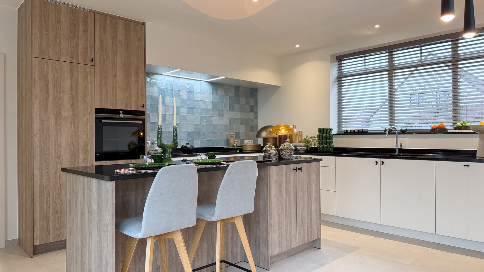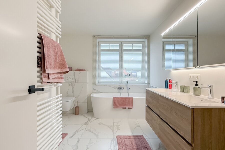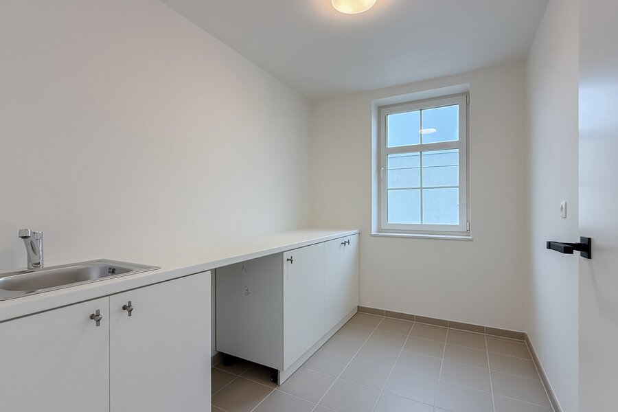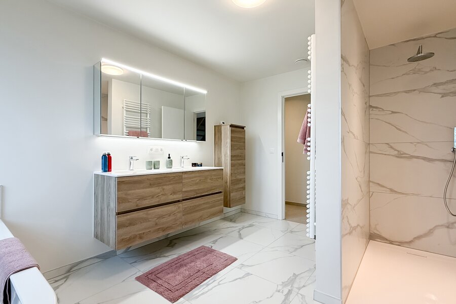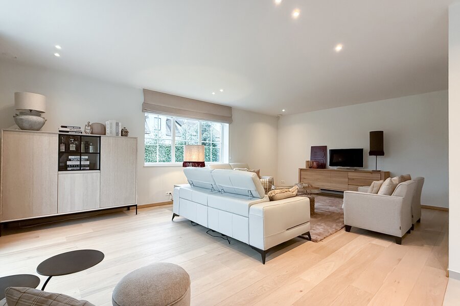 De woning verwelkomt u via een royale inkomzone met maatkasten en gastentoilet. De leefruimte baadt in het daglicht en combineert een stijlvolle parketvloer met een vlotte verbinding naar het terras en de tuin. Aansluitend bevindt zich de moderne open keuken met kookeiland, volledig uitgerust met kwalitatieve toestellen en een aangename eetplaats. Op het gelijkvloers zijn tevens een ruime garage, extra berging en technische ruimte voorzien.