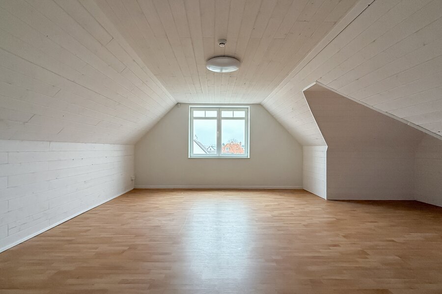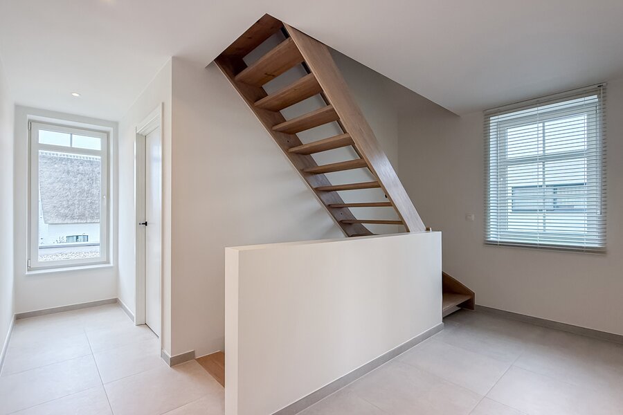 Via een vaste trap bereikt men de volledig afgewerkte zolderverdieping, ideaal als vierde slaapkamer, bureau of multifunctionele ruimte.