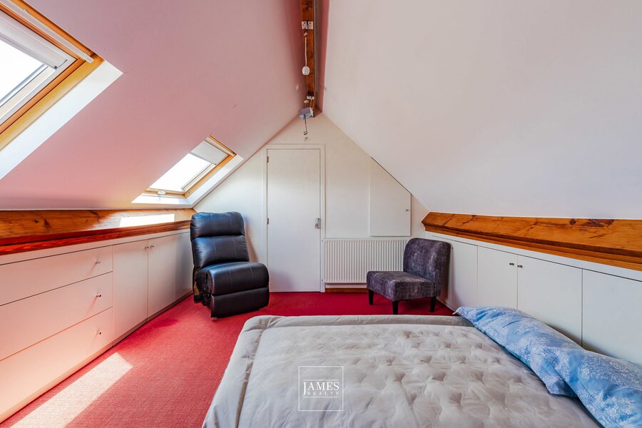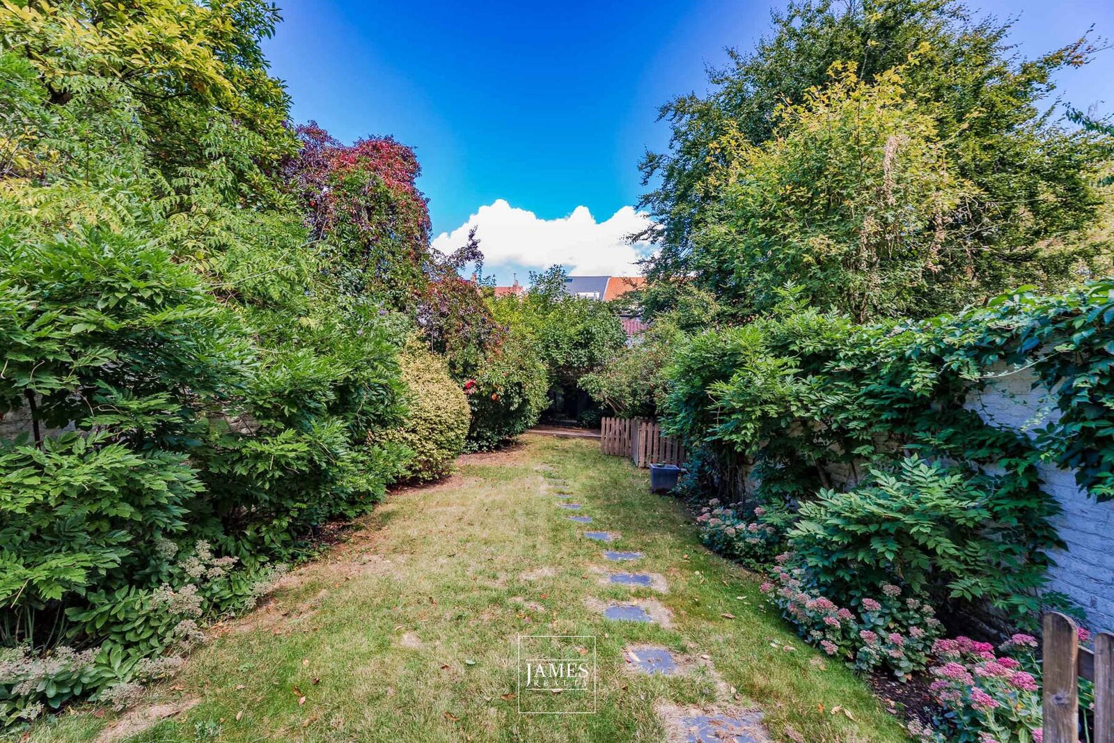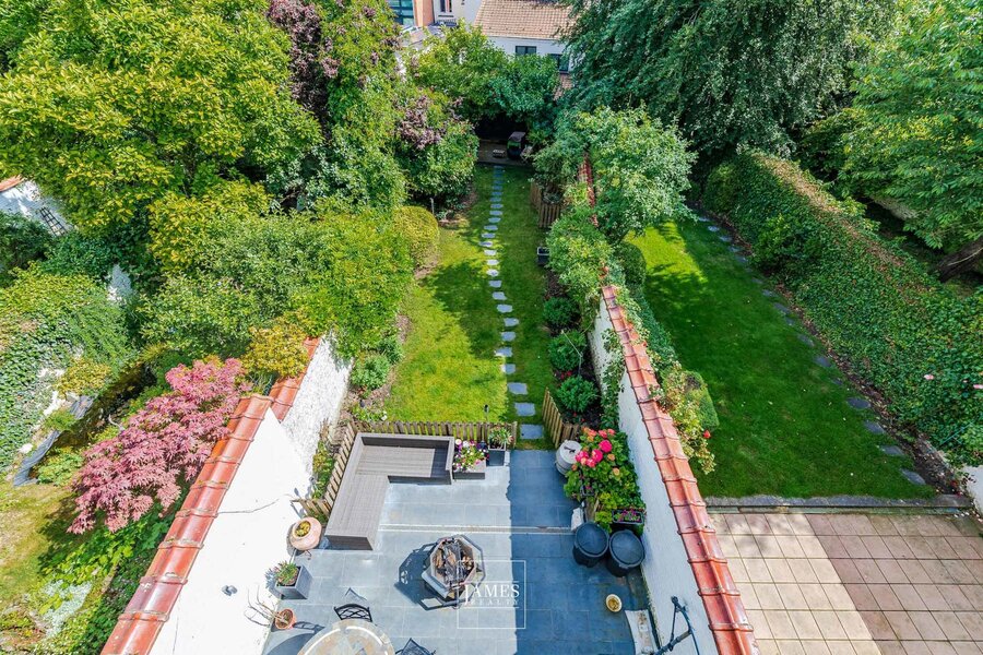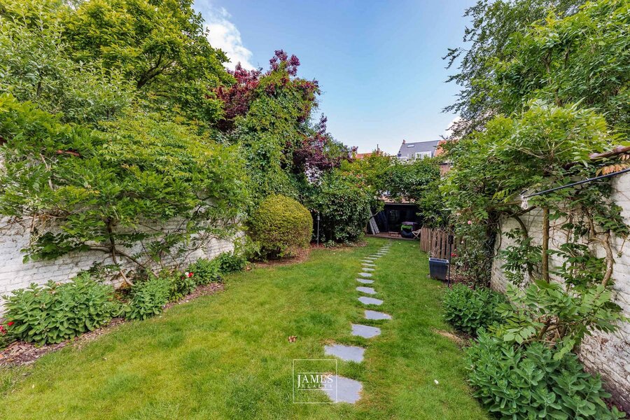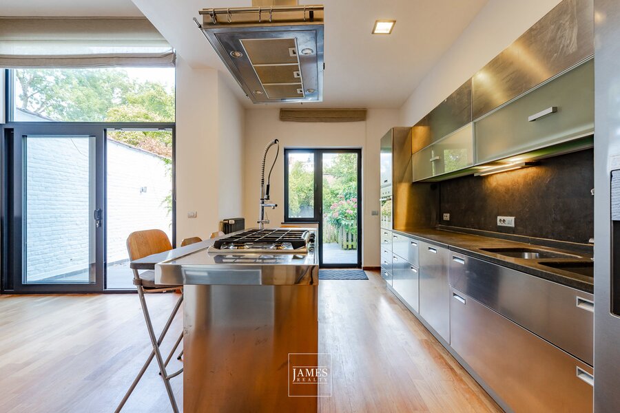 Op het gelijkvloers bevinden zich lichte en ruime leefruimtes die uitgeven op de aangelegde tuin zonder inkijk, evenals een volledig uitgeruste open keuken in moderne stijl. in de tuin staat een charmant achterhuisje, perfect als extra ruimte of atelier.