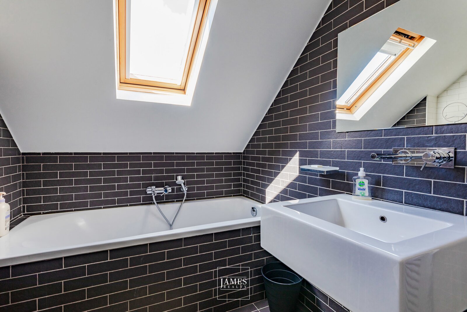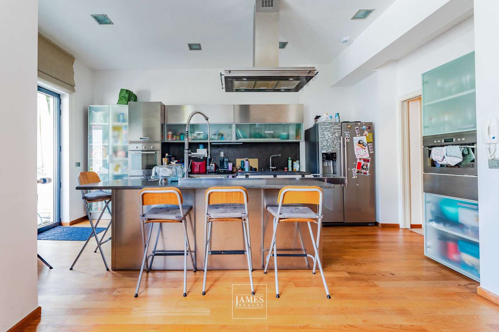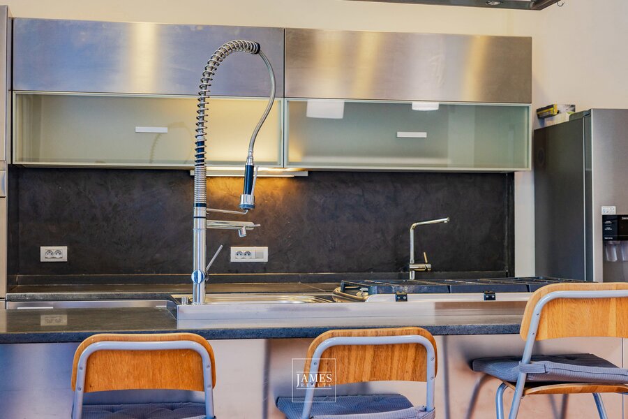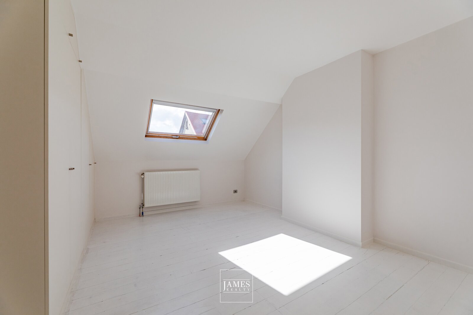 Op het gelijkvloers bevinden zich lichte en ruime leefruimtes die uitgeven op de aangelegde tuin zonder inkijk, evenals een volledig uitgeruste open keuken in moderne stijl. in de tuin staat een charmant achterhuisje, perfect als extra ruimte of atelier.