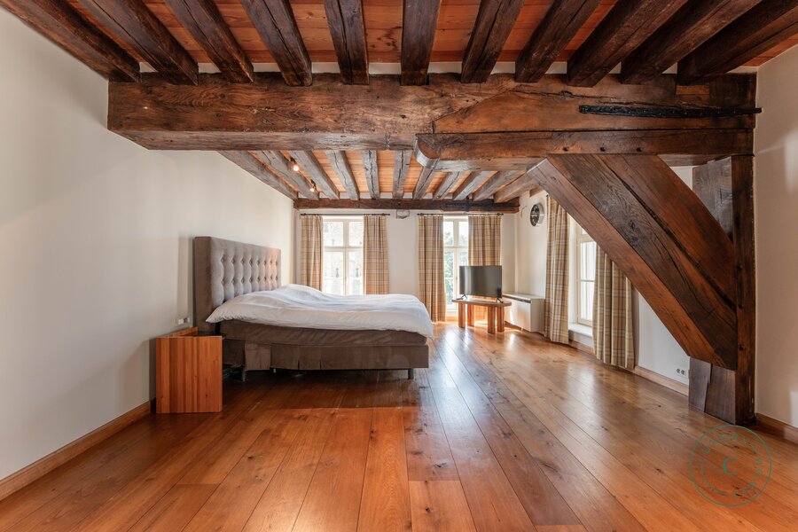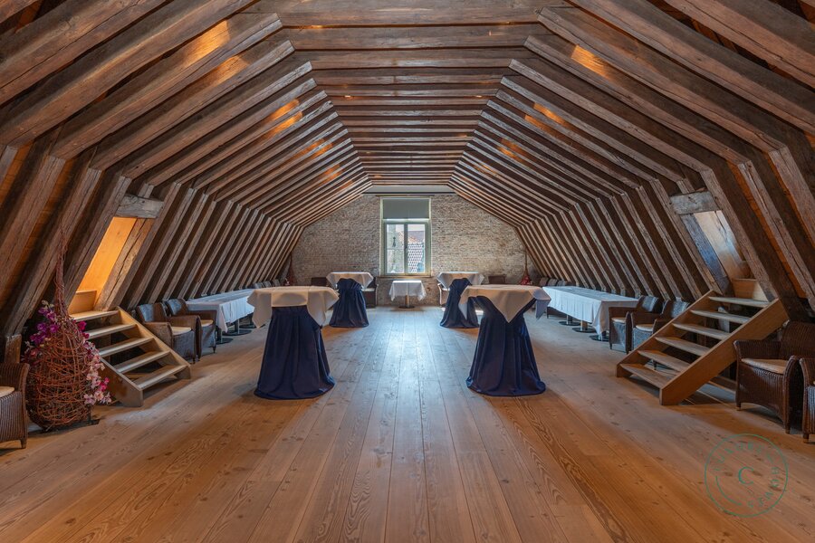 Onder het authentieke dakgebinte (erfgoed) bevindt zich een grote, open zolderruimte die flexibel inzetbaar is als atelier, eventruimte of seminarieruimte.