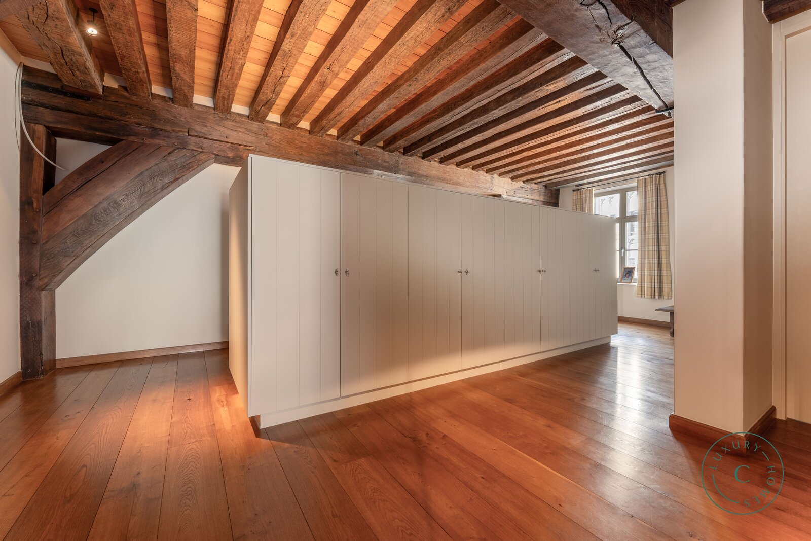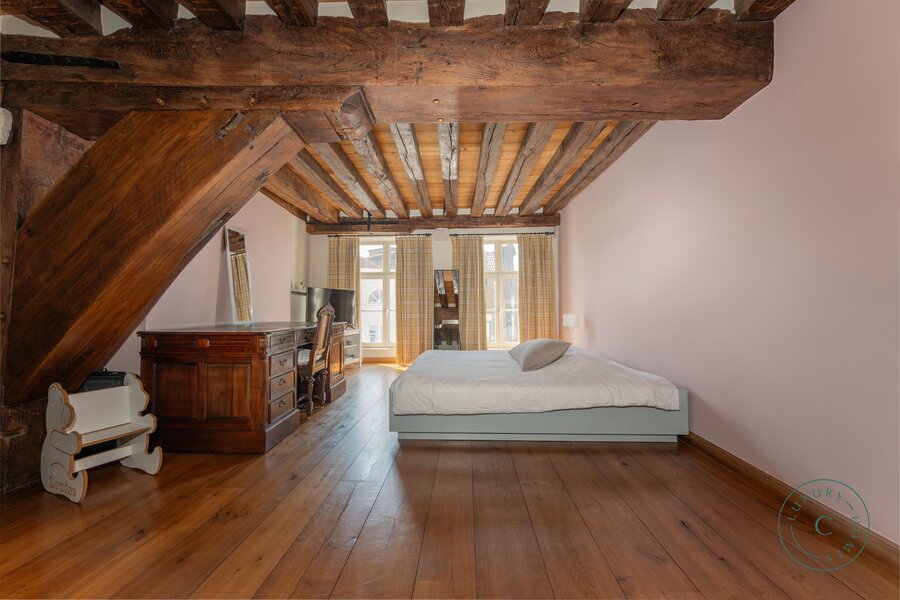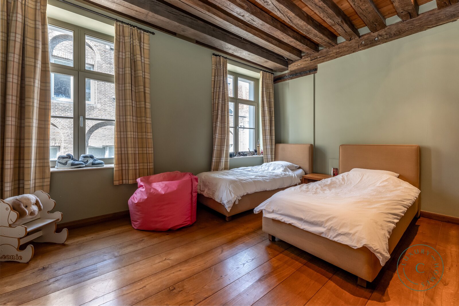 Op de eerste verdieping ligt de ruime, smaakvol ingerichte privéwoonst met inkomhal, lichtrijke leefruimte met open haard en spectaculair zicht op het Belfort, een royale eetkamer, ruime keuken, badkamer en bureauruimte. De tweede verdieping omvat drie slaapkamers en een centrale dressing.