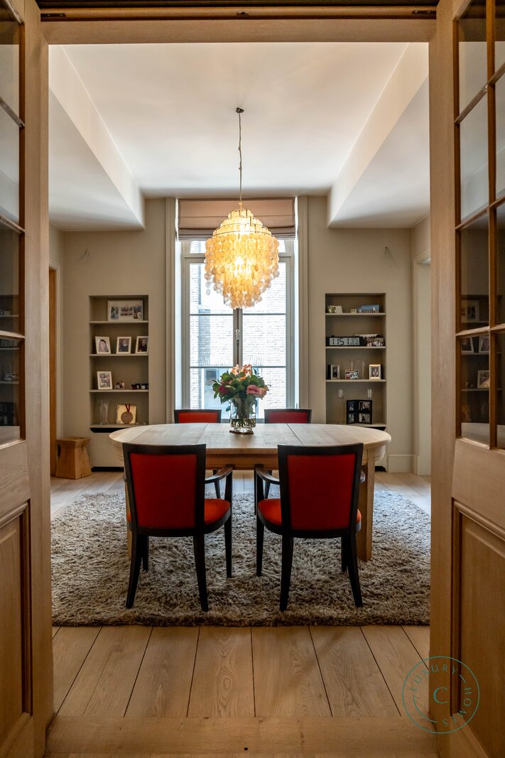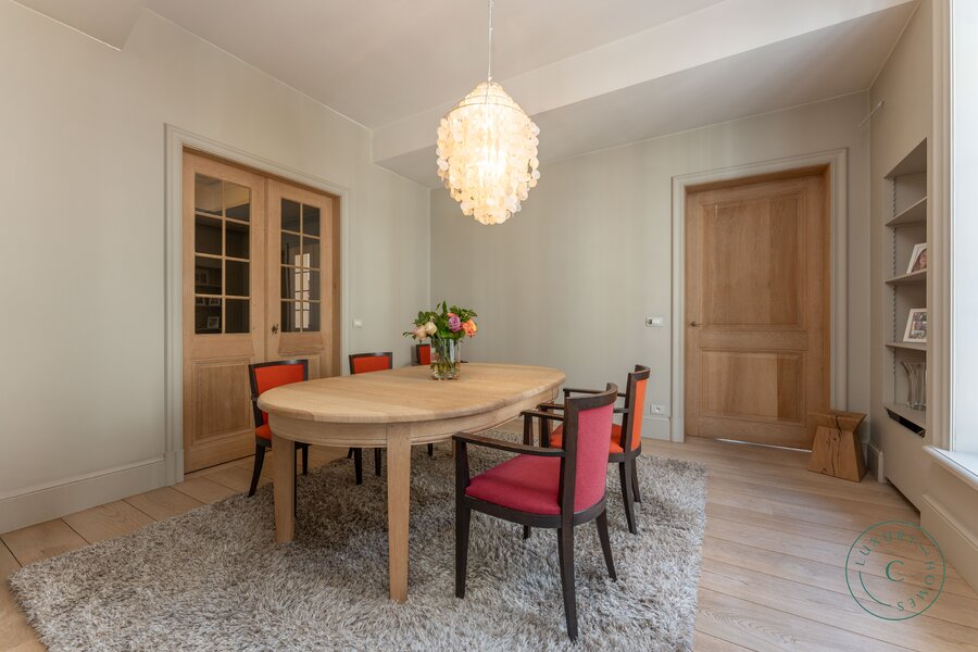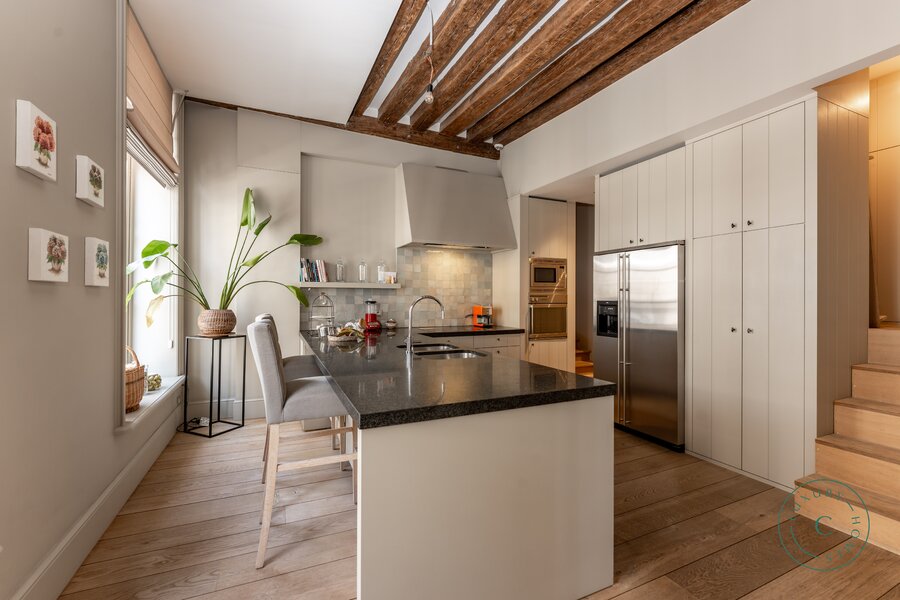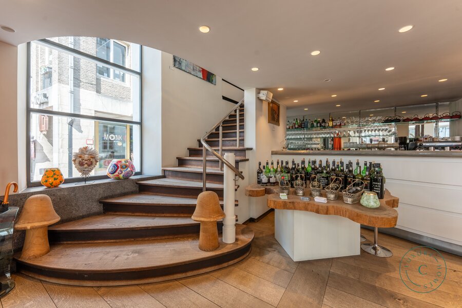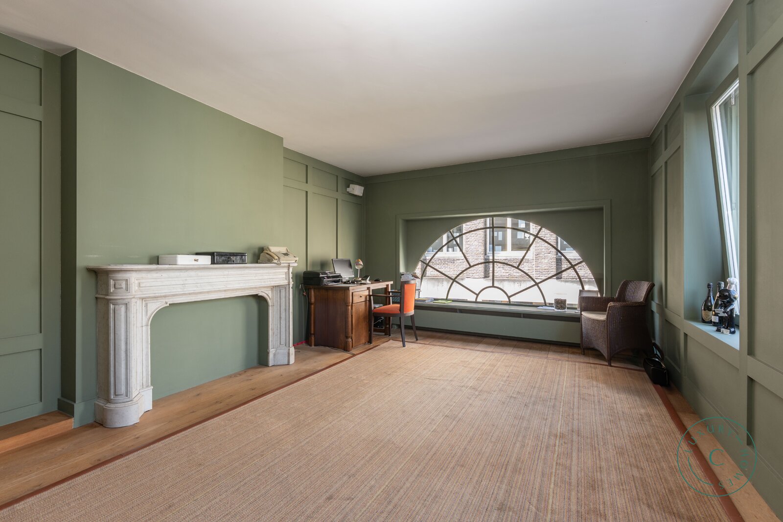 Op de eerste verdieping ligt de ruime, smaakvol ingerichte privéwoonst met inkomhal, lichtrijke leefruimte met open haard en spectaculair zicht op het Belfort, een royale eetkamer, ruime keuken, badkamer en bureauruimte. De tweede verdieping omvat drie slaapkamers en een centrale dressing.