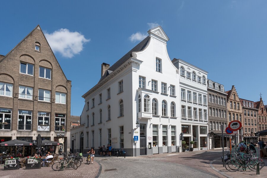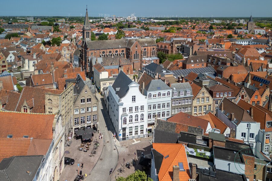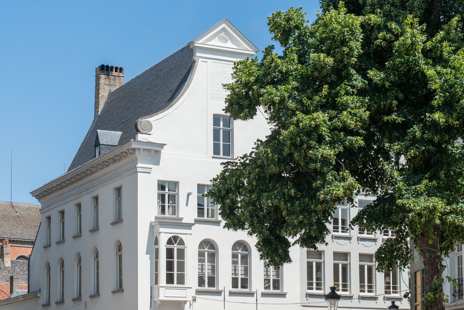Op een uitzonderlijke locatie, op enkele stappen van de Brugse Grote Markt, bevindt zich dit indrukwekkende hoekpand met een rijke geschiedenis.