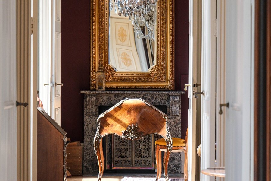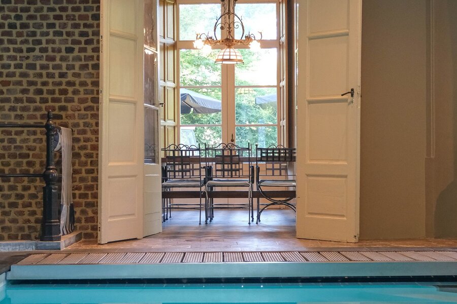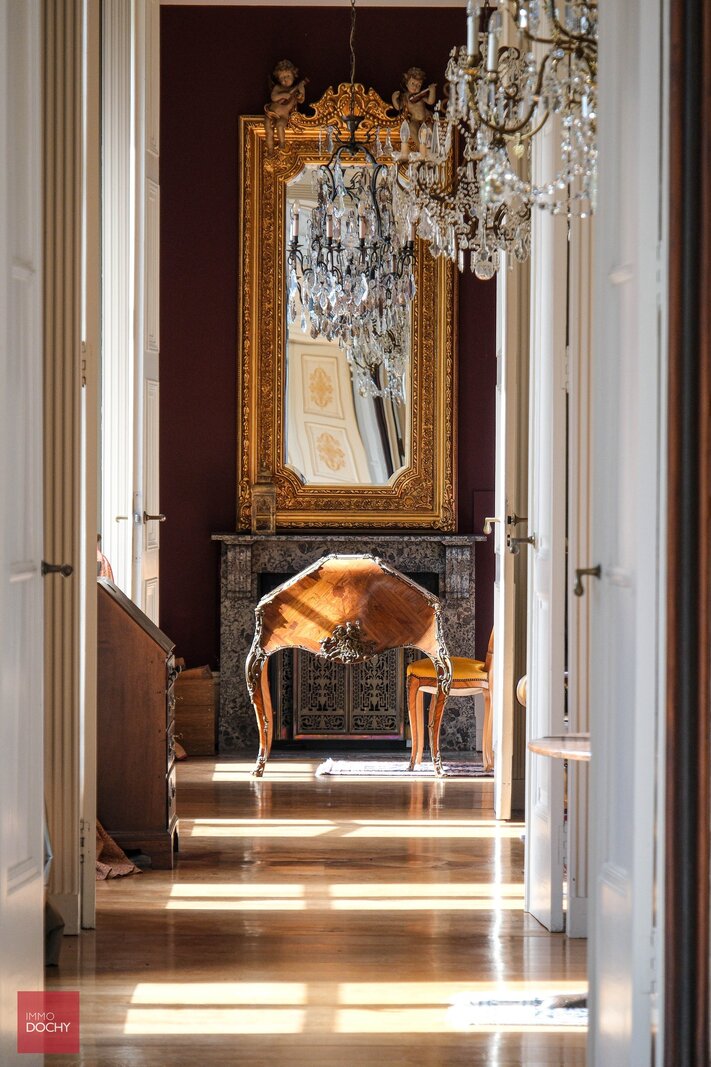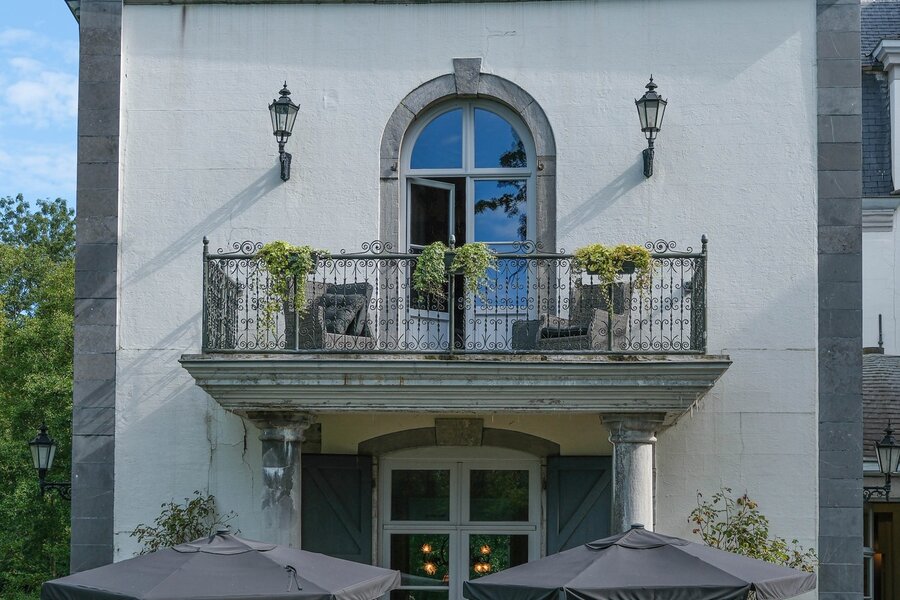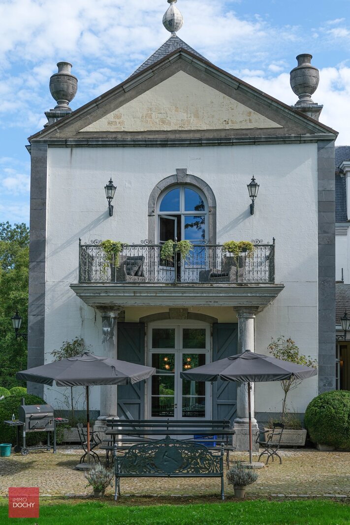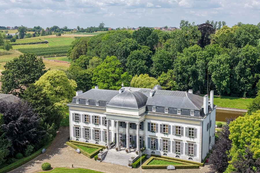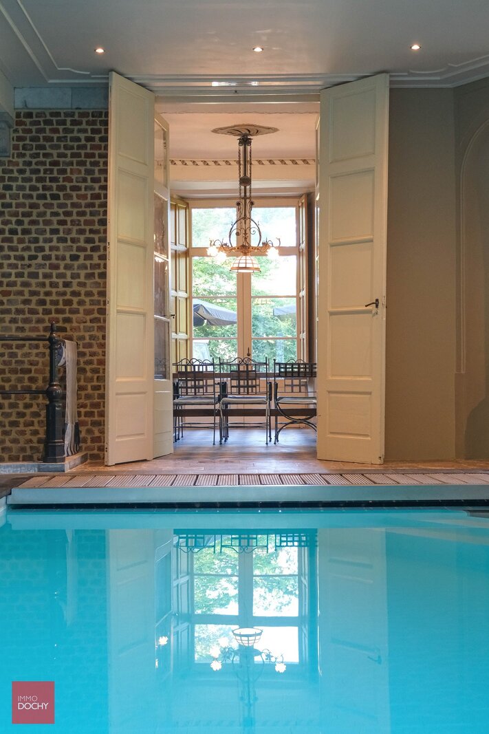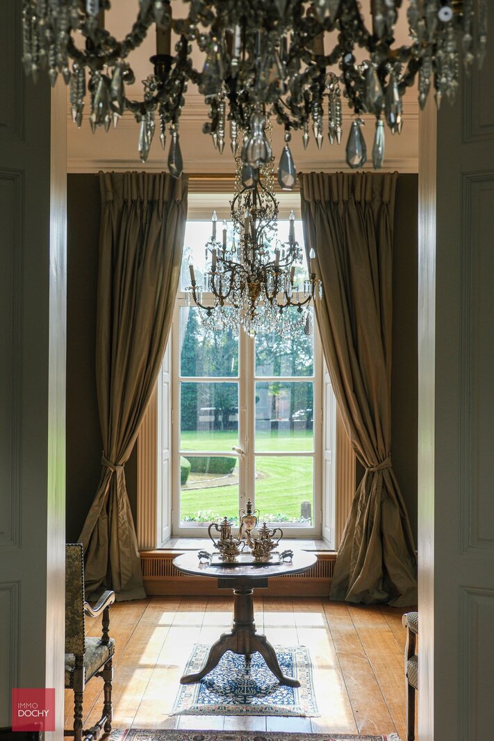 De indeling: Imposante ontvangsthal, groot salon in neoclassistische stijl, ruime eetkamer, dagelijkse zitkamer in parket met open haard, hedendaagse keuken, bibliotheek, bureel, vestiaire, theekamer, hobbyruimte, prachtige orangerie, binnenzwembad met jacuzzi en sanitair. Op de eerste verdieping zijn er 5 slaapkamers met 4 ensuite badkamers, linnenkamer, verschillende dressingrooms en daarboven een grote polyvalente zolderruimte. In de 2de vleugel van het kasteel bevindt zich een hedendaags gastenverblijf met afzonderlijke toegang bestaande uit authentieke living met ingerichte keuken, 4 slaapkamers en 2 badkamers, dressing en toegang tot het zwembad. Het kasteel is volledig onderkelderd met authentieke gewelven die leiden tot de ondergrondse ontspanningsruimte met atelier, feestzaal, bar, cinemaroom, sanitair, wijnkelder, voorraadkelder en CV-kelder.