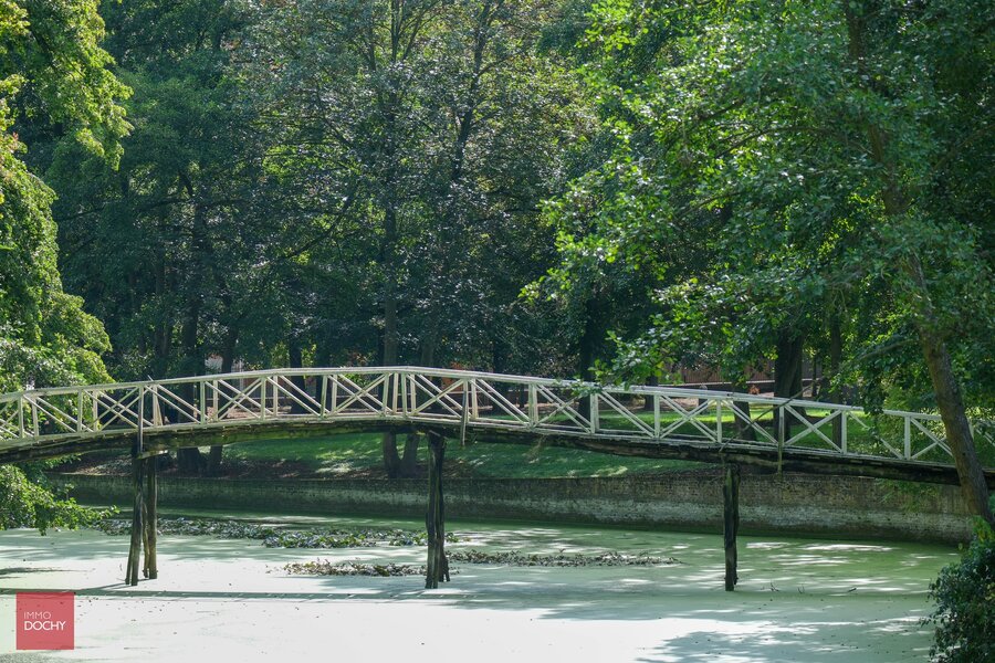 Het landgoed beslaat een aanzienlijke oppervlakte (ca 3,8ha) en omvat uitgestrekte tuinen met prachtige omwalling en deel bos. De aangelegde tuin rondom het kasteel is perfect onderhouden en herbergt een volledig gerestaureerde ijskelder/uitkijktoren die momenteel dienst doet als B&B. Het domein wordt afgesloten met een modern vergund zonnepanelenpark (250 panelen), wat het energieverbruik herleidt tot bijna nul (oa ook dubbele beglazing, recente cv, led-verlichting...)