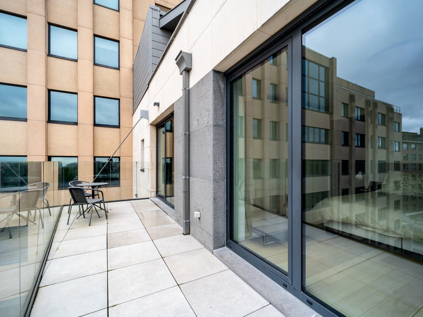 Het appartement gelegen op de 5e verdieping van een recent gebouw geeft uit op de leefruimte bestaande uit een grote woonkamer van ± 59 m² met open gashaard en een kantoorruimte, een volledig ingerichte open Bulthaup keuken met kookeiland en een eetkamer. Het appartement baadt in het licht dankzij de erkers die toegang geven tot de terrassen. Aan de nachtzijde is de hoofdslaapkamer voorzien van geïntegreerd schrijnwerk, een complete badkamer en toegang tot het terras en een tweede slaapkamer met kleedkamer en doucheruimte. Een ingerichte wasruimte, een vestiaire en gastentoilet en een backoffice maken het pakket compleet.