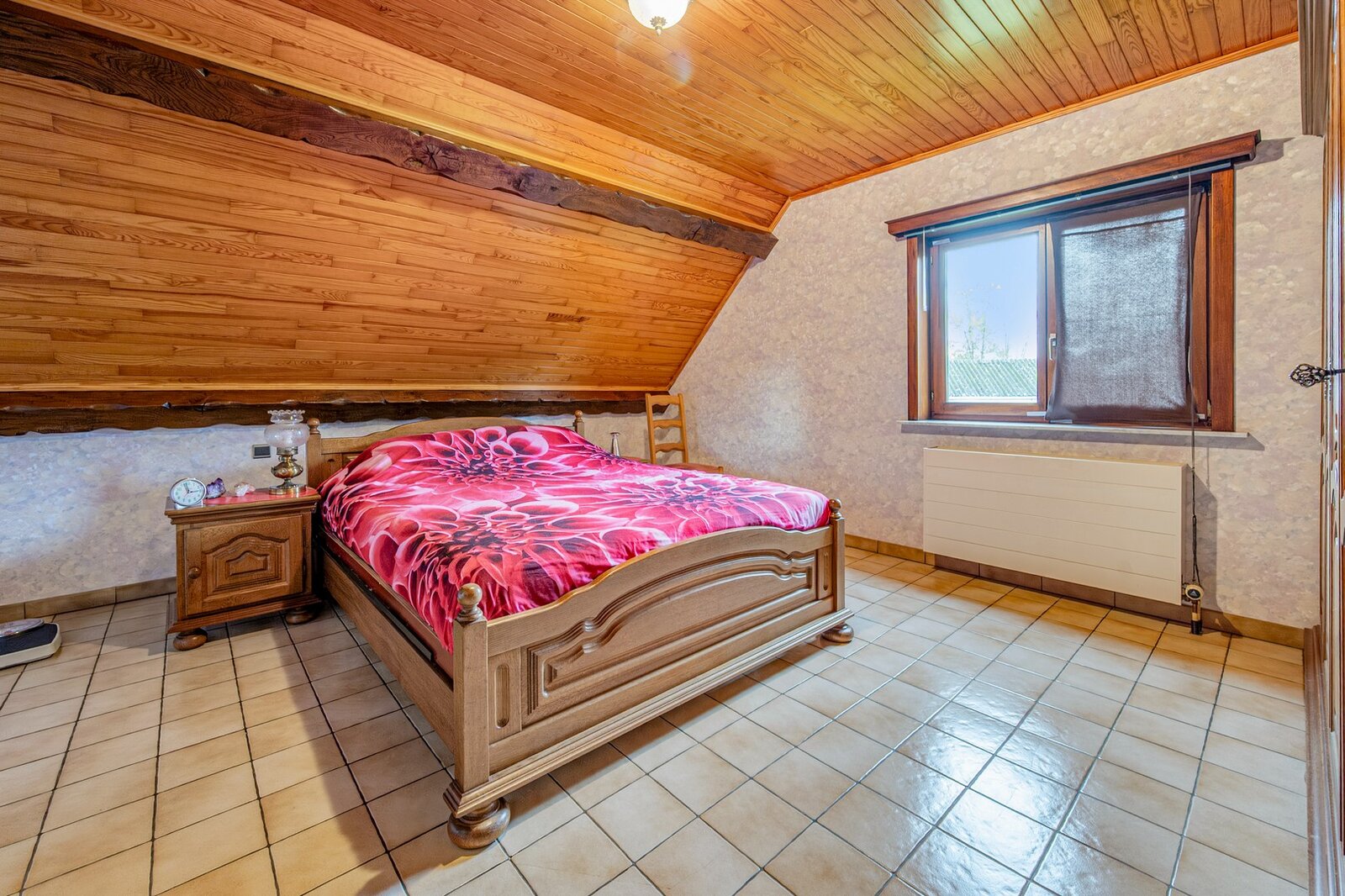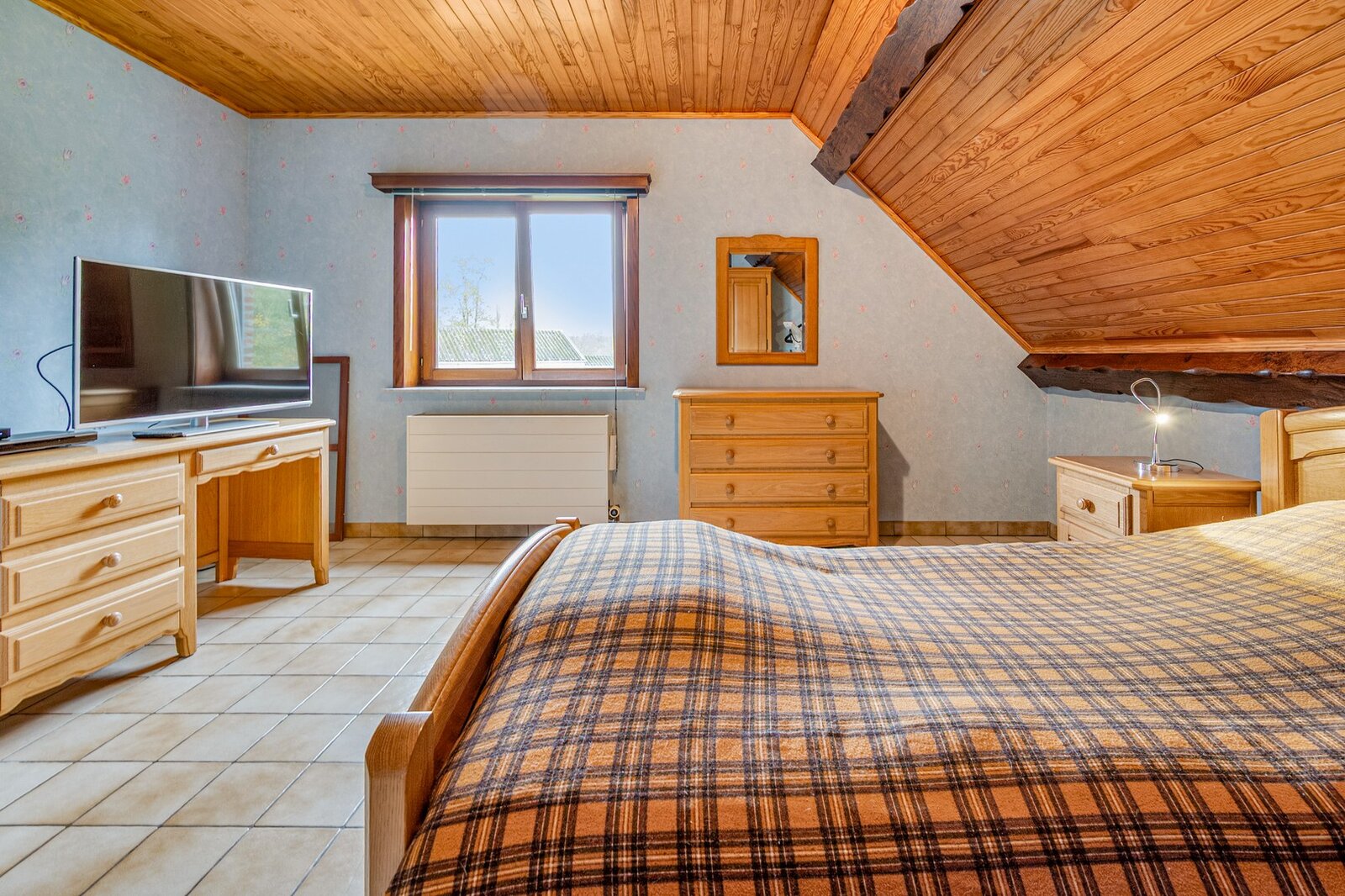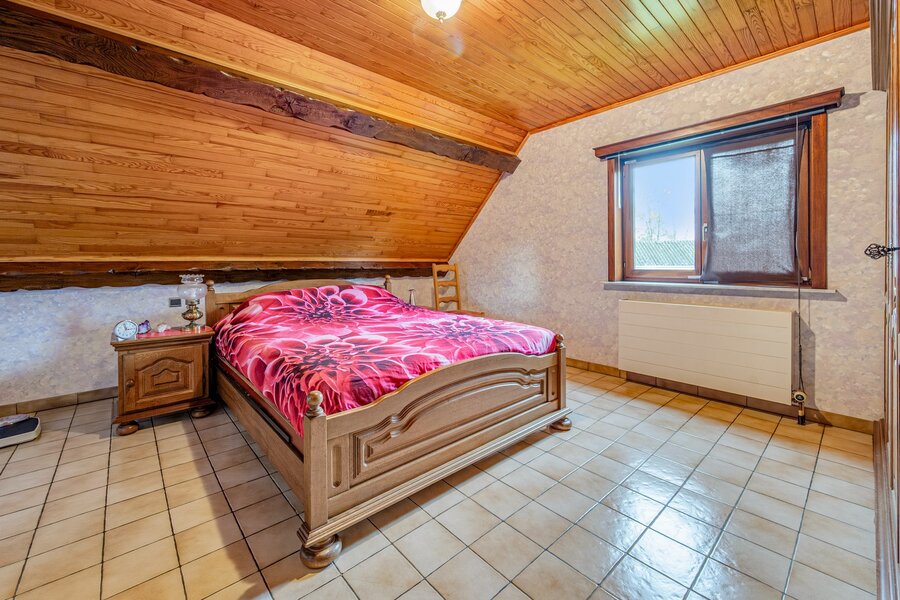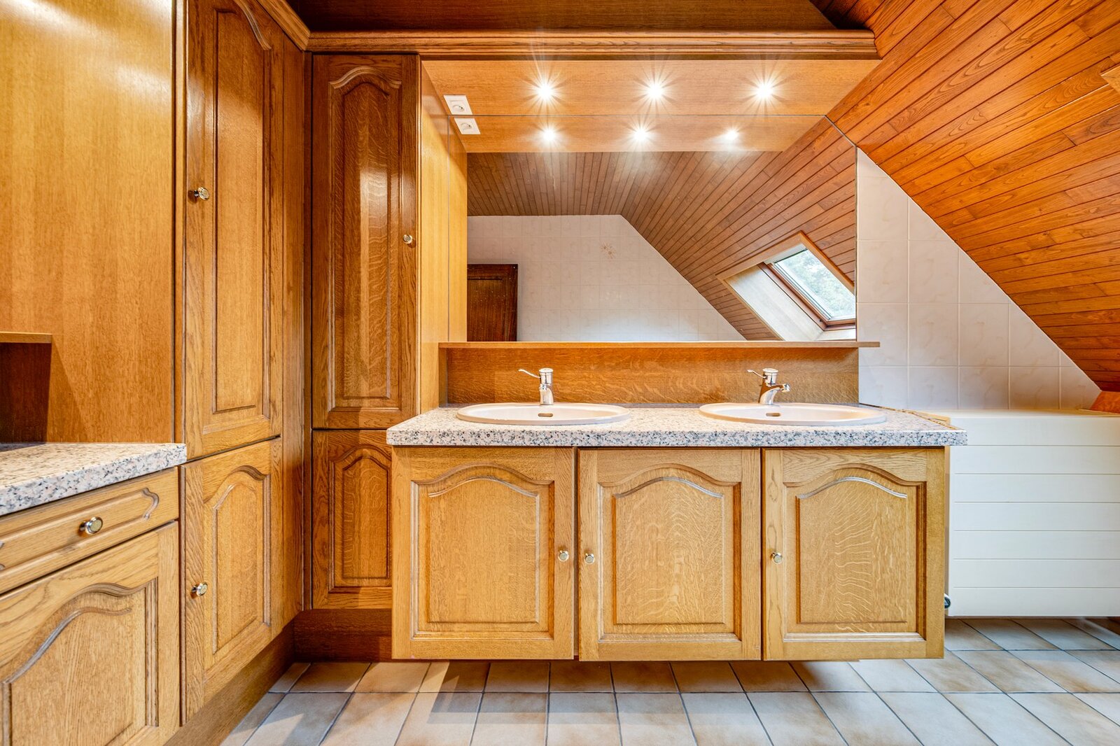 Dit landhuis met uitzonderlijke grond aan werd opgetrokken in 1988 met zeer degelijke en duurzame materialen in een mooie landelijke stijl. De indeling is als volgt: inkomhal met gastentoilet, aangename en gerenoveerde leefruimte met elekrische sfeerhaard, onderhouden keuken met voldoende kastruimte en toestellen waar men ook kan eten, veranda met knap uitzicht over de tuin, aparte berging/wasplaats, grote inpandige garage. Op de verdieping bevinden zich 4 grote slaapkamers op een tegelvloer, ruime badkamer met dubbele lavabo, ligbad en douche. Valluik naar de geïsoleerde zolder wat ideaal is als bergruimte. Buiten: oprit voor verschillende autos, aangelegde tuin met vijver, groot stuk weiland, stallingen, bos,...MAAK SPOEDIG UW AFSPRAAK OM DEZE EXCLUSIEVE EIGENDOM TE BEZOEKEN!