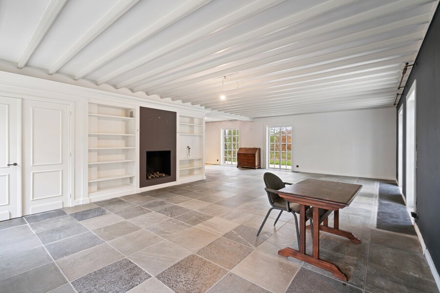 Via de brede inkomhal met vestiaire en gastentoilet kom je in de lichtrijke L-vormige leefruimte, afgewerkt met natuursteen, een ingebouwde gashaard en maatwerk dat voor rust en verfijning zorgt. De vele ramen bieden een mooi zicht op de tuin en geven directe toegang tot het ruime terras.