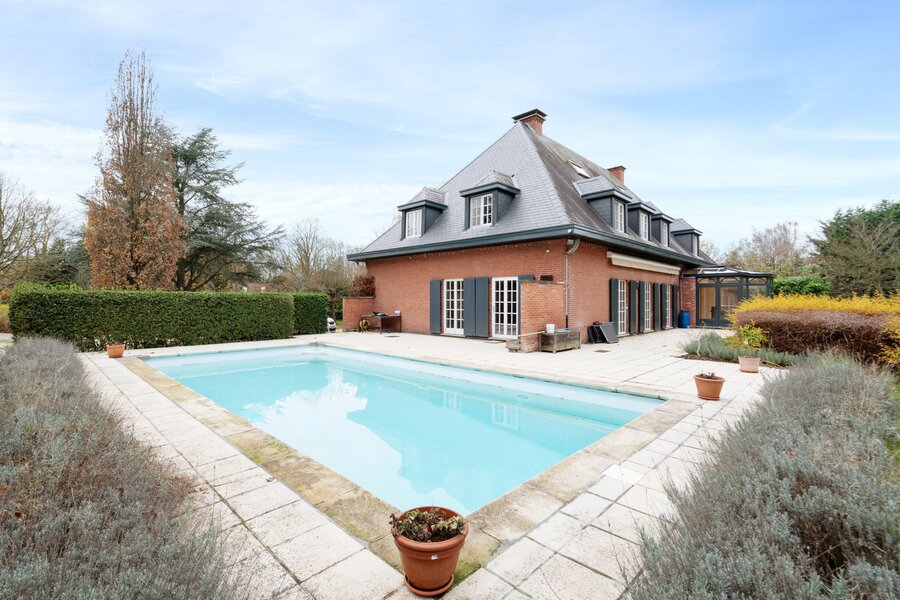 Stijlvolle villa (584 m²) met 7 kamers, 2 dressings, bad- en douchekamer, bureau + kantoor, dubbele garage, zolder, kelder, groot terras met zwembad en een mooie parktuin met tennisveld op een perceel van 51a 14ca gelegen op een locatie met veel privacy te Herent.