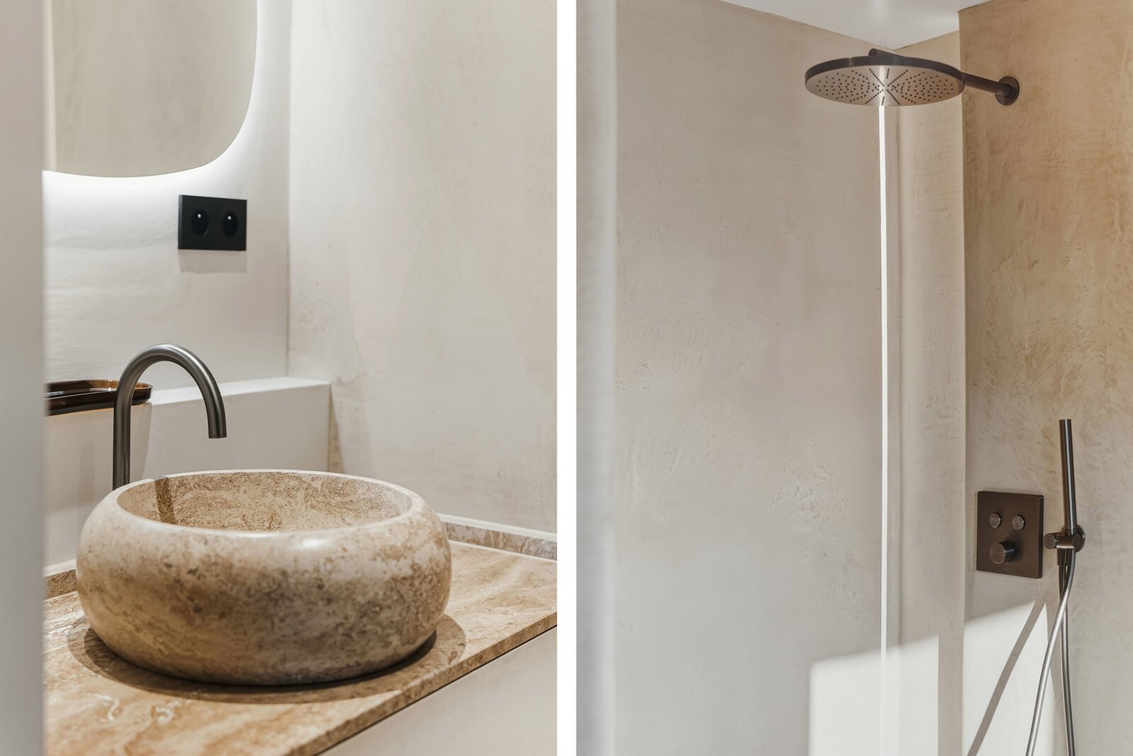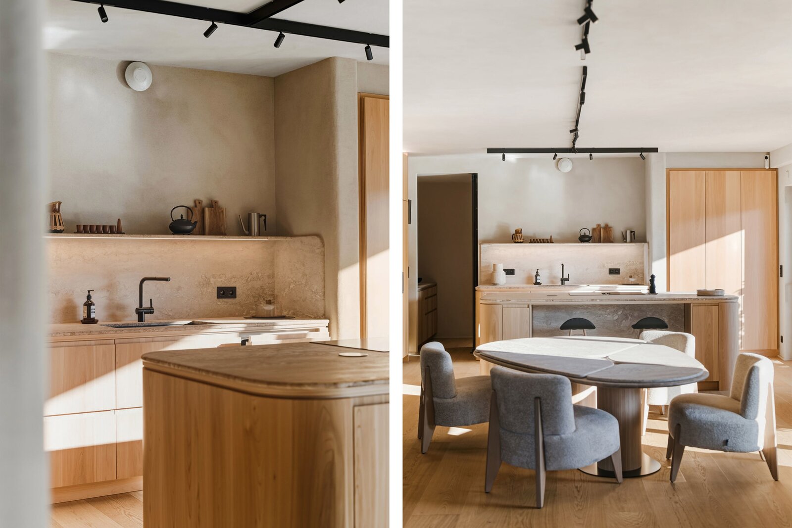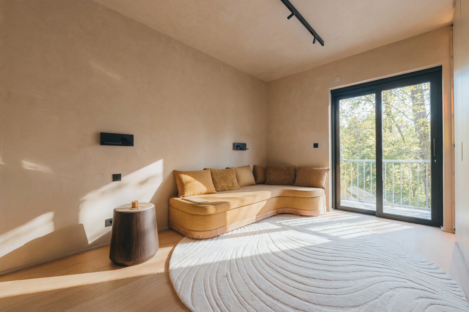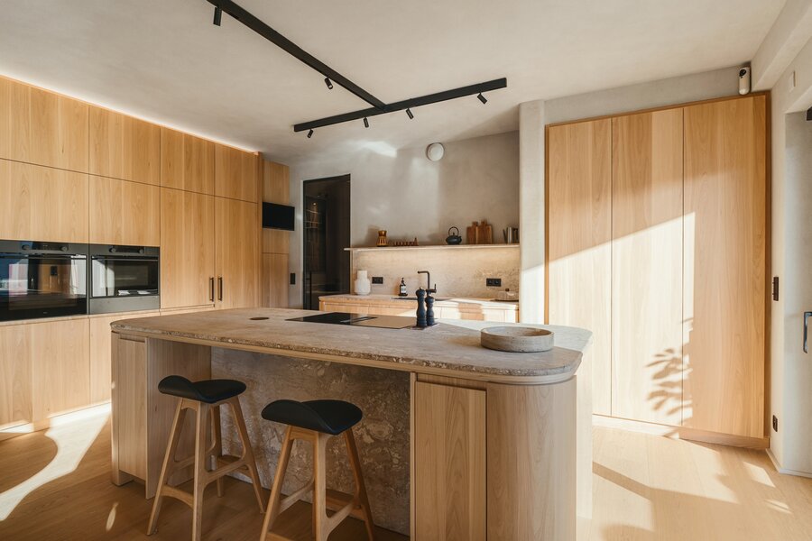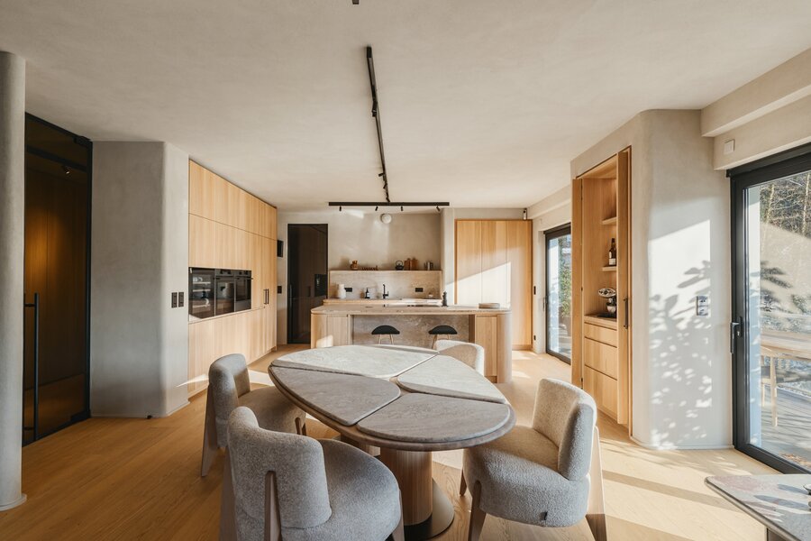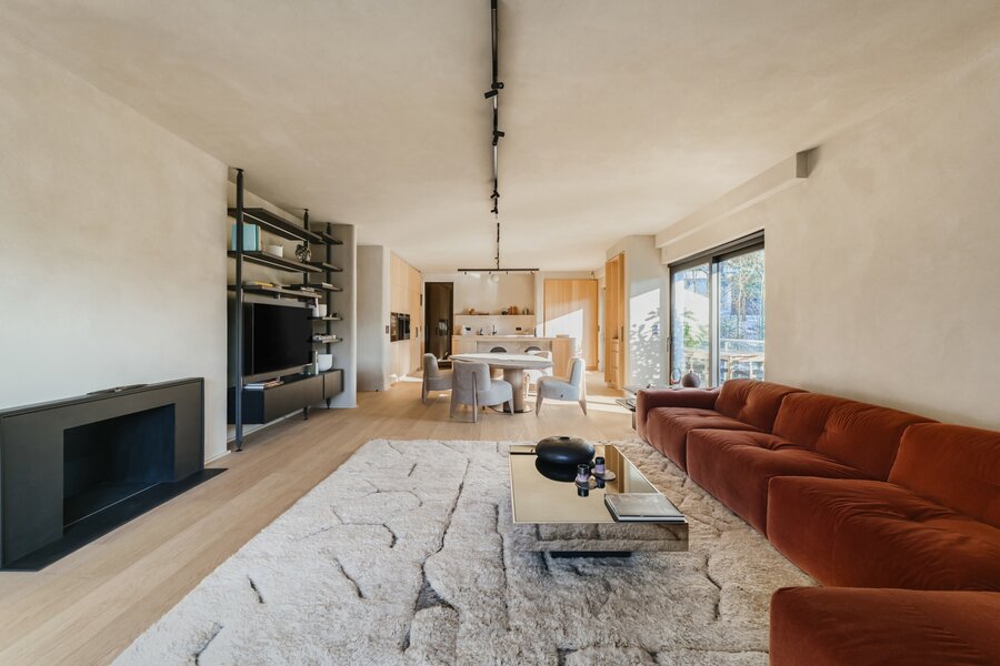 De leefruimte charmeert met een lichtrijke woonkamer, een hyperuitgeruste keuken en het gebruik van edele materialen zoals massieve eiken parketvloeren, natuurlijke pleisters en iepenhout, wat zorgt voor een elegante en rustgevende sfeer.
