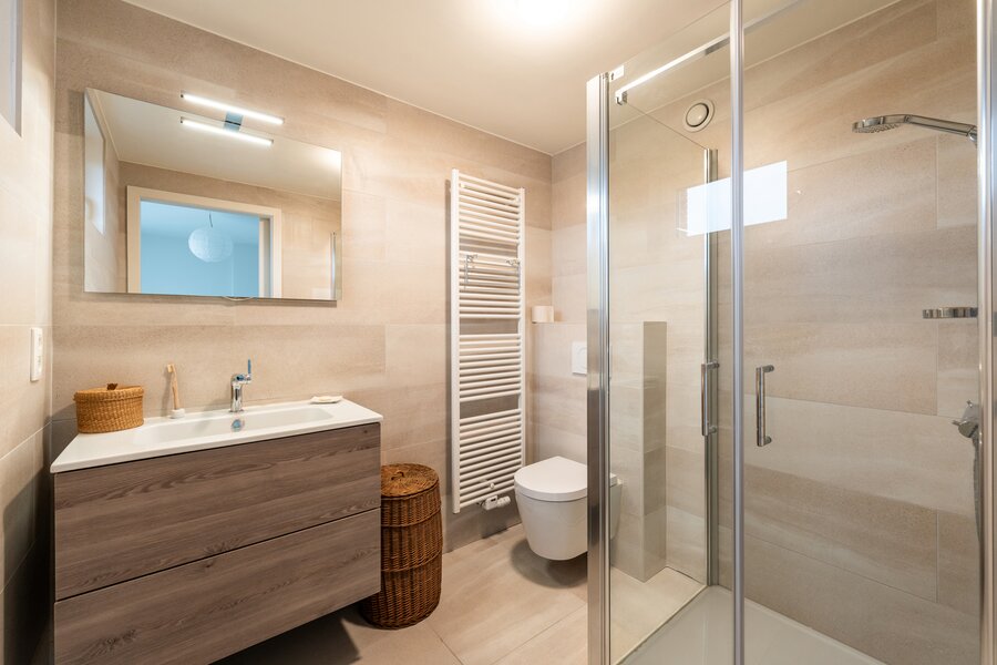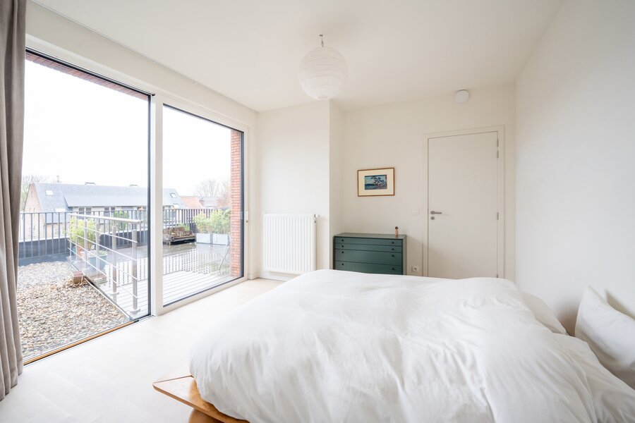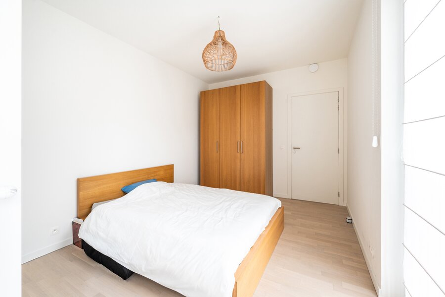 Slaapkamer (15,3 m² – parket) met doucheruimte (douche, enkele wastafel, toilet – 4,7 m² – tegelvloer)