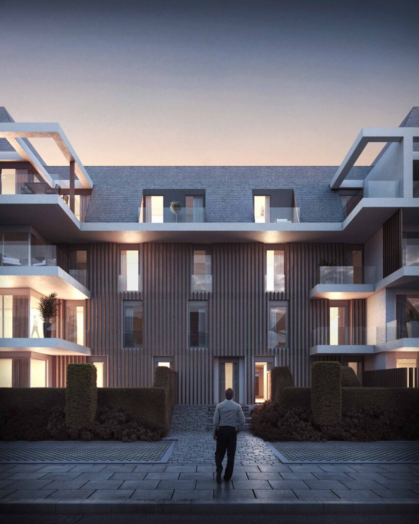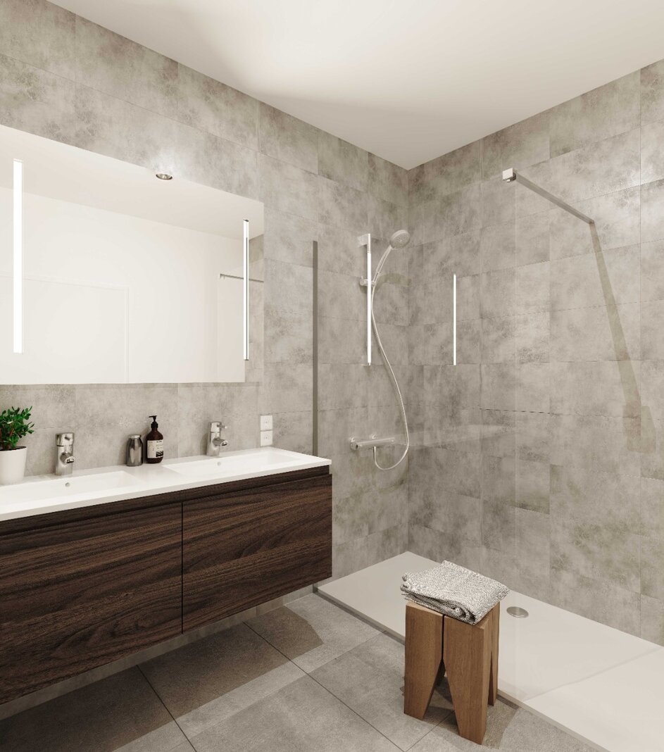 - op de 3de verdieping: Inkomhal, gastentoilet, trap, leefruimte met zithoek, eethoek, aangrenzend terras en open keuken met berging met aansluiting voor wasmachine, slaapkamer 1 met aangrenzend terras, badkamer 1 met dubbele wastafel in meubel en keuze tussen ligbad, inloopdouche of hoekdouche, ,