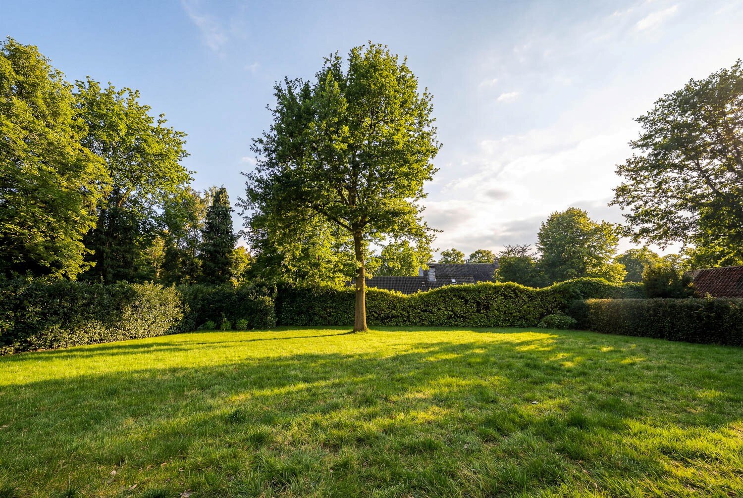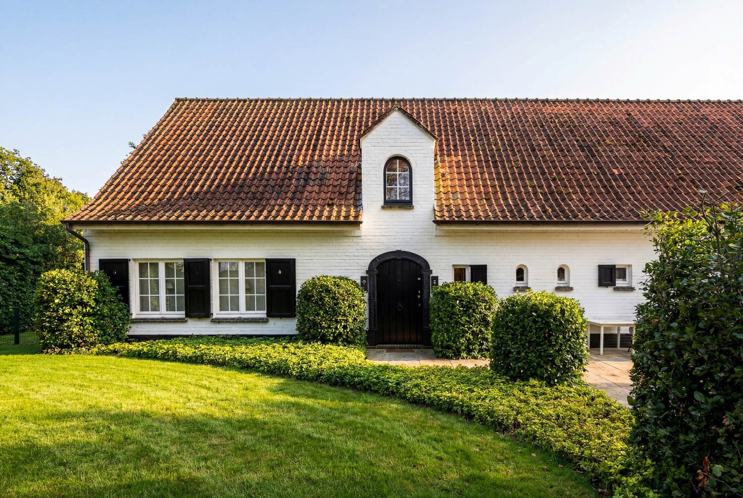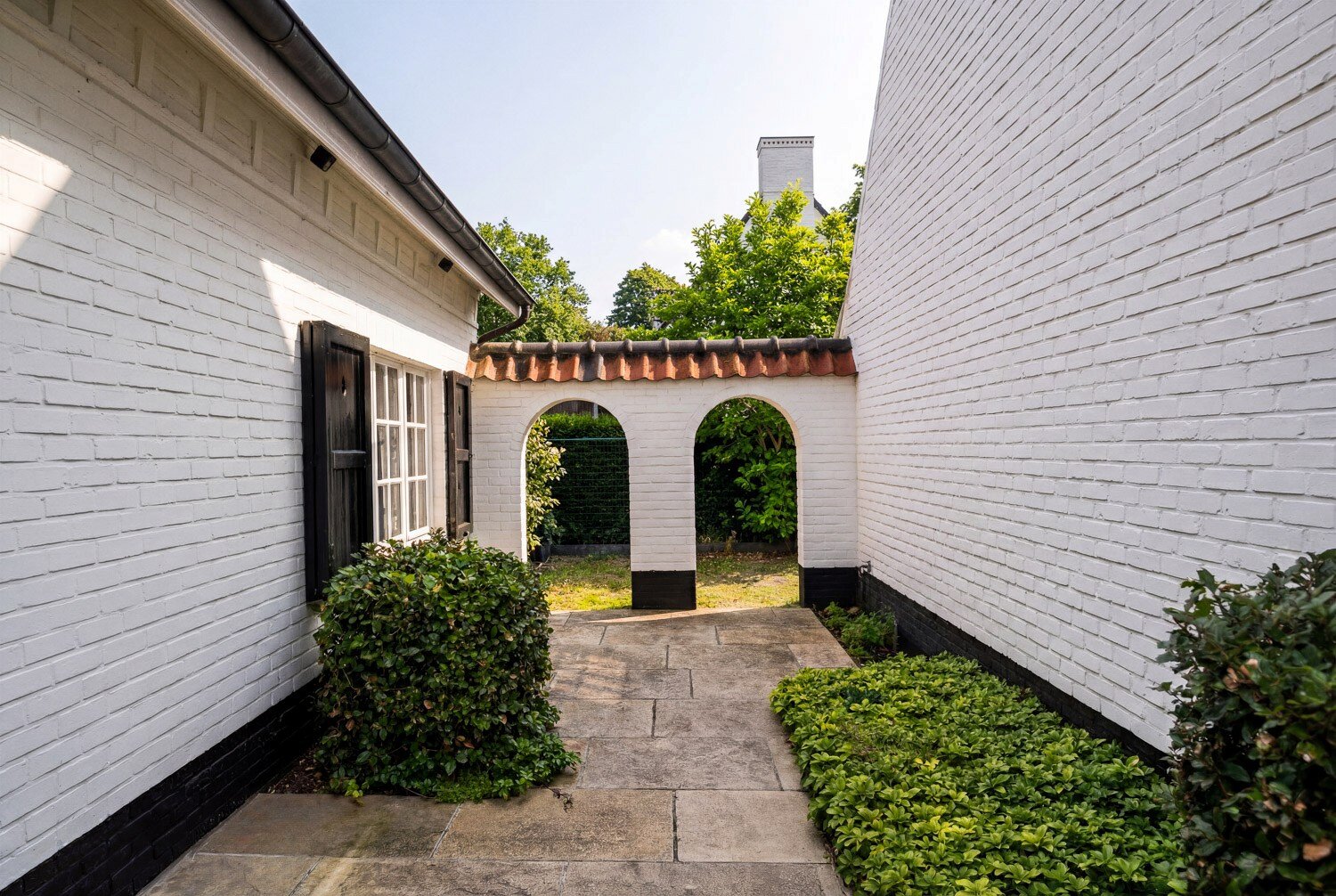 De tuin, aangelegd met volwassen beplanting, biedt zowel voor- als achteraan een optimale zuidoriëntatie en een uitgesproken gevoel van privacy. De inpandige garage voor twee wagens vervolledigt het praktische comfort van deze eigendom.