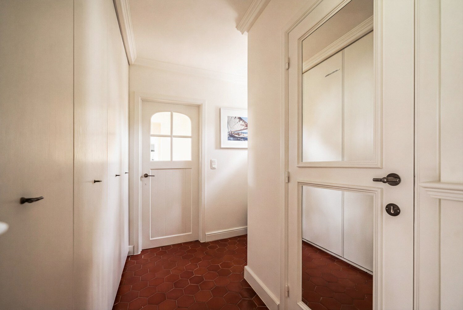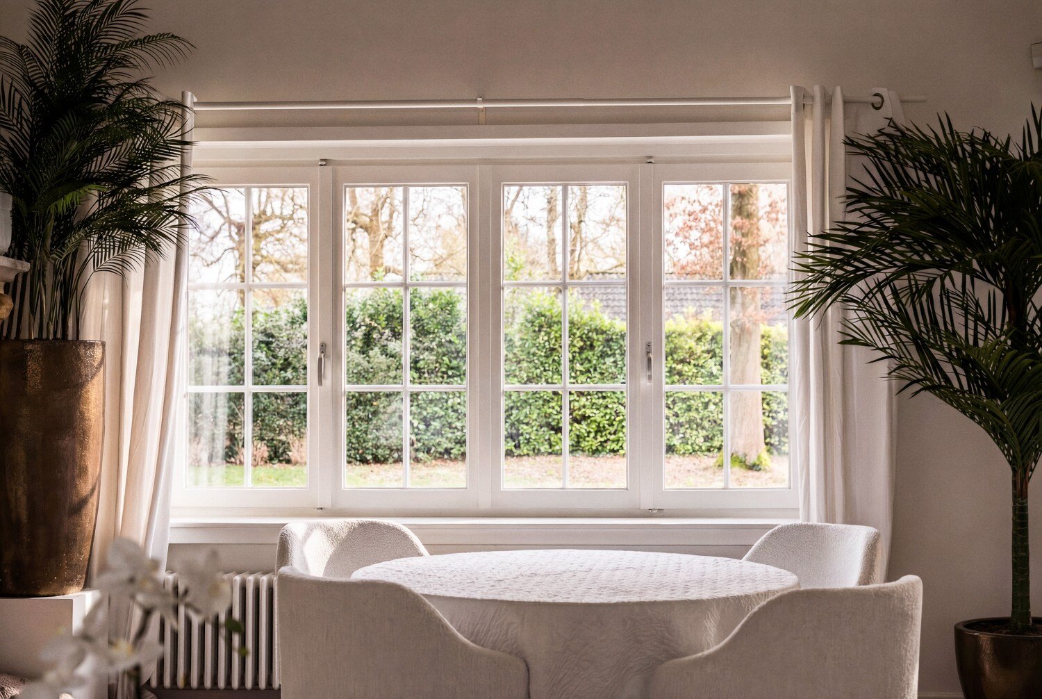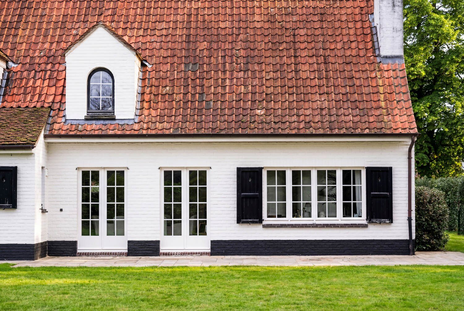 De tuin, aangelegd met volwassen beplanting, biedt zowel voor- als achteraan een optimale zuidoriëntatie en een uitgesproken gevoel van privacy. De inpandige garage voor twee wagens vervolledigt het praktische comfort van deze eigendom.