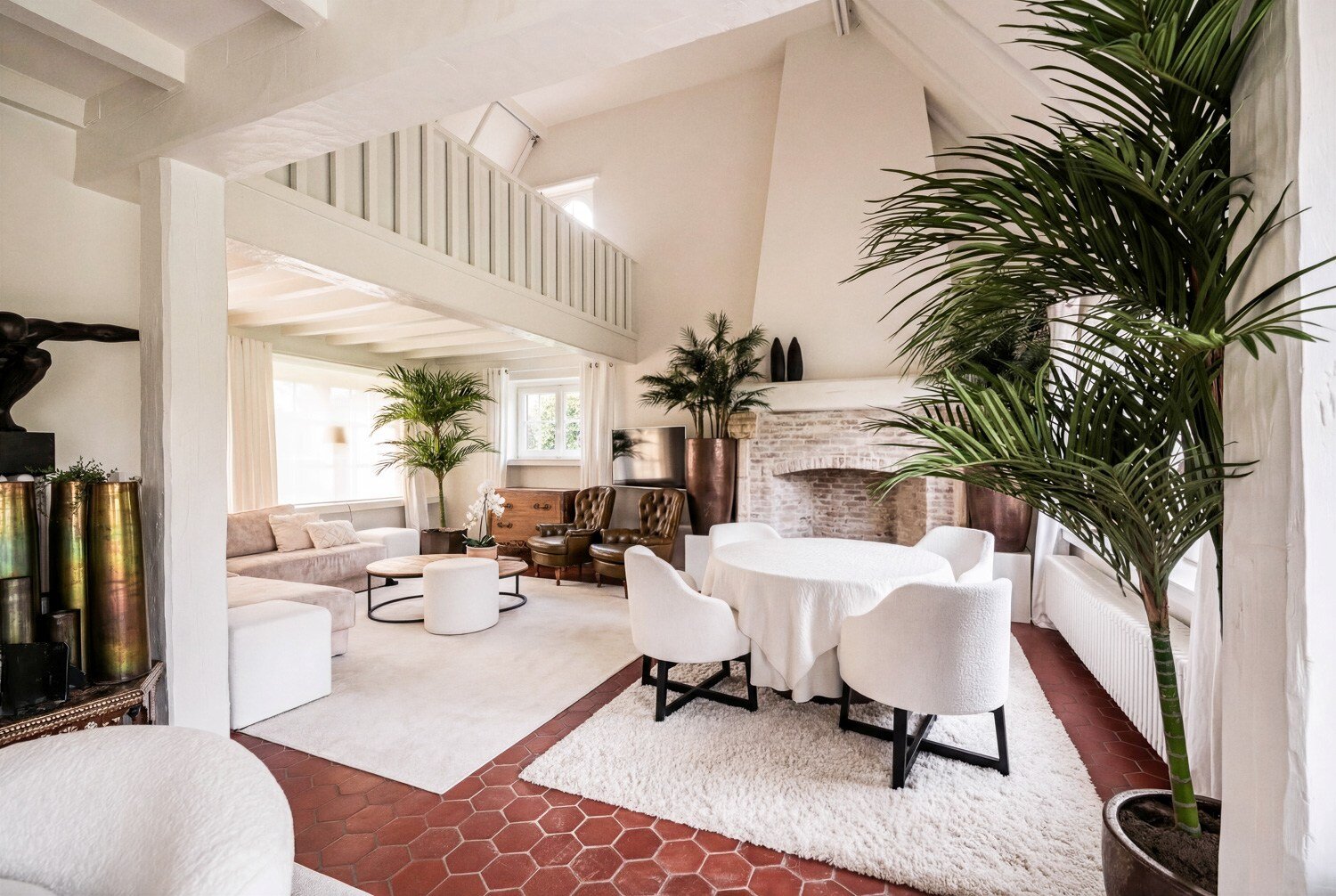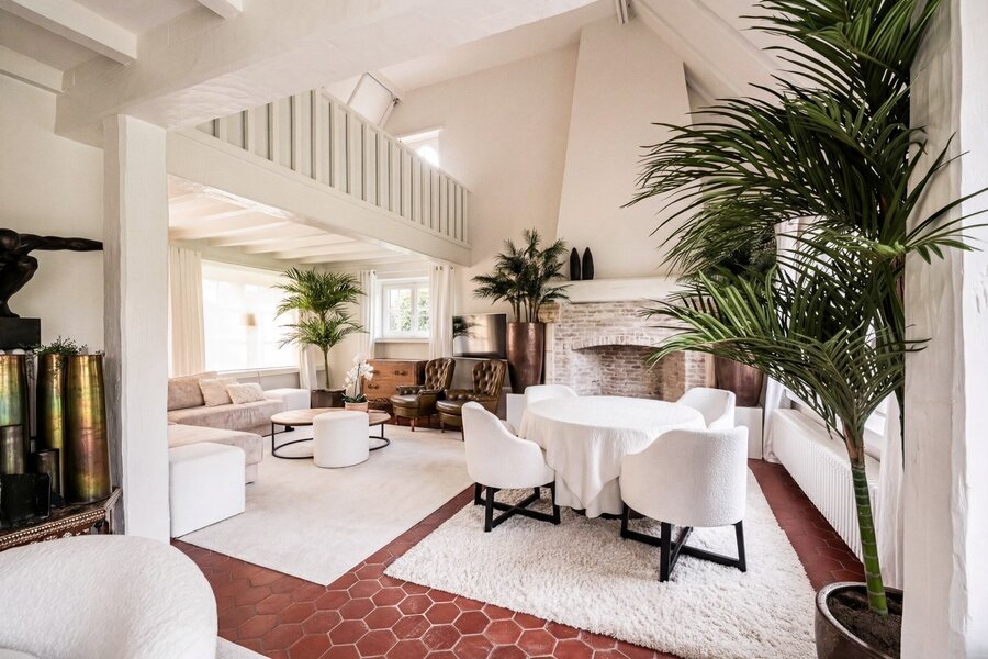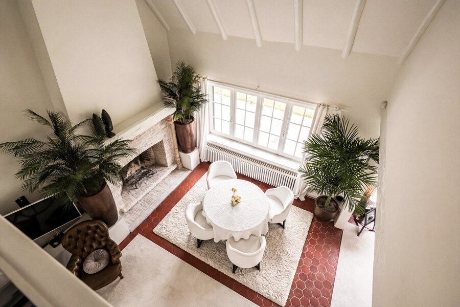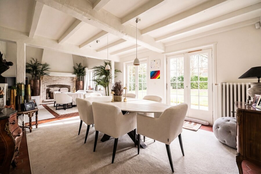 De living en eetruimte, opgetrokken tot in de nok, creëren een uitgesproken gevoel van ruimte en licht, terwijl de vele raampartijen het zonlicht diep in de woning binnenbrengen en een voortdurende dialoog met de tuin tot stand brengen. De keuken sluit harmonieus aan op het overdekte terras, een aangename plek om in alle rust van de avondzon te genieten.