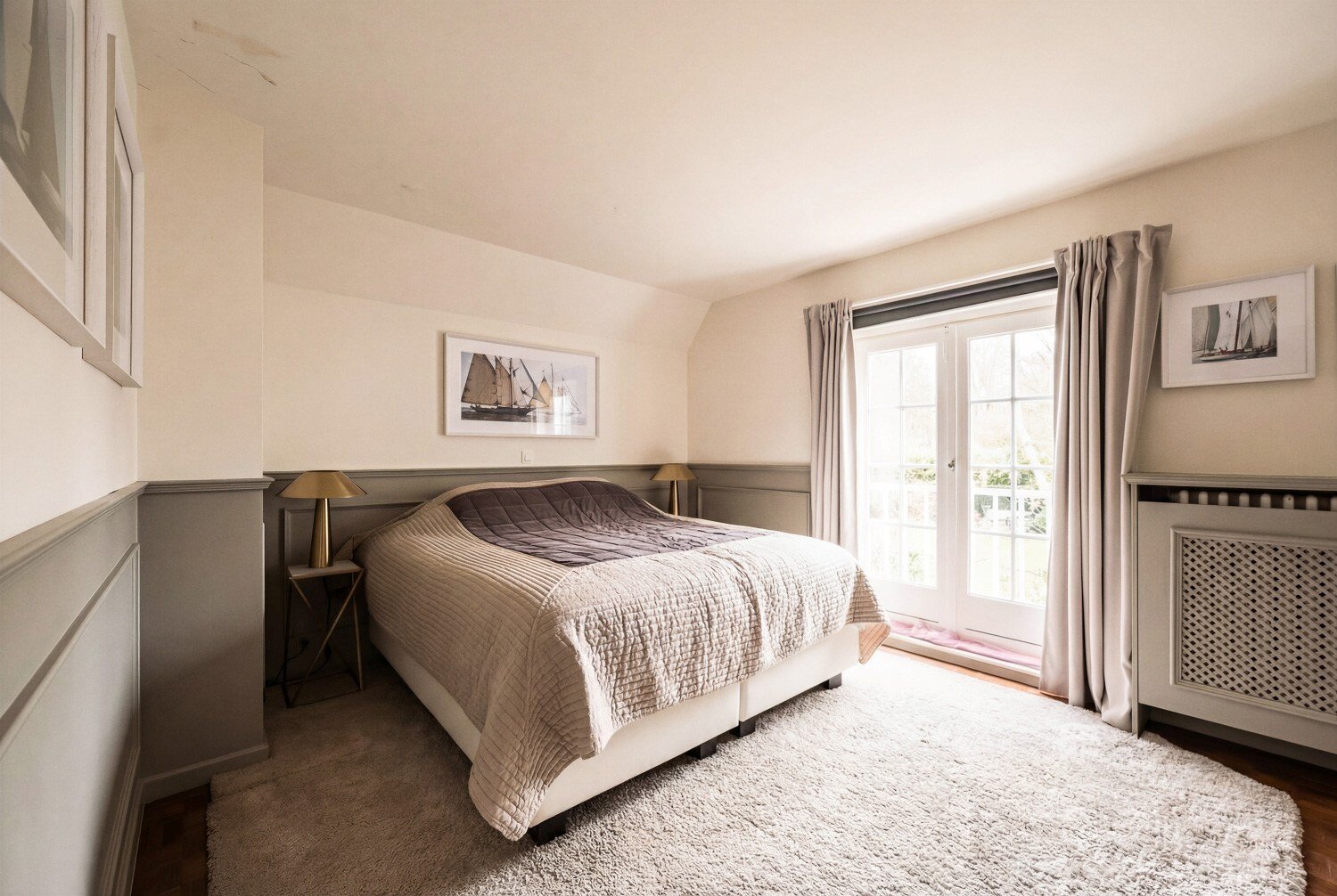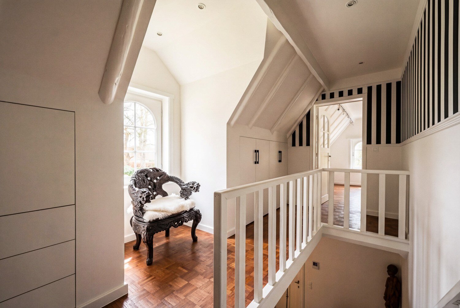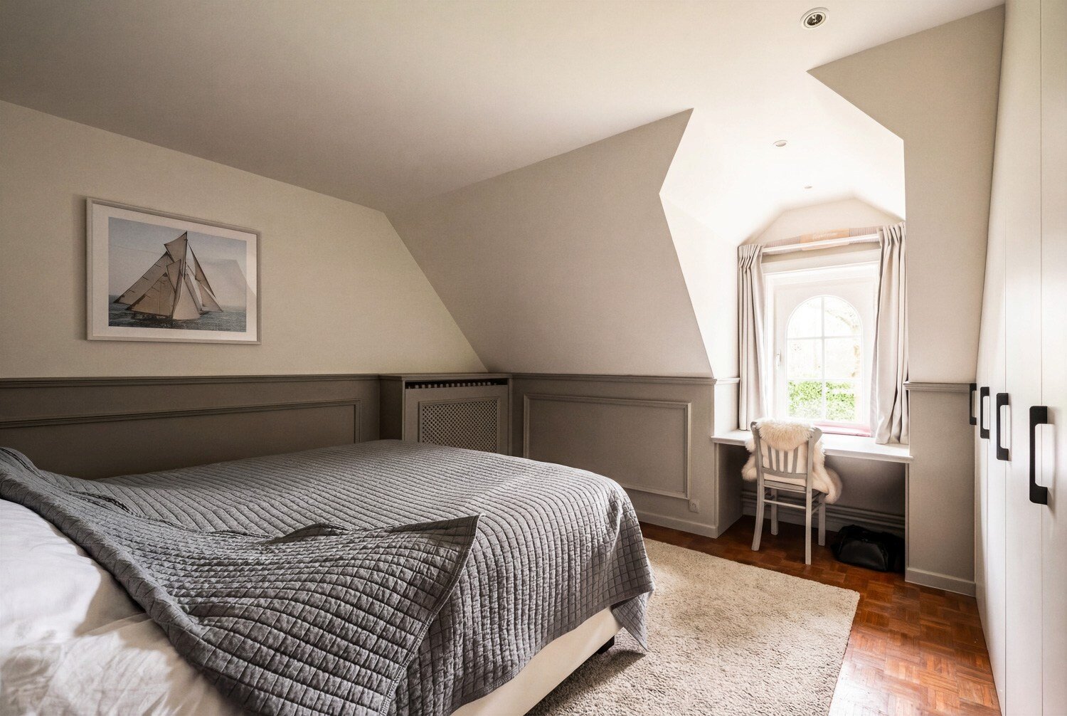 De living en eetruimte, opgetrokken tot in de nok, creëren een uitgesproken gevoel van ruimte en licht, terwijl de vele raampartijen het zonlicht diep in de woning binnenbrengen en een voortdurende dialoog met de tuin tot stand brengen. De keuken sluit harmonieus aan op het overdekte terras, een aangename plek om in alle rust van de avondzon te genieten.