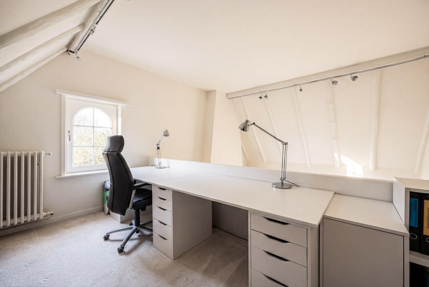 Het gelijkvloers wordt verder aangevuld met een wasruimte, een berging en twee polyvalente ruimtes die zich flexibel lenen tot bureau, praktijk of hobbyruimte. Op de verdieping bevinden zich drie volwaardige slaapkamers, een badkamer en een aparte bureauruimte.