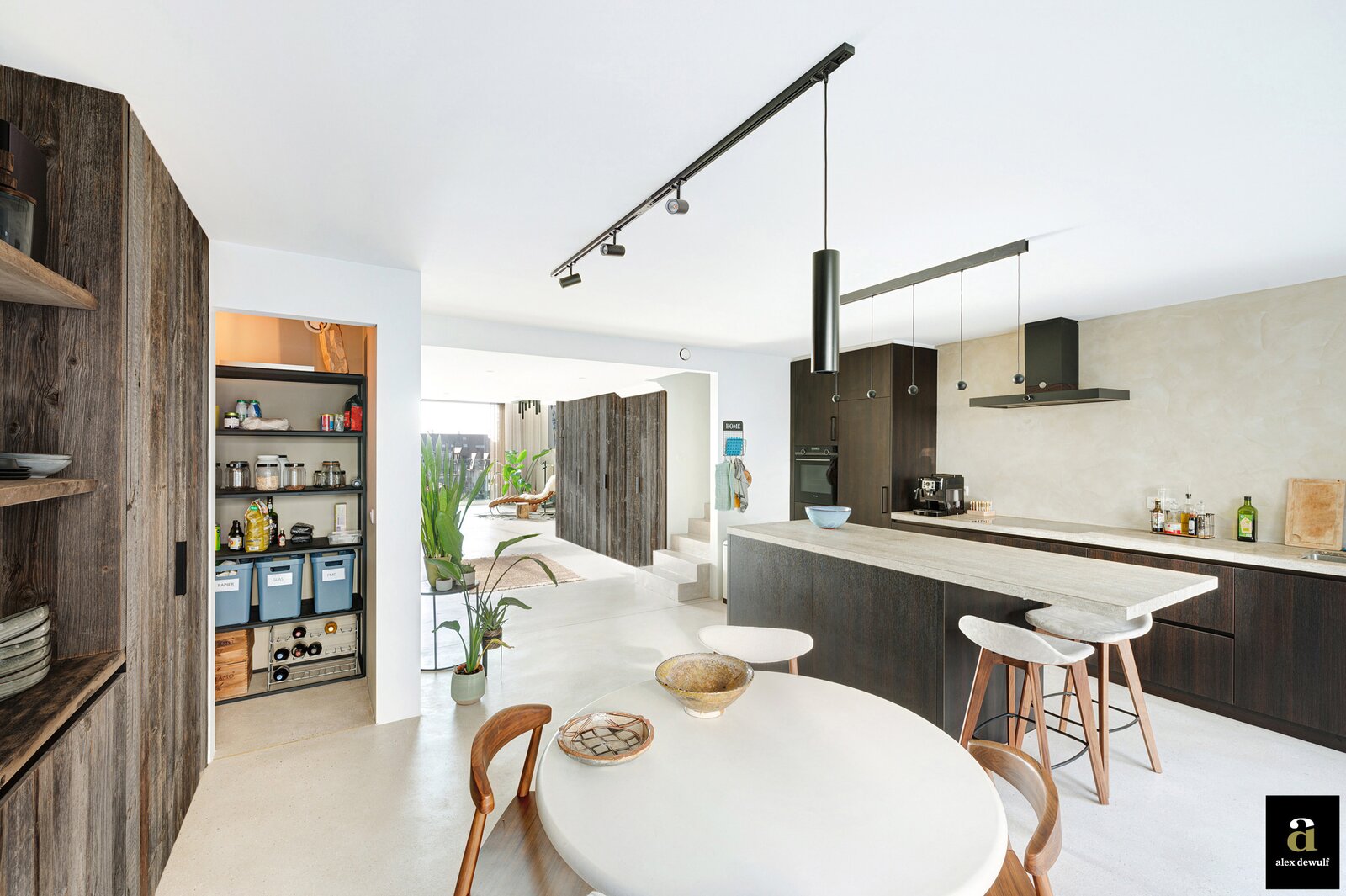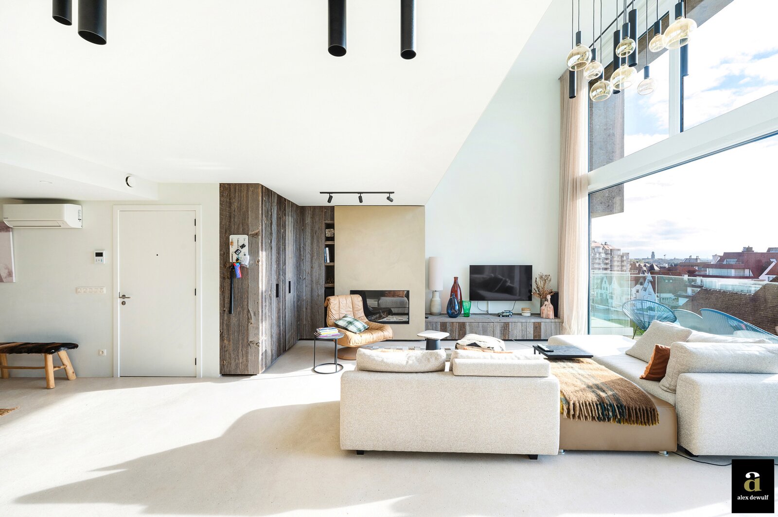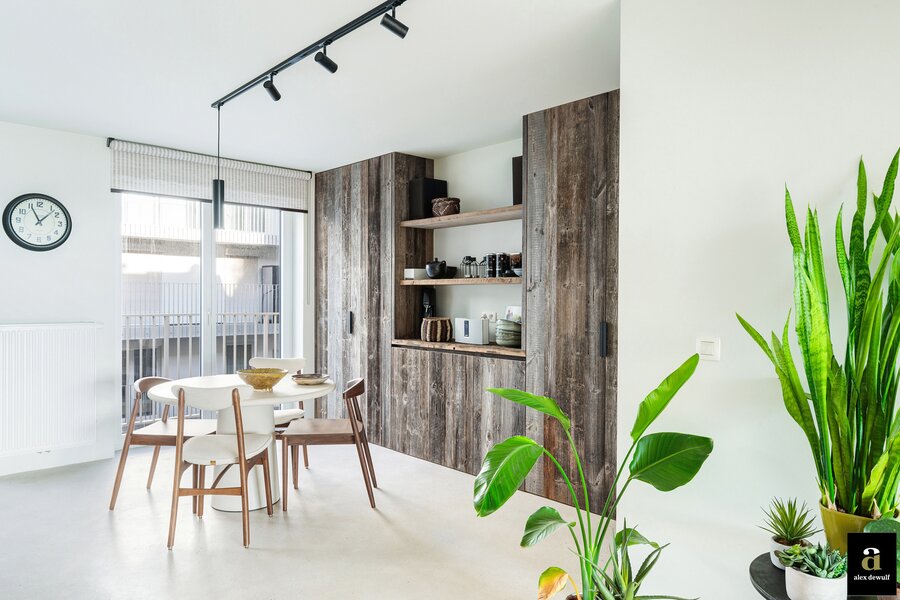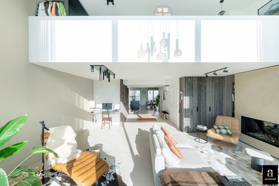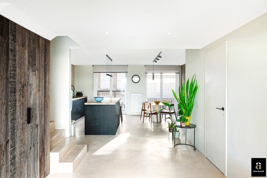 Dit appartement werd ingericht met hoogwaardige materialen en oog voor detail: maatkasten in barnwood, kalkpleistervloeren, parket op de bovenverdieping en badkamermeubilair in notelaar en ruwe eik. Zonnewerend glas aan de zuidzijde en elektrische zonneschermen zorgen voor optimaal comfort.