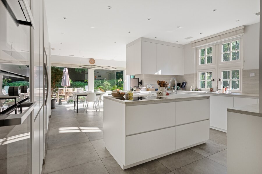 Bij binnenkomst komt u in een centrale hal met vestiaire, gastentoilet en trap naar de bovenverdieping. Vanuit de hal heeft u toegang tot een royale leefruimte met zitkamer, eetkamer, studeerkamer en ruime leefkeuken. De sfeervolle keuken heeft een ontbijtkamer met grote schuifdeuren naar buiten, een kookeiland en moderne apparatuur zoals een Amerikaanse koelkast en stoomoven.