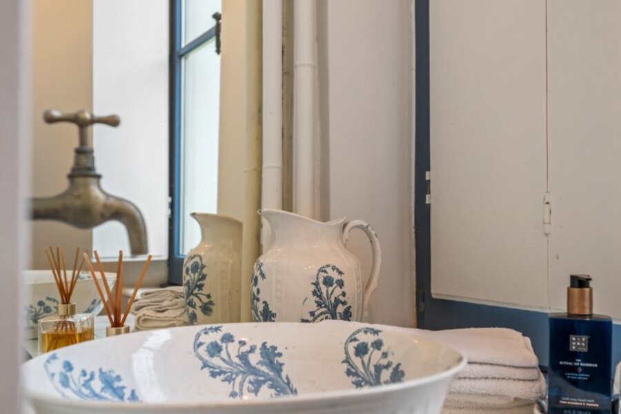Op de eerste verdieping heb je 2 ruime slaapkamers, waarvan de master bedroom een ensuite dressing heeft en een erg ruime badkamer met losstaand bad en zicht op de parktuin en een ruim bureau/kamer. Aan de diensttrap is nog een kleine badkamer met toilet.