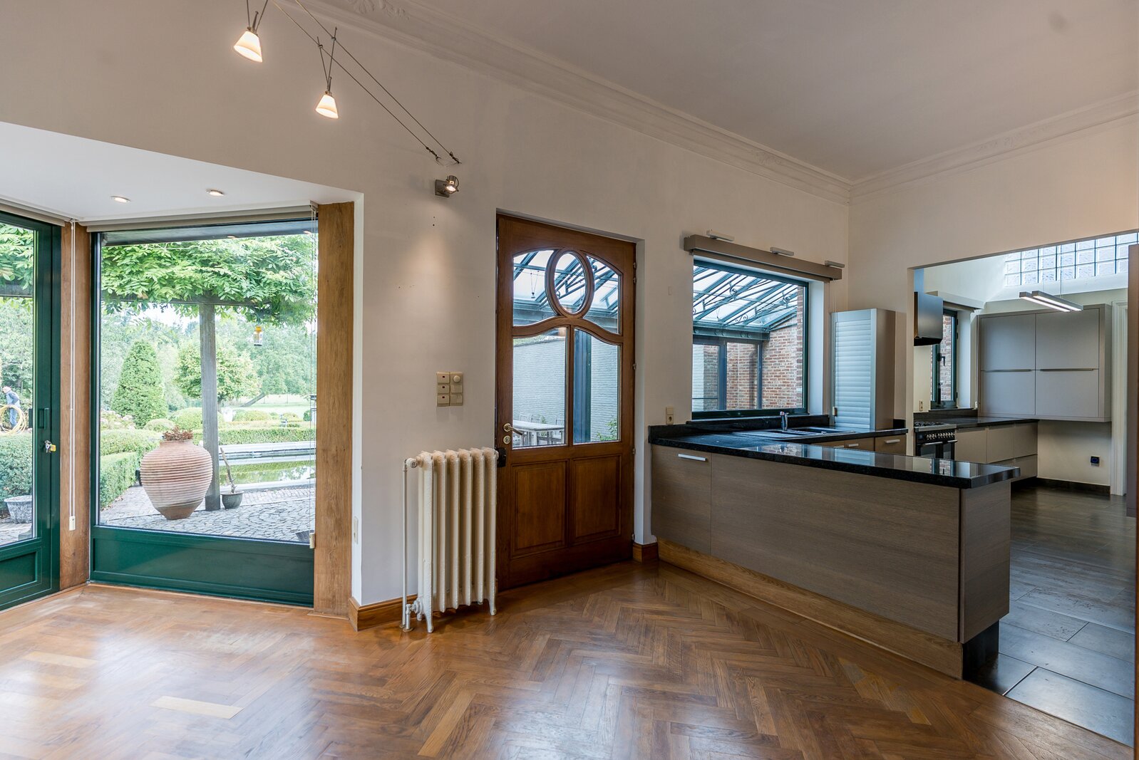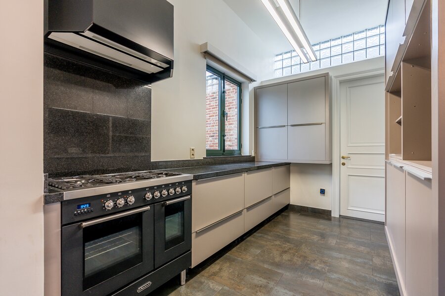 Er is aansluiting naar de leefruimte die door een authentieke 4-luik kan opgedeeld worden in een zit- en eetgedeelte. De open keuken staat op haar beurt in verbinding met de eetkamer. Zowel vanuit de eetkamer als keuken kijk je uit over de aangelegde tuin met vijverpartij. Achteraan de woning is er een lichtrijke tuinkamer waar het aangenaam vertoeven is in de tussenseizoenen. Deze werd ook uitgerust met een zonneluifel.