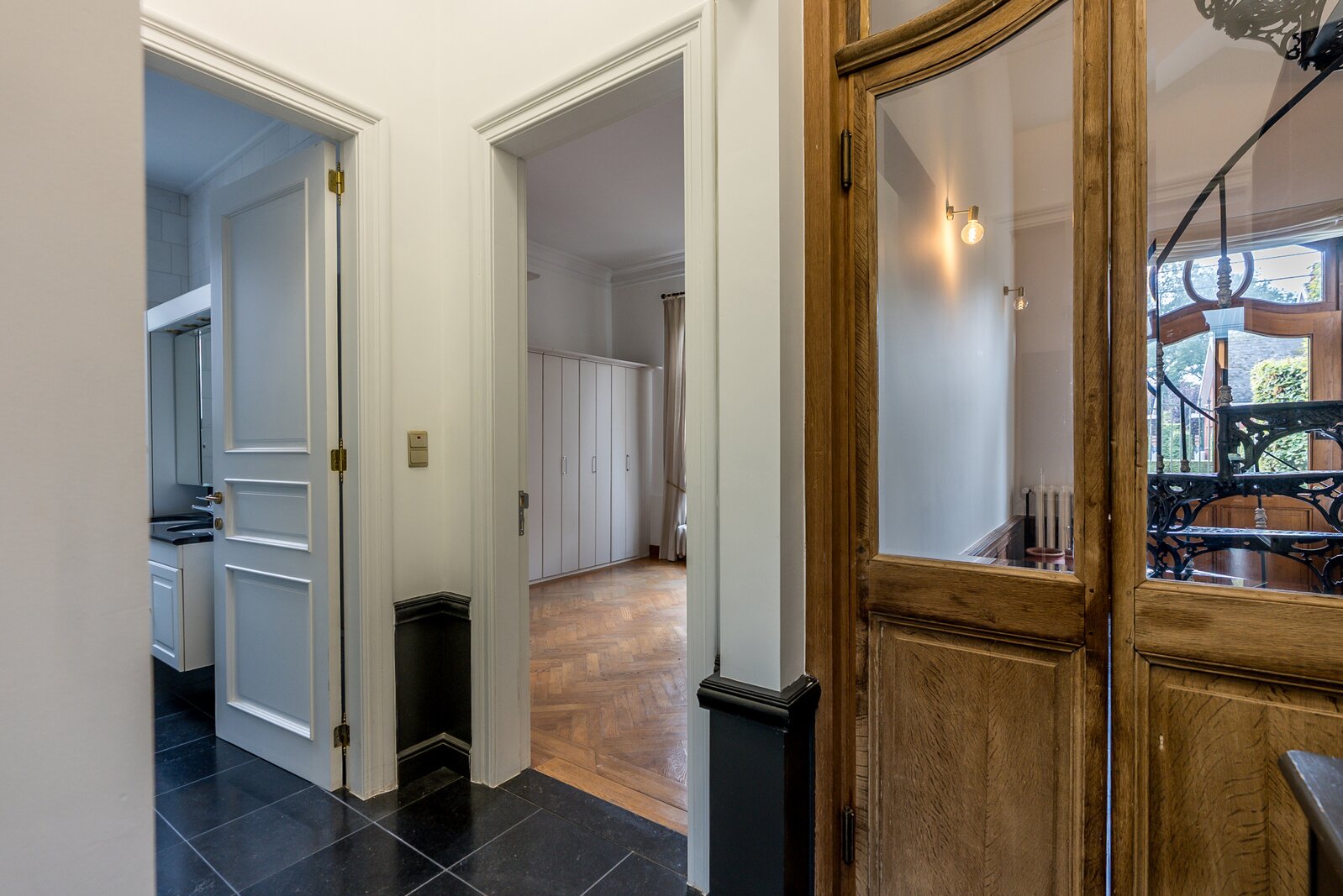 Via de inkomhal betreden we de woning. Zowel de smeedijzeren wenteltrap als het hoge plafond springen hier onmiddelijk in het oog.