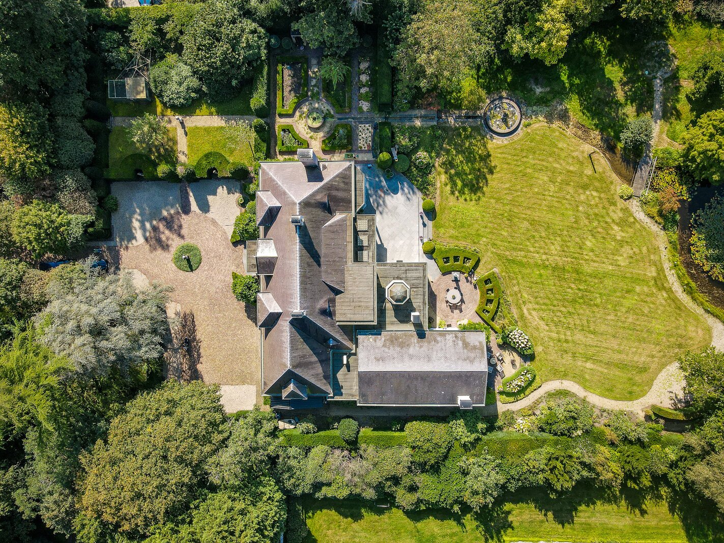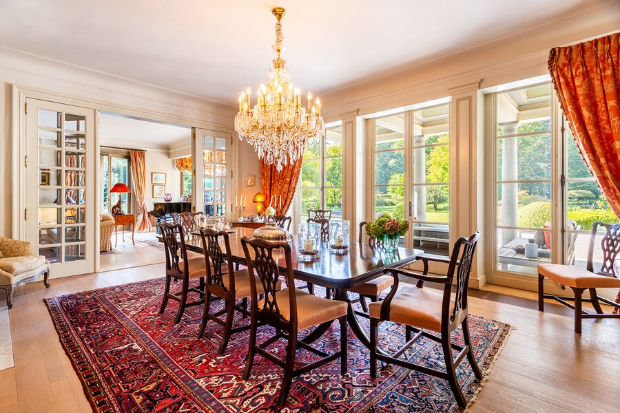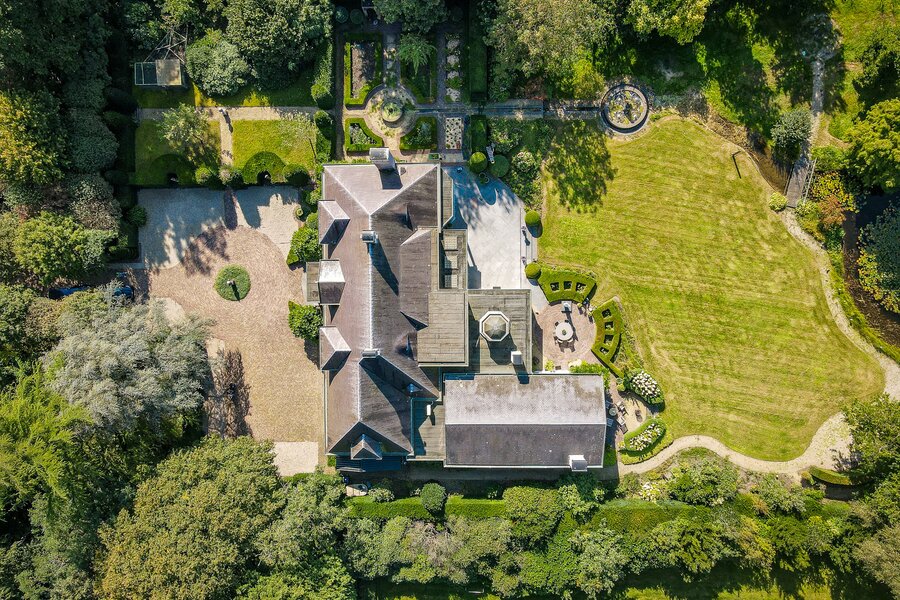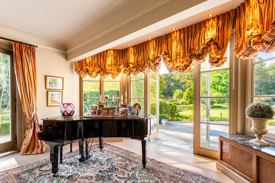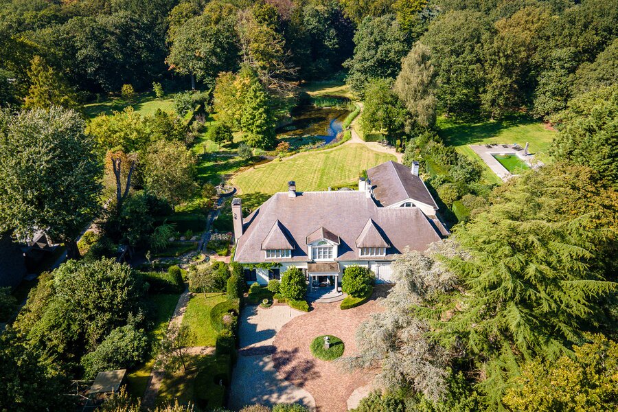 Bij binnenkomst verwelkomt de royale hal u en leidt u links naar een salon en een ruime woonkamer, beide met een prachtig uitzicht op de zorgvuldig aangelegde, groene tuin. Vanuit de woonkamer loopt u via een deur naar een aparte eetkamer. Verderop in de eetkamer komt u in de volledig uitgeruste keuken, die aansluit op een ruime familiekamer met directe toegang tot het luxueuze binnenzwembad. Rechts in de inkomhal bevindt zich een stijlvolle bureau en een praktische vestiaire. De woning beschikt over twee inpandige garages, waarbij de meest rechtse garage toegang biedt tot een volledig uitgeruste fitnessruimte, een kleedkamer en een ontspannende spa met een Turks bad.