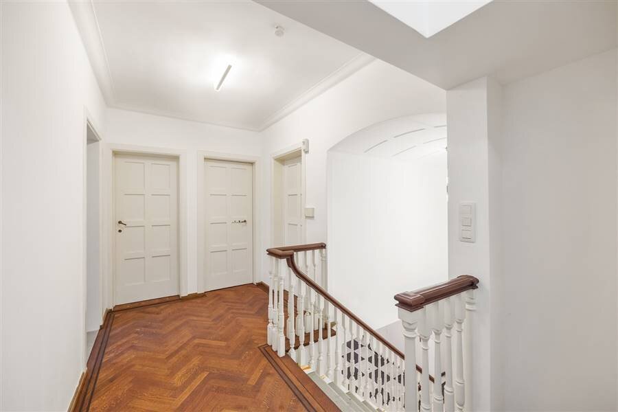 Op de eerste verdieping bevinden zich 4 slaapkamers en 2 badkamers. De masterbedroom (ca. 24 m²) kijkt uit op de tuin en is voorzien van een ruime badkamer met ligbad, dubbele wastafel en toilet. Bovendien is er een aparte dressing. Verder is er een bureel met gepantserde deur, met zicht op de voortuin.