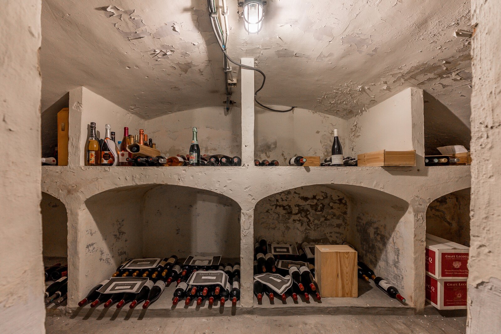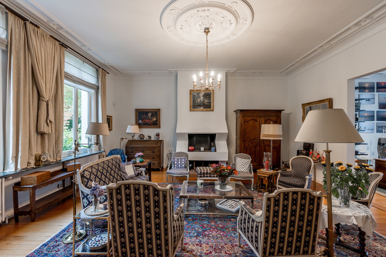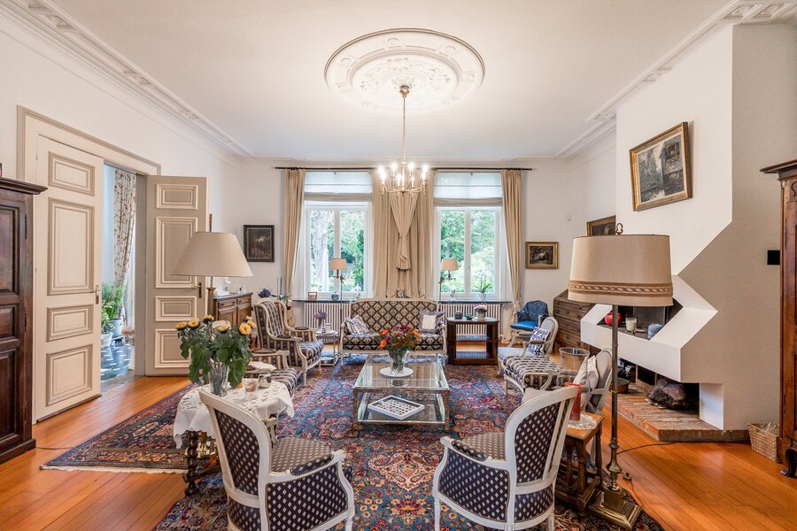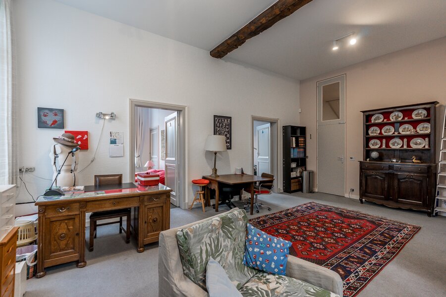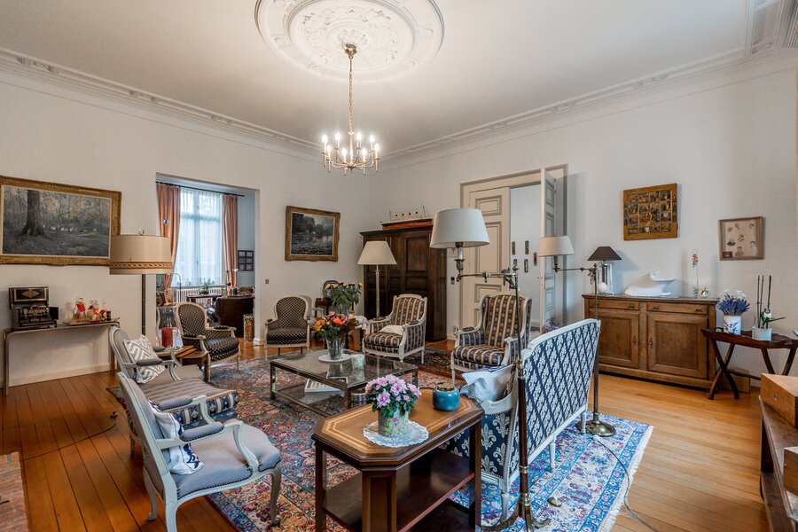 Rechts van de inkomhal bevindt zich een grote woonkamer met aansluitend kantoor. Let vooral op de molures, hoge plafonds en de dubbele ingelegde deuren met oog voor details. Links van de inkomhal treffen we vooraan een charmante eetkamer met decoratief kastwerk. De keuken uitgerust met kastwerk, eiland en toestellen, is te vernieuwen maar biedt veel mogelijkheden alleen al door de oppervlakte. Aan proviandruimte alleszins geen gebrek in de gewelfde kelders. Een tweede cv kelder te bereiken via de zijkant is ook aanwezig.