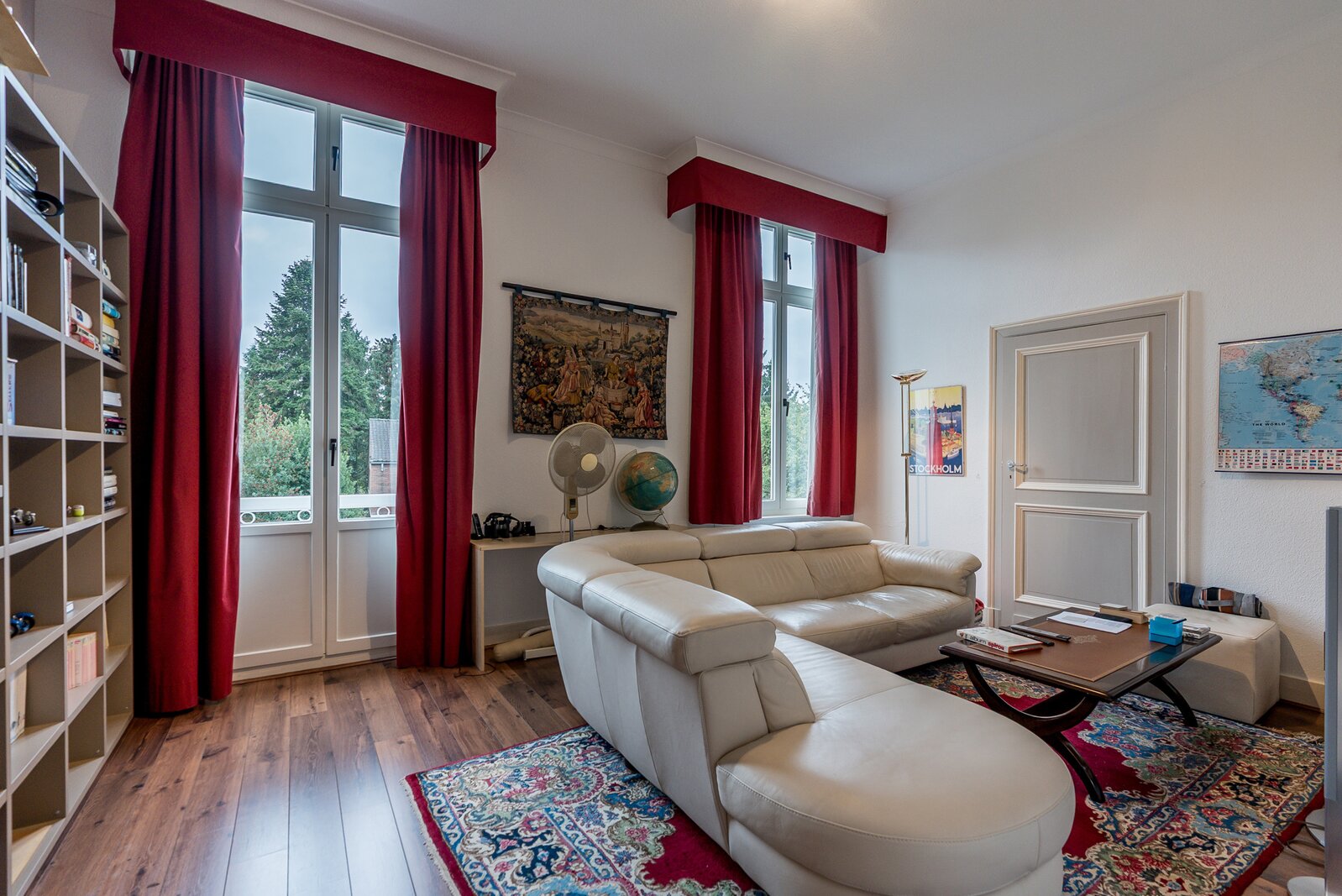 De statige inkomhal loopt van de voordeur tot de toegang naar de tuin. Eyecatchers zijn de vloeren uit zwarte leisteen en centraal in de woning de authentieke gedraaide trap, een combinatie van gietijzer en eik en recent voorzien van een nieuwe roodfluwelen traploper.