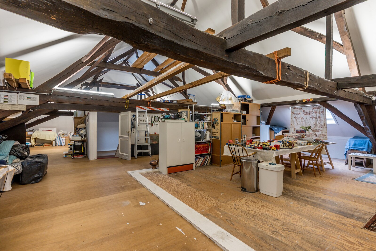 Eerste verdieping met de ouderslaapkamer met dressing en een aansluitende badkamer. Voorts twee met elkaar verbonden slaapkamers en rechts een erg grote kamer momenteel in gebruik als hobbykamer met badkamer en toegang tot 2 extra slaapkamers. Omvorming tot een apart woonvertrek met alle voorzieningen is perfect mogelijk (co-housing, gastenverblijf?,...) . Vaste trap naar de zolderverdieping, een enorme verwarmde en geïsoleerde speelzolder. Opdeling in extra kamers is perfect mogelijk.