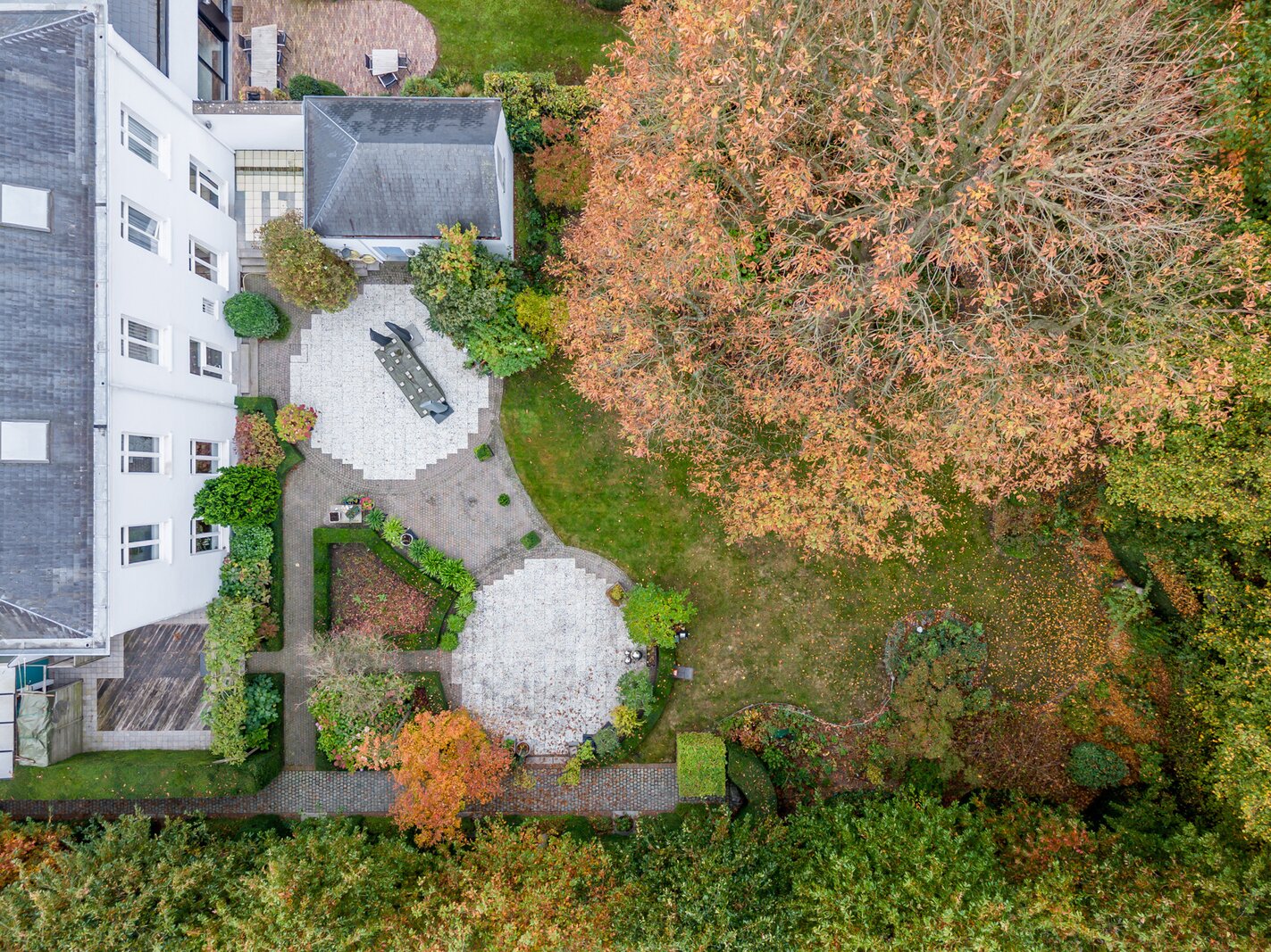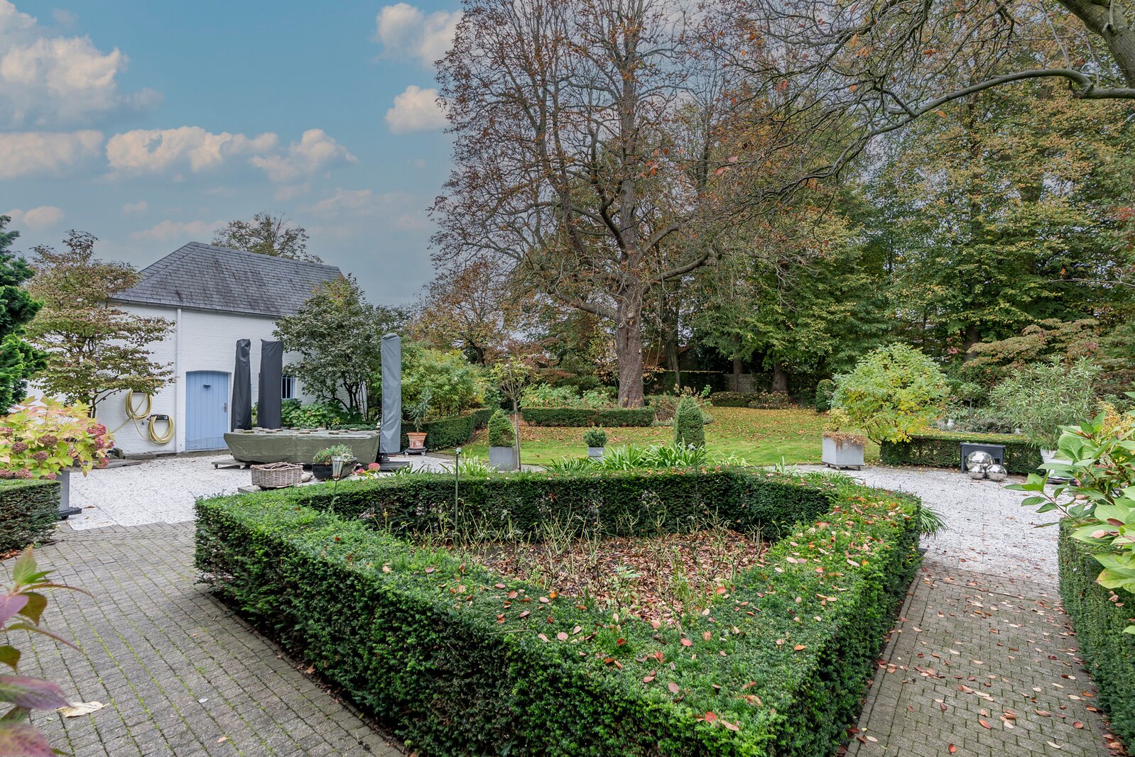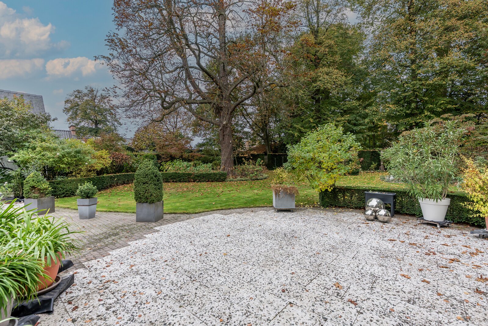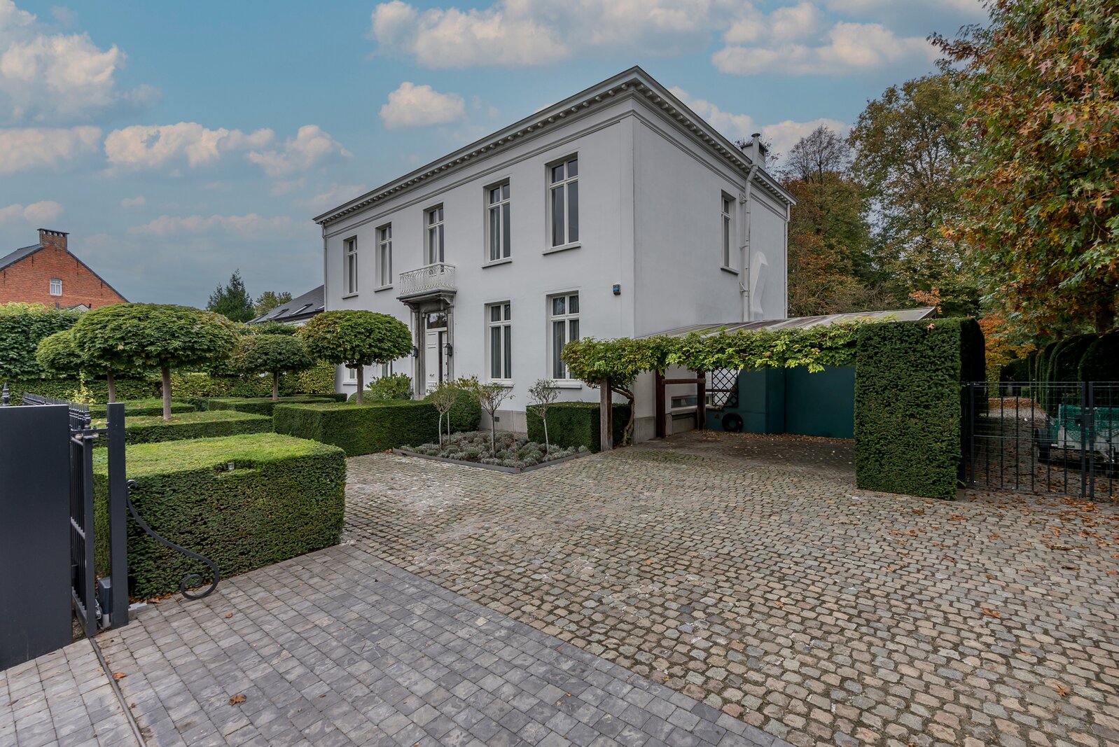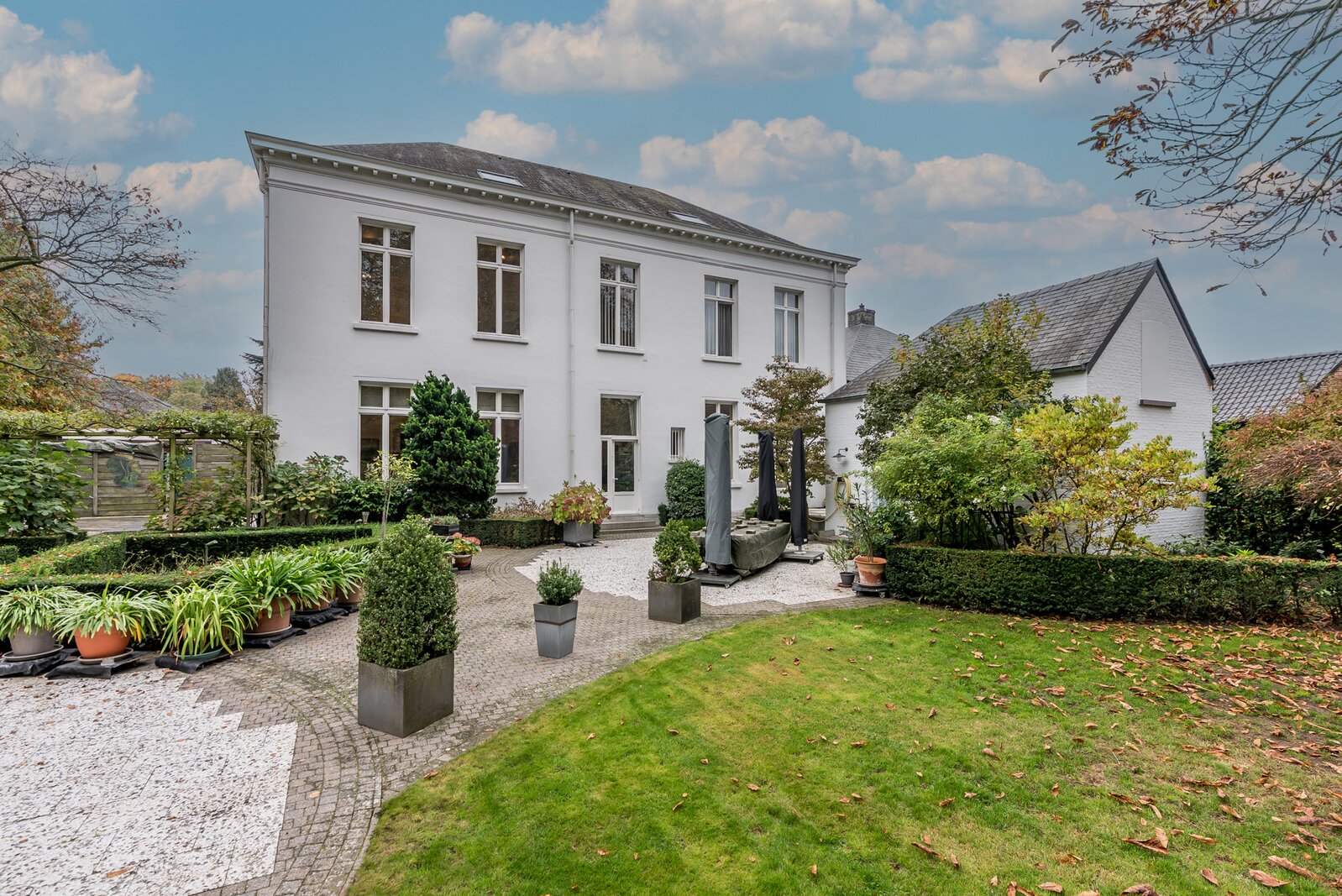 Achteraan de woning treffen we een erg mooie parktuin met een groot terras, een charmant "tuinhuis", oude bomen (oa lindebomen, Amerikaanse eik, kastanjeboom) en vooral veel privacy en rust... Vooraan een parking en een carport voor 2 wagens. Langszij ligt een oprit tot in de tuin gescheiden van de woning door een hoge haag.