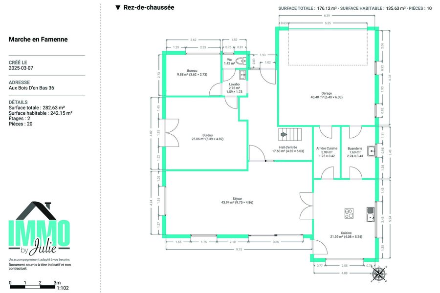 Vanaf de inkomhal zult u onder de indruk zijn van de royale volumes en de lichtinval in elke kamer. De ruime woonkamer van 44 m², die uitkomt op het terras en de tuin, is een gezellige en verfijnde leefruimte. De volledig uitgeruste moderne keuken, met bijkeuken en aangrenzende wasruimte, voldoet perfect aan de dagelijkse behoeften.