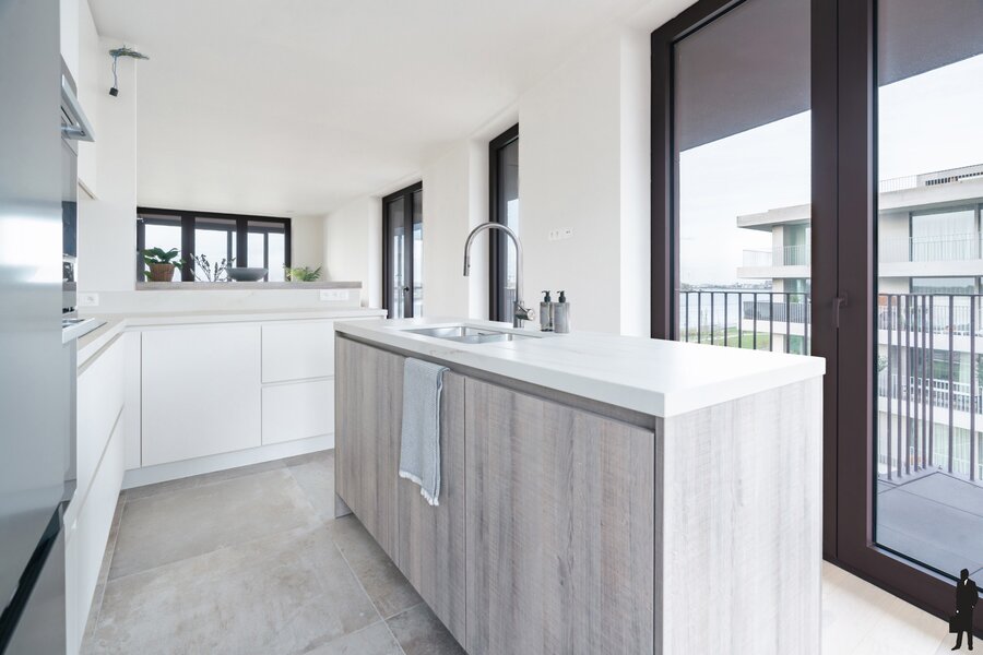 De open keuken met centraal kookeiland is ontworpen voor wie graag kookt en gezellig tafelt, rechtstreeks verbonden met het terras aan de oostzijde.