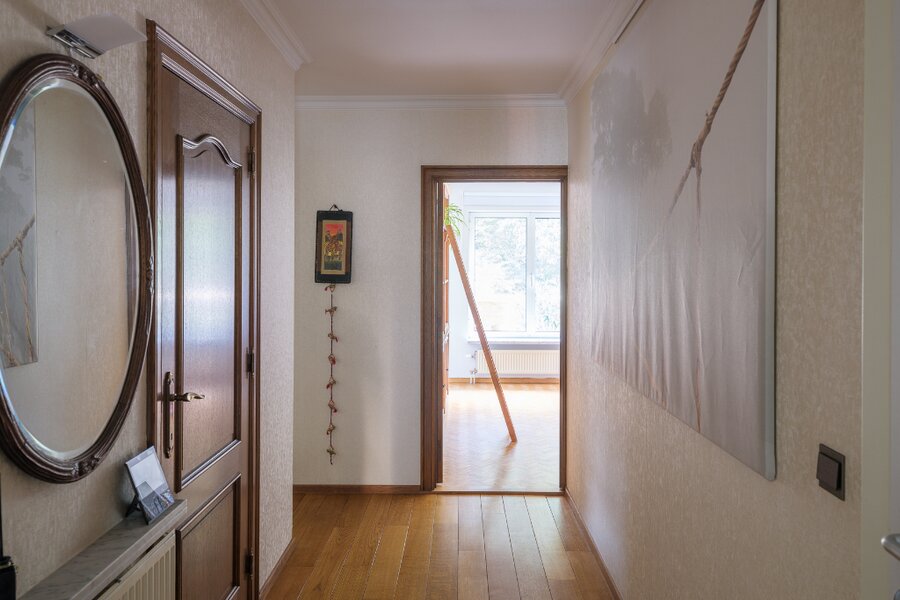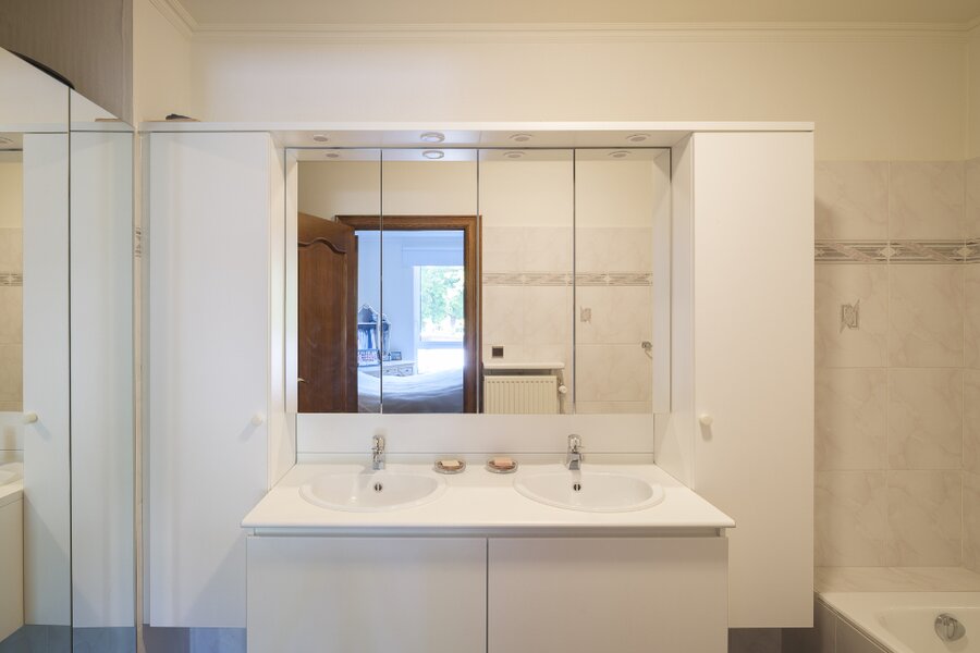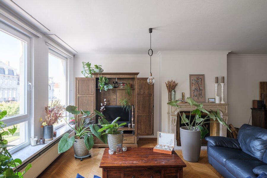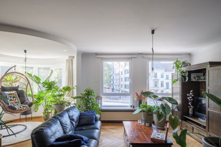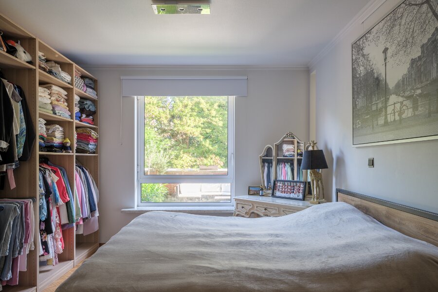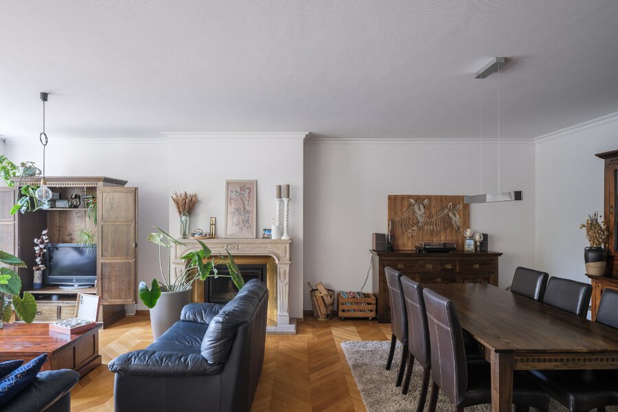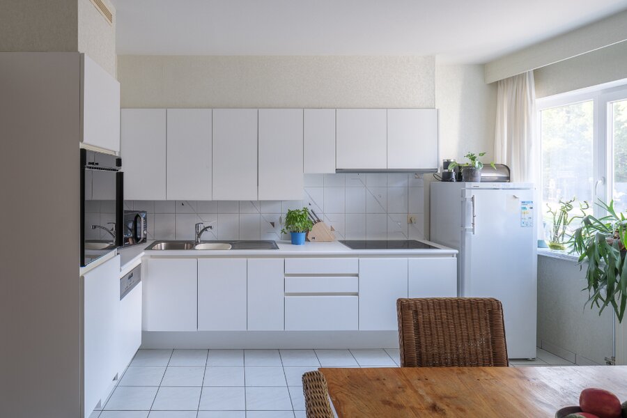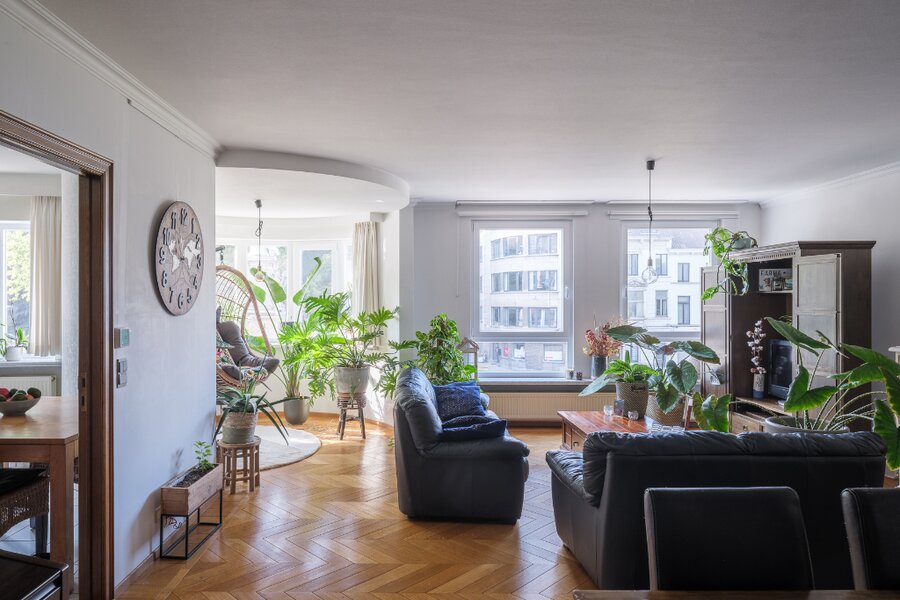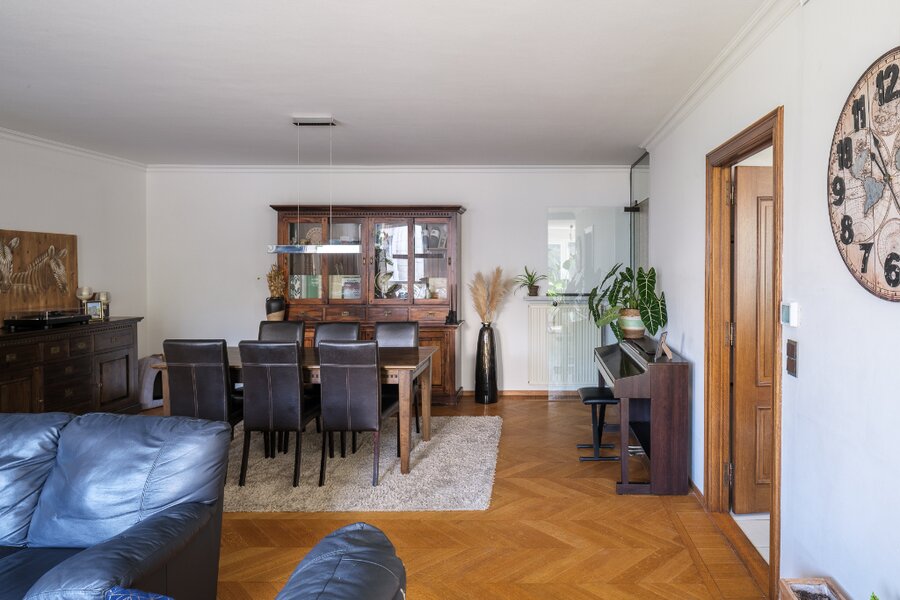 Het appartement, dat steeds met grote zorg werd onderhouden, beschikt over een praktische indeling met een grote leefruimte en eetplaats die samen één geheel vormen. Aansluitend aan de eetplaats bevindt zich een ruime keuken met plaats voor een ontbijttafel en een bijkeuken/wasplaats. Via de ruime inkomhal met gastentoilet krijgen we toegang tot de achtergelegen badkamer en de drie slaapkamers, waarvan één kamer momenteel dienstdoet als dressing. Via deze kamer bereiken we ook het terras, dat met zijn uitzonderlijke oppervlakte en uitzicht op het groen een unieke meerwaarde biedt.