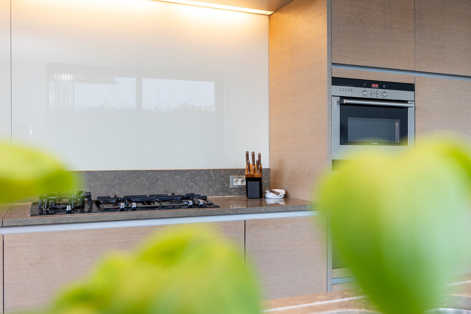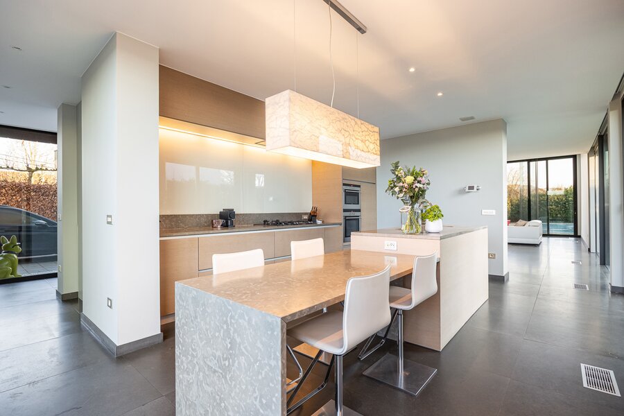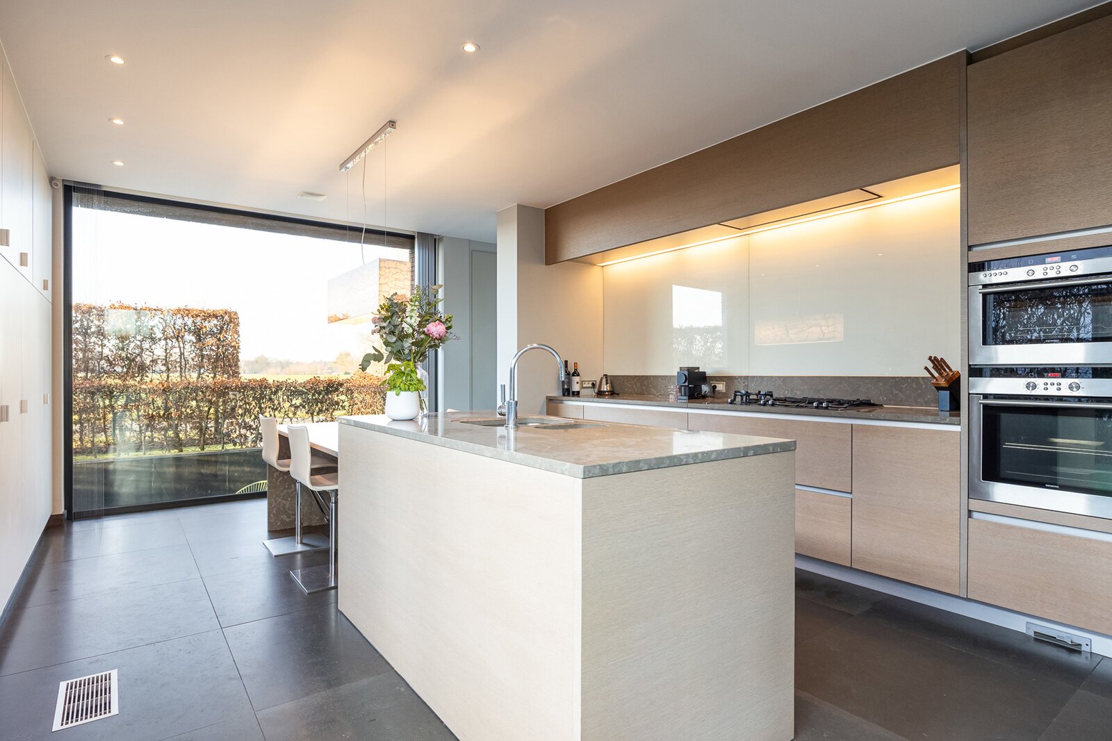 Rechtsom bereik je de keuken, deze is super praktisch met ruime werkbladen in natuursteen en voorzien van alle moderne apparatuur. Er zijn grote raampartijen, zeer veel kastruimte en een gezellige eettafel.