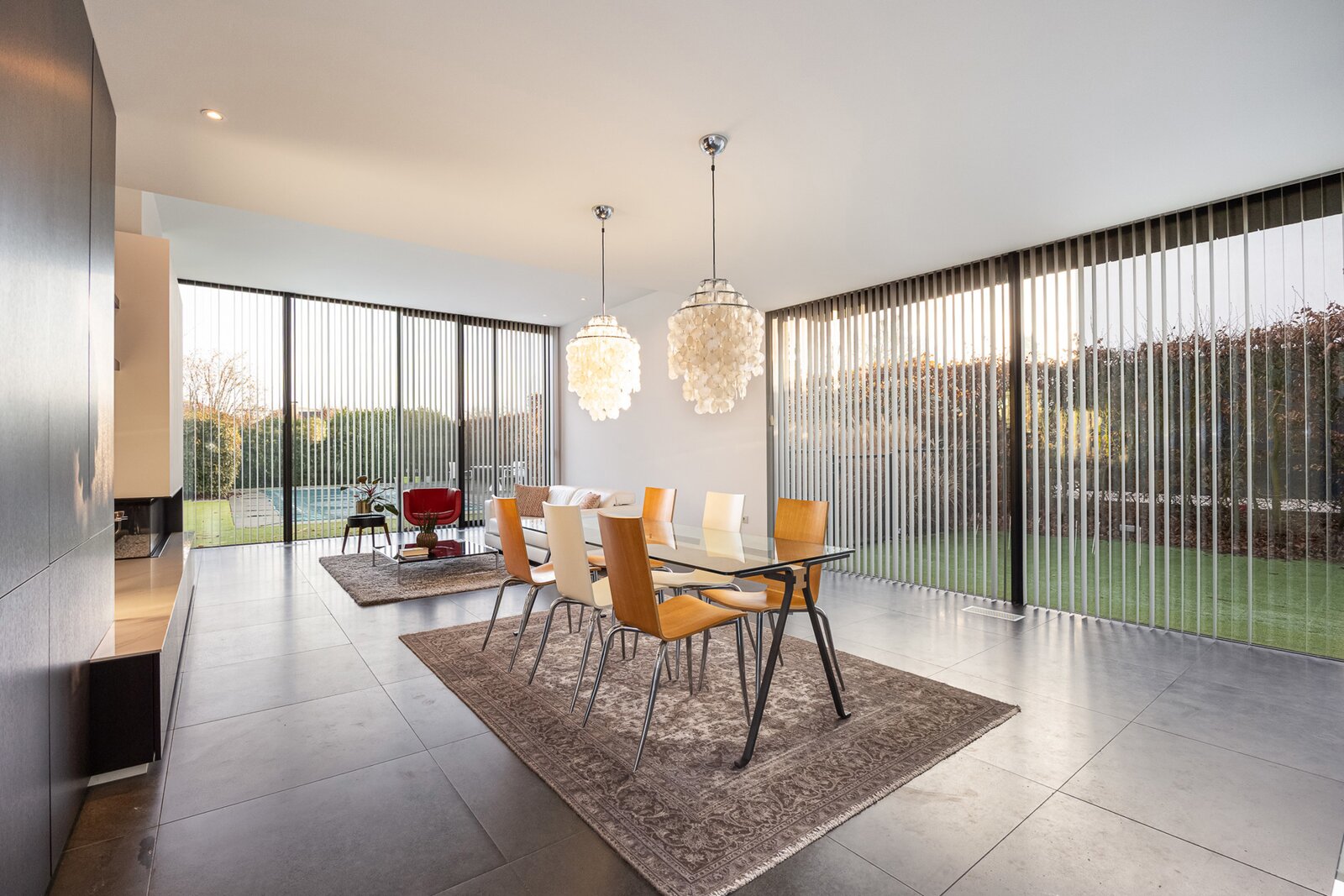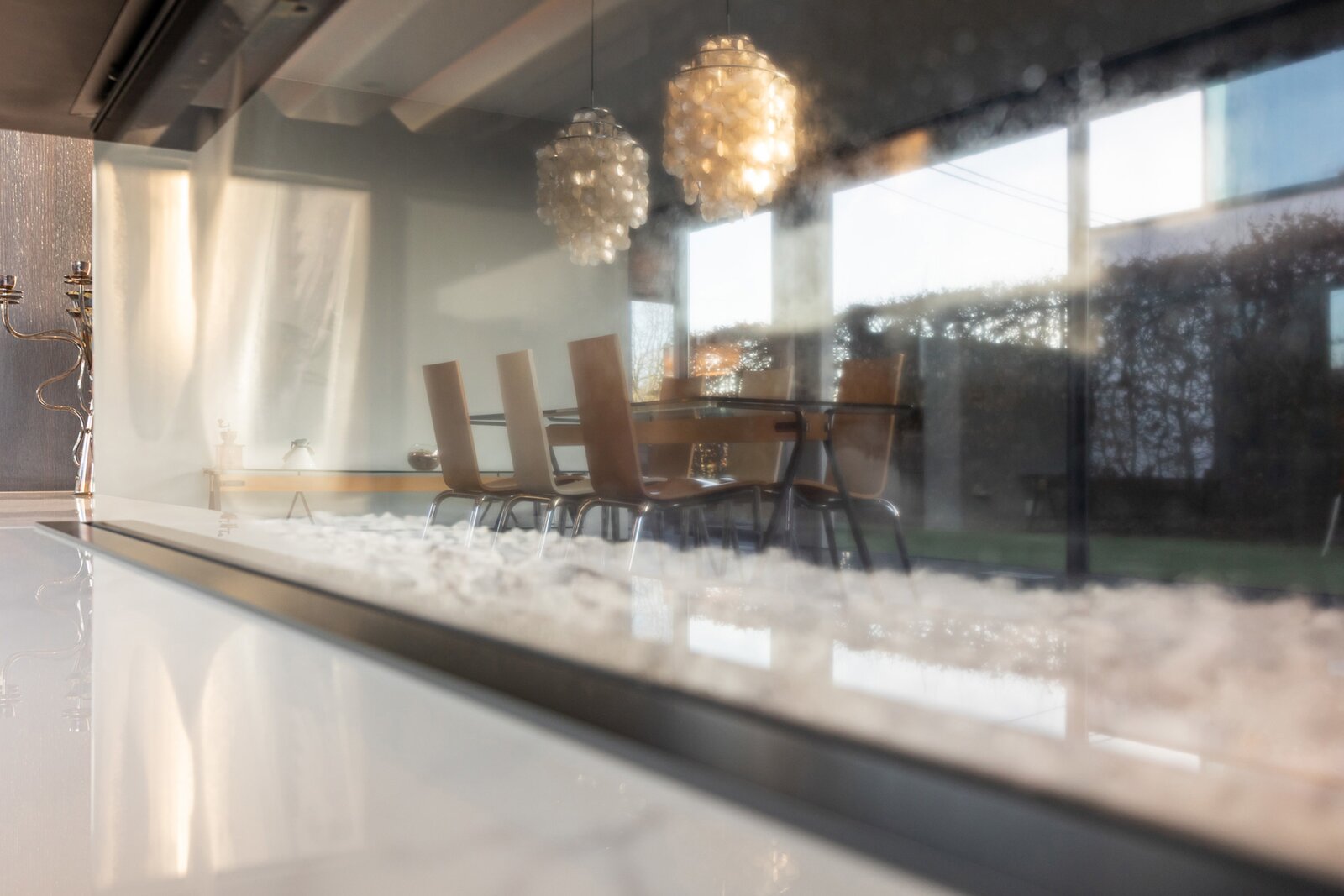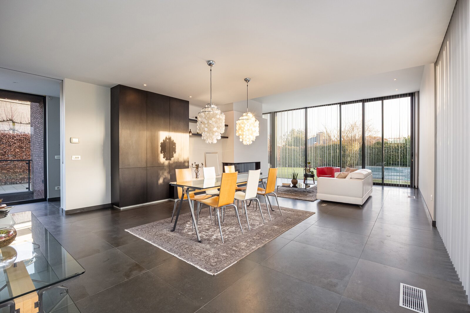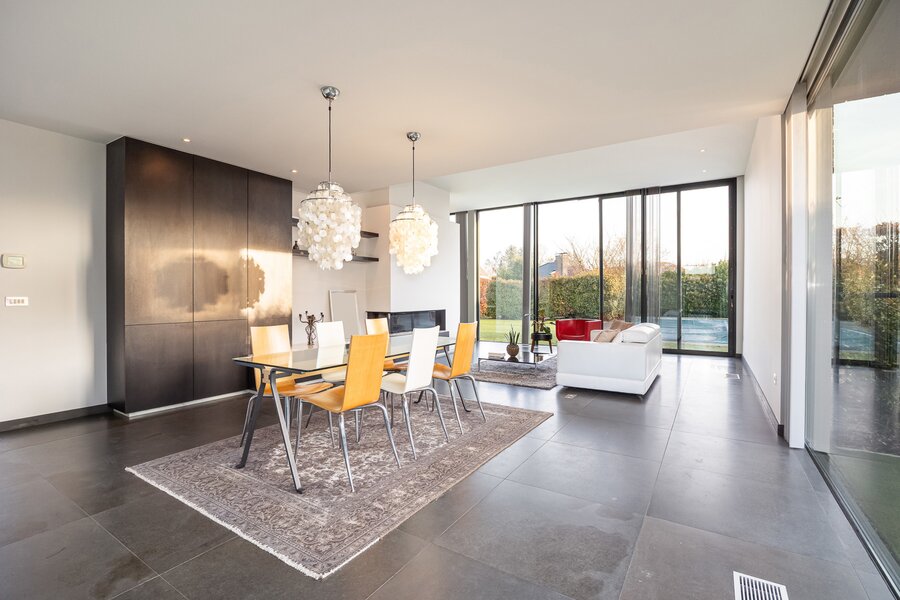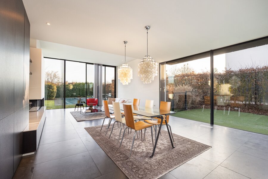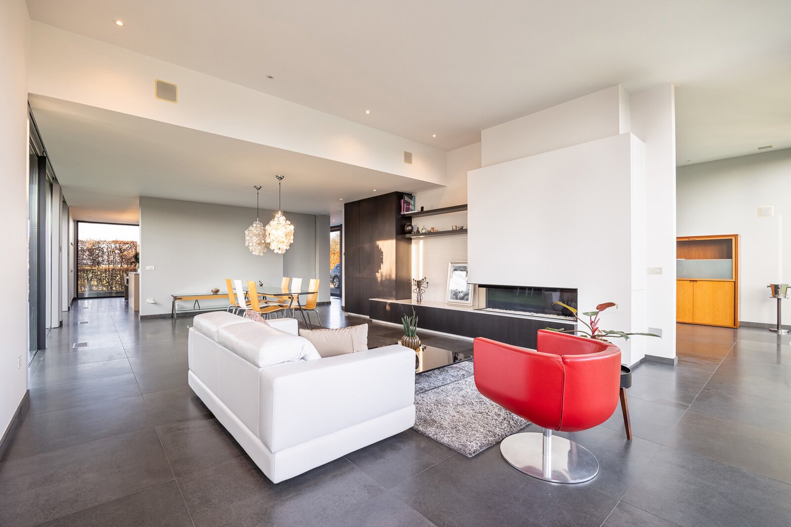 Langs de linkerzijde treffen we de grote leefruimte met plaats voor een eet-en zitgedeelte. De gashaard zorgt voor extra sfeer. Ook hier zorgen de vele grote ramen voor een open gevoel.