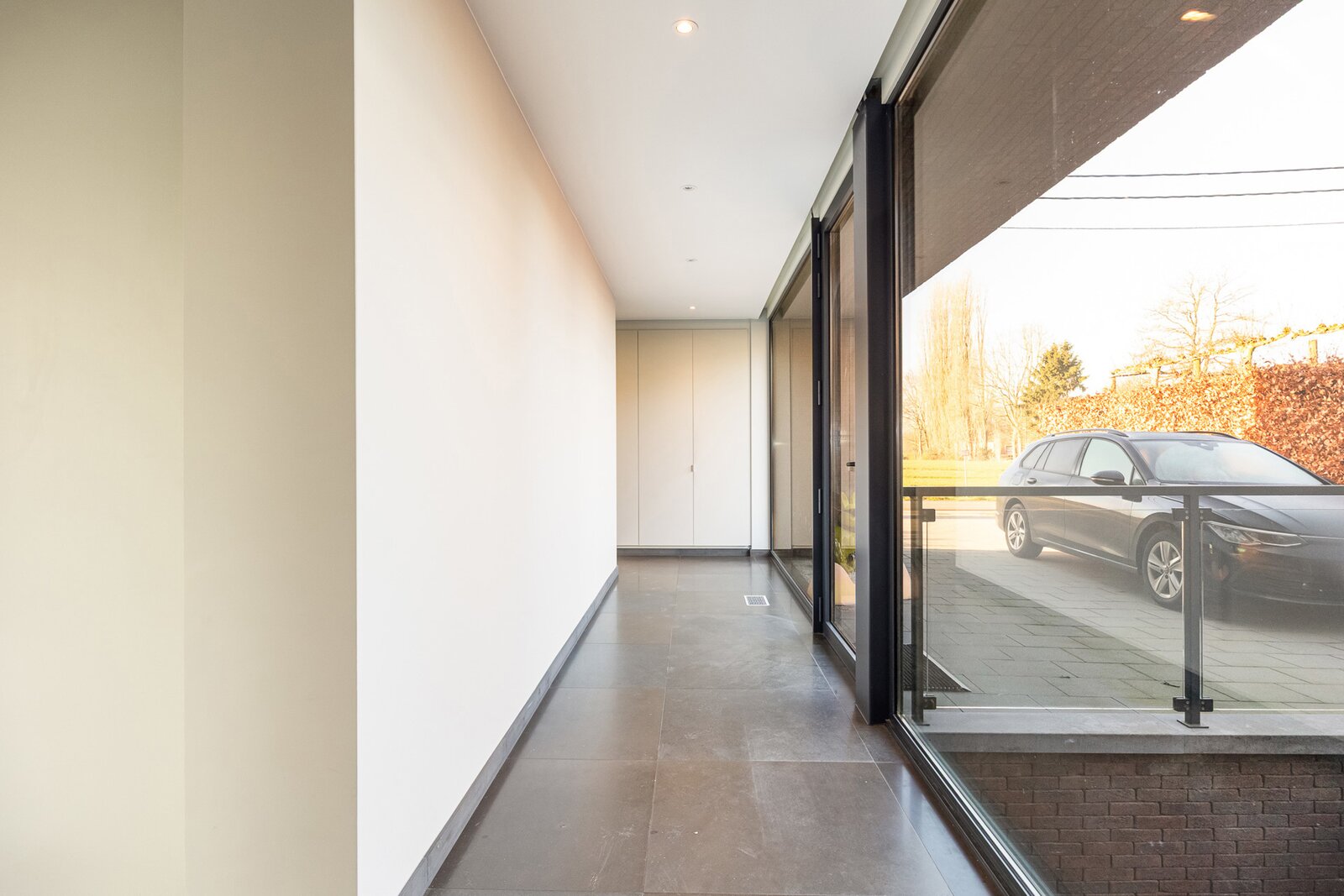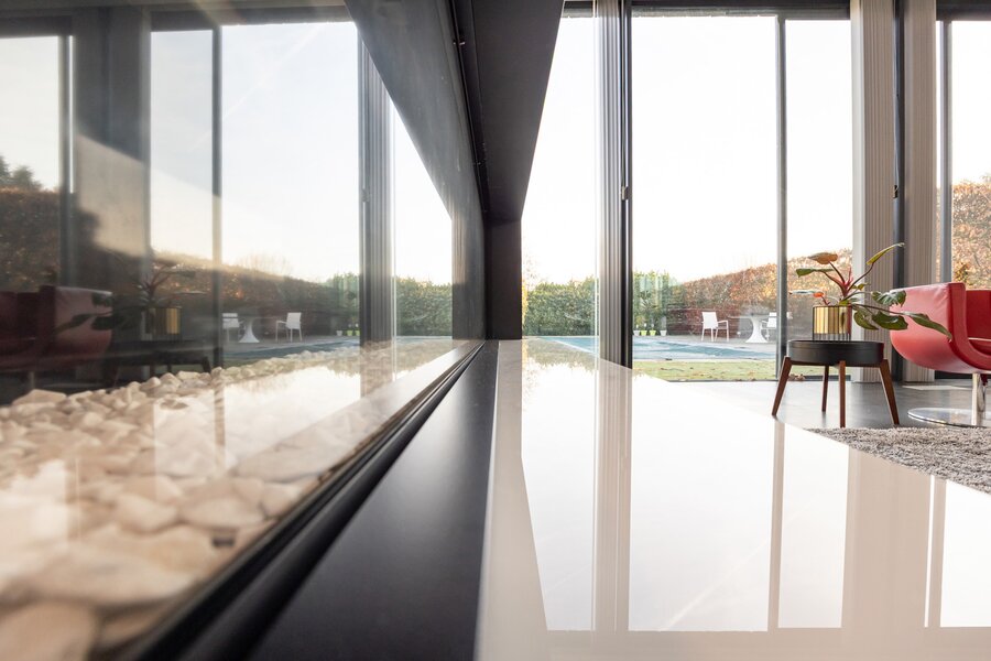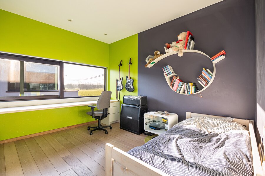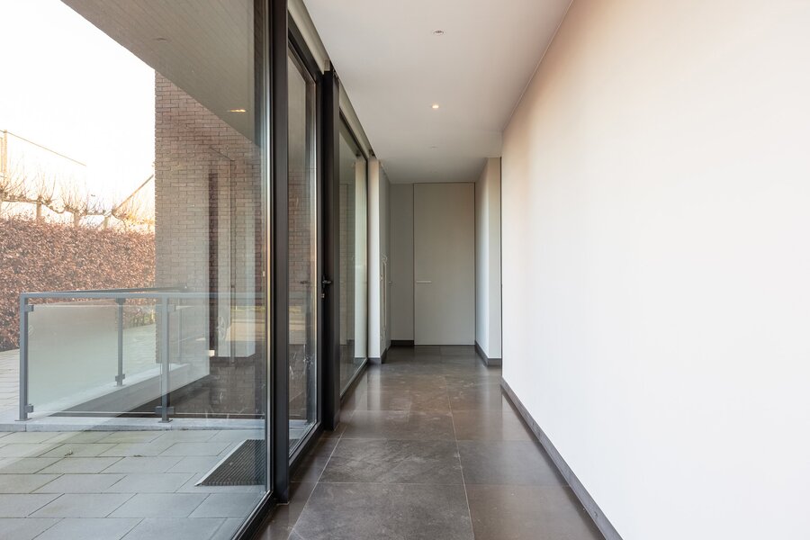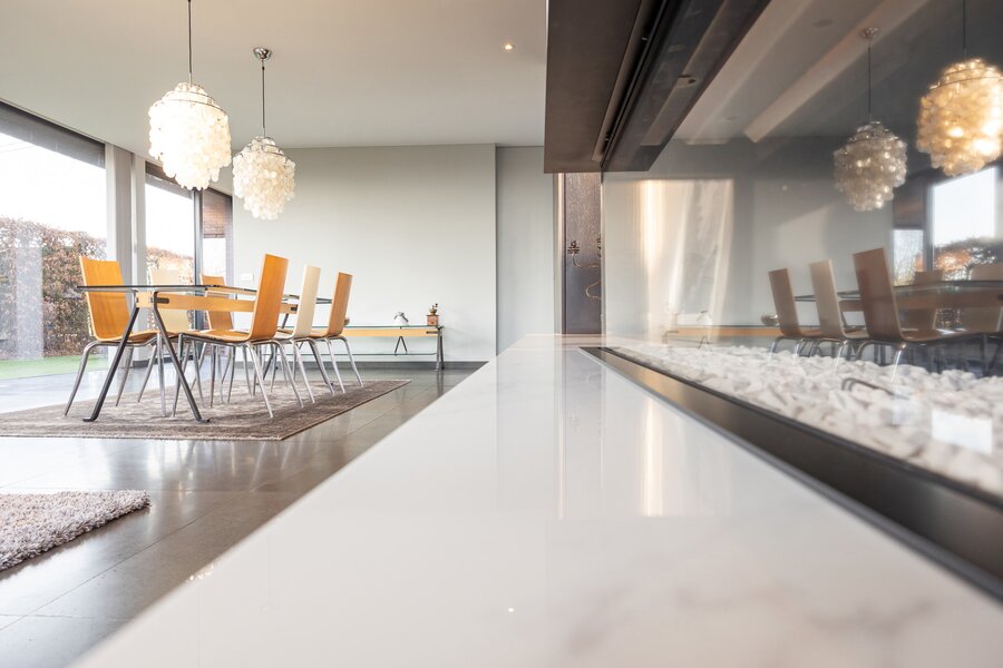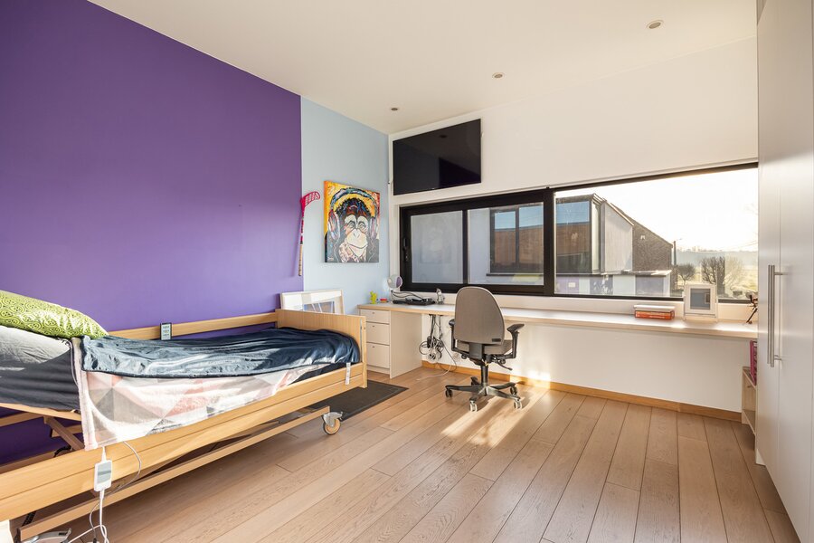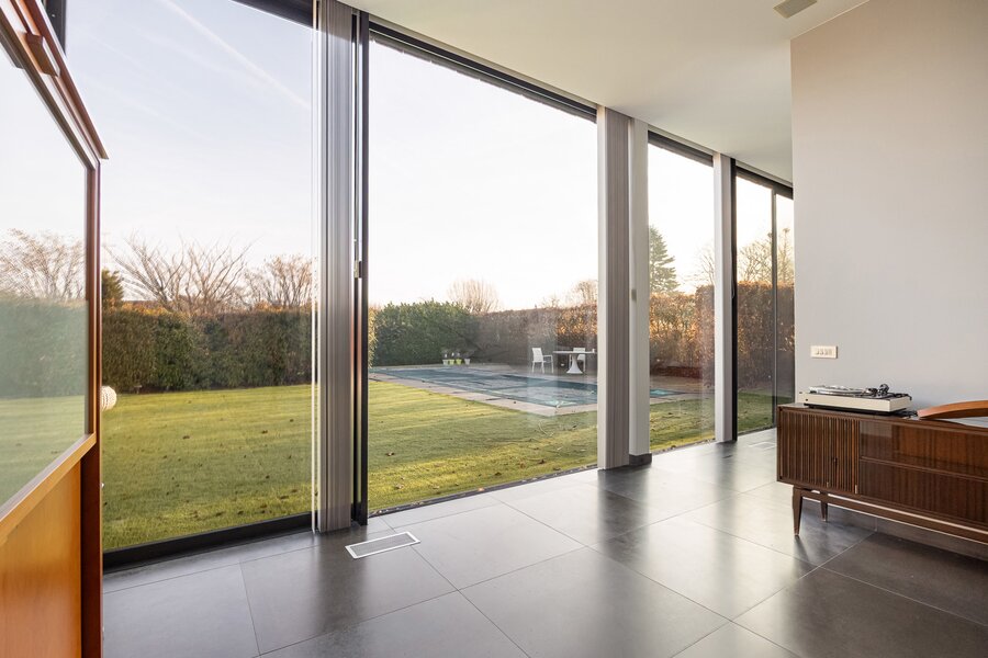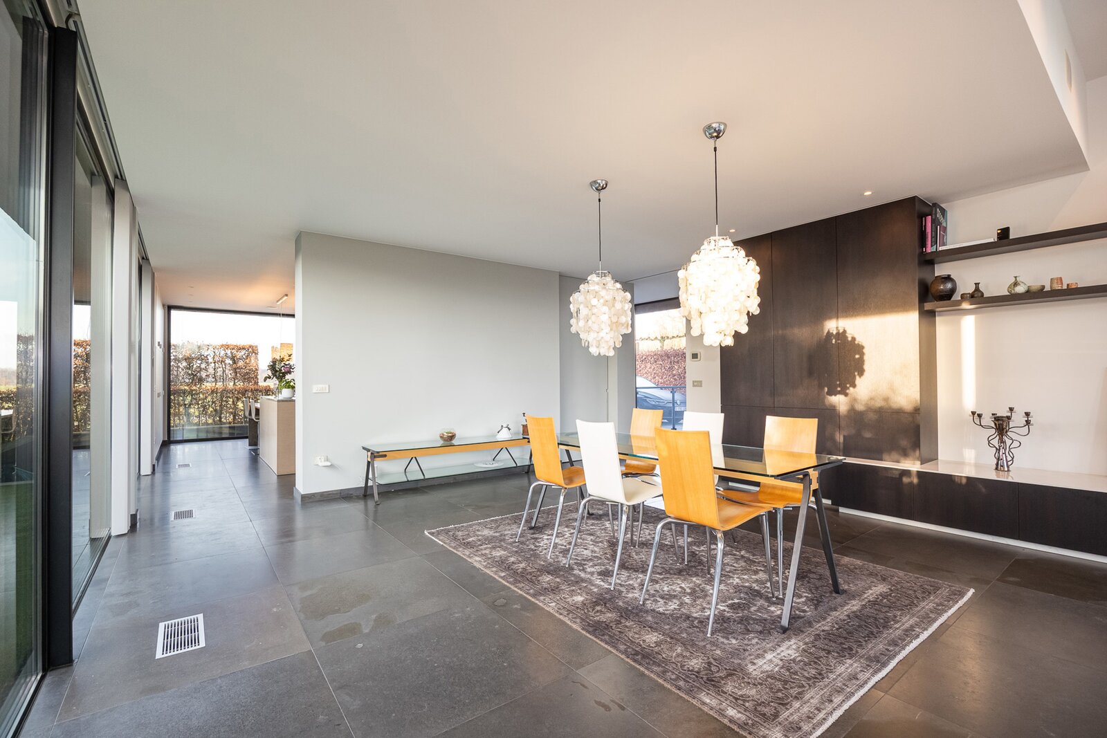 Langs de linkerzijde treffen we de grote leefruimte met plaats voor een eet-en zitgedeelte. De gashaard zorgt voor extra sfeer. Ook hier zorgen de vele grote ramen voor een open gevoel.
