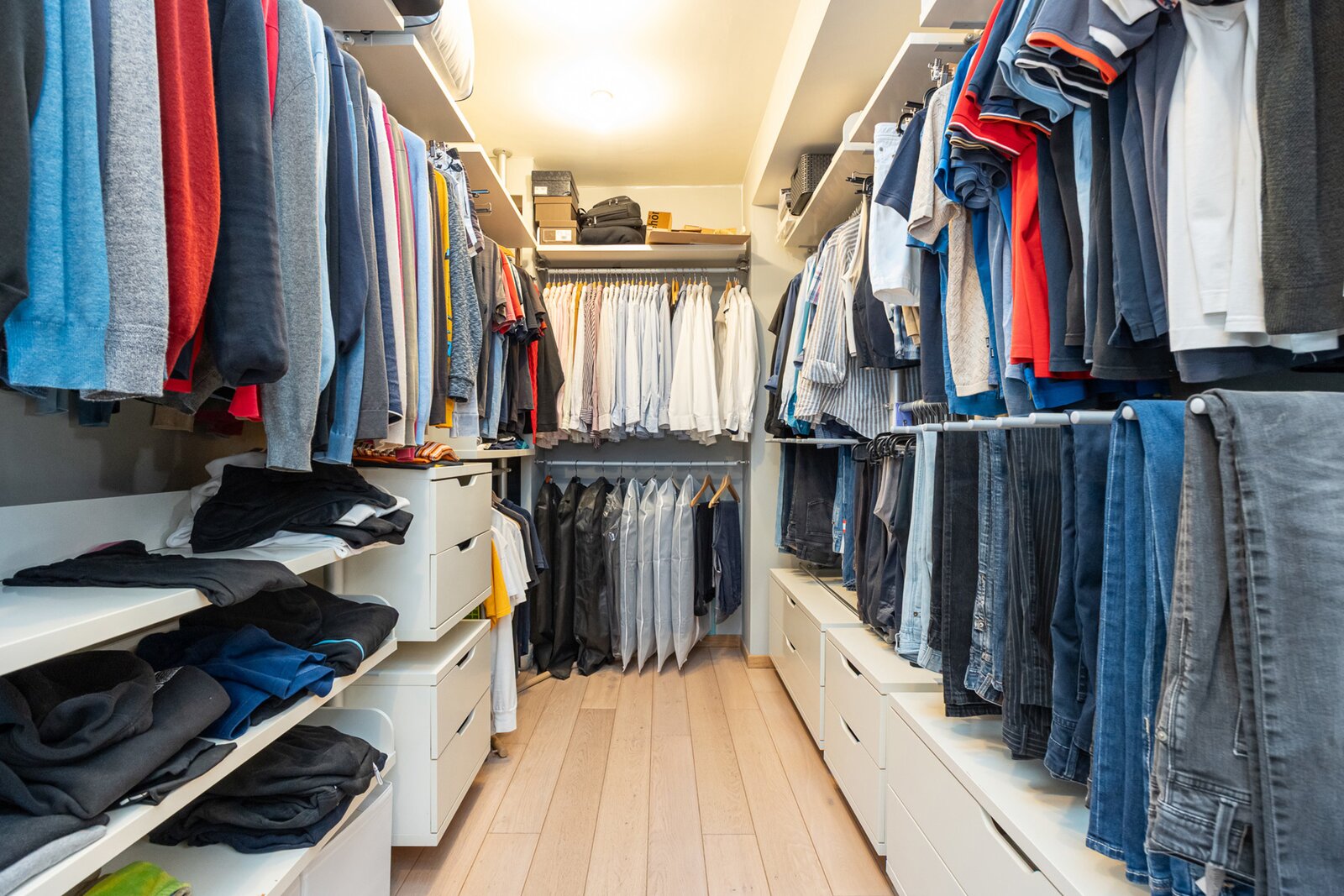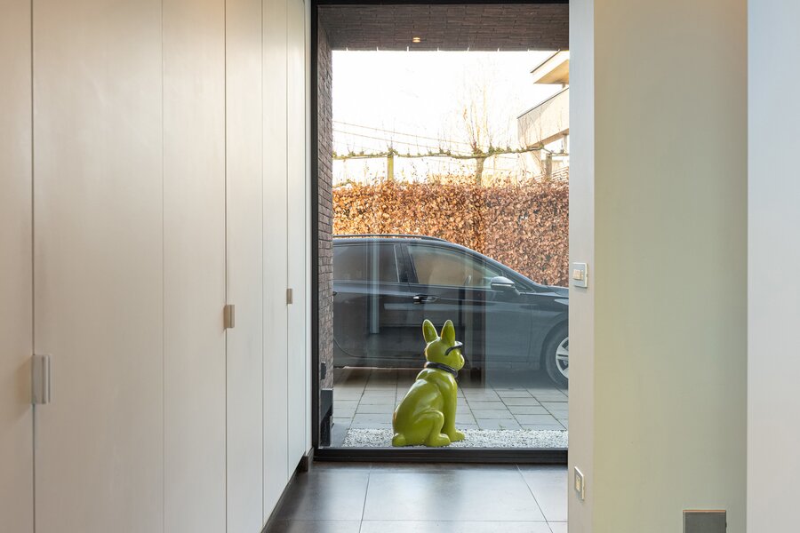 Je komt de woning binnen via een ruime inkomhal met heel wat ingemakte kasten, deze vormt de circulatiespil van het huis.